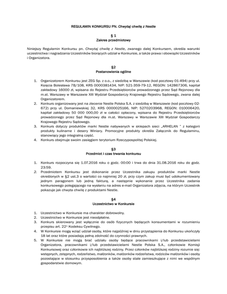 REGULAMIN KONKURSU PN. Chwytaj chwilę z Nestle §1 Zakres przedmiotowy Niniejszy Regulamin Konkursu pn. Chwytaj chwilę z Nestle, zwanego dalej Konkursem, określa warunki uczestnictwa i nagradzania Uczestników biorących udział w Konkursie, a także prawa i obowiązki Uczestników i Organizatora. §2 Postanowienia ogólne 1. Organizatorem Konkursu jest ZEG Sp. z o.o., z siedzibą w Warszawie (kod pocztowy 01-494) przy ul. Księcia Bolesława 7B/108, KRS 0000381434, NIP: 521-359-79-12, REGON: 142867306, kapitał zakładowy 16000 zł, wpisana do Rejestru Przedsiębiorców prowadzonego przez Sąd Rejonowy dla m.st. Warszawy w Warszawie XIII Wydział Gospodarczy Krajowego Rejestru Sądowego, zwana dalej Organizatorem. 2. Konkurs organizowany jest na zlecenie Nestle Polska S.A. z siedzibą w Warszawie (kod pocztowy 02672) przy ul. Domaniewskiej 32, KRS 0000025166, NIP: 5270203968, REGON: 010006420, kapitał zakładowy 50 000 000,00 zł w całości opłacony, wpisana do Rejestru Przedsiębiorców prowadzonego przez Sąd Rejonowy dla m.st. Warszawy w Warszawie XIII Wydział Gospodarczy Krajowego Rejestru Sądowego. 3. Konkurs dotyczy produktów marki Nestle nabywanych w sklepach sieci „ARHELAN ” z kategorii produkty kulinarne i desery Winiary. Promocyjne produkty określa Załącznik do Regulaminu, stanowiący jego integralną część. 4. Konkurs obejmuje swoim zasięgiem terytorium Rzeczypospolitej Polskiej. §3 Przedmiot i czas trwania konkursu 1. Konkurs rozpoczyna się 1.07.2016 roku o godz. 00:00 i trwa do dnia 31.08.2016 roku do godz. 23:59. 2. Przedmiotem Konkursu jest dokonanie przez Uczestnika zakupu produktów marki Nestle określonych w §2 ust.3 o wartości co najmniej 20 zł, przy czym zakup musi być udokumentowany jednym paragonem lub jedną fakturą, a następnie wykonanie przez Uczestnika zadania konkursowego polegającego na wysłaniu na adres e-mail Organizatora zdjęcia, na którym Uczestnik pokazuje jak chwyta chwilę z produktami Nestle. §4 Uczestnictwo w Konkursie 1. Uczestnictwo w Konkursie ma charakter dobrowolny. 2. Uczestnictwo w Konkursie jest nieodpłatne. 3. Konkurs skierowany jest wyłącznie do osób fizycznych będących konsumentami w rozumieniu przepisu art. 221 Kodeksu Cywilnego. 4. W Konkursie mogą wziąć udział osoby, które najpóźniej w dniu przystąpienia do Konkursu ukończyły 18 lat oraz które posiadają pełną zdolność do czynności prawnych. 5. W Konkursie nie mogą brać udziału osoby będące pracownikami i/lub przedstawicielami Organizatora, pracownikami i/lub przedstawicielami Nestle Polska S.A., członkowie Komisji Konkursowej oraz członkowie ich najbliższej rodziny. Przez członków najbliższej rodziny rozumie się: wstępnych, zstępnych, rodzeństwo, małżonków, małżonków rodzeństwa, rodziców małżonków i osoby pozostające w stosunku przysposobienia a także osoby stale zamieszkujące z nimi we wspólnym gospodarstwie domowym. Ograniczenie, o którym mowa w ustępie poprzednim odnosi się również do pracowników i/lub przedstawicieli Spółka Arhelan Burzyńscy sp.j. z siedzibą w Bielsk Podlaski, przy ul. Piłsudskiego 43 wpisanej do rejestru Przedsiębiorców Krajowego Rejestru Sądowego prowadzonego przez Sąd Rejonowy w Białymstoku, XII Wydział Gospodarczy Krajowego Rejestru Sądowego, pod numerem KRS 0000007651, NIP 543-000-14-47, REGON 0500 21109, posiadająca kapitał zakładowy w wysokości 50.000 złotych §5 Zasady udziału w Konkursie 1. W Konkursie mogą wziąć udział Uczestnicy, którzy spełnili wszystkie warunki wskazane poniżej: 1) dokonali w okresie trwania Konkursu i przed datą dokonania zgłoszenia jednorazowo zakupu produktów wskazanych w §3 ust. 2 w dowolnym sklepie sieci „ ARHELAN”, 2) w okresie trwania Konkursu dokonają zgłoszenia poprzez wysłanie na adres e-mail Organizatora [email protected]ęcia, o którym mowa w §3 ust. 2, 3) posiadają oryginał paragonu lub fakturę VAT dokumentujące dokonanie zakupu, o którym mowa w pkt. 1 i w ramach zgłoszenia prześlą skan lub zdjęcie całkowicie czytelnego paragonu/faktury VAT potwierdzającego dokonanie zakupu. 2. Aby wziąć udział w Konkursie należy wykonać zadanie konkursowe, o którym mowa w §3 ust. 2 niniejszego Regulaminu. 3. Przystępując do Konkursu Uczestnik oświadcza jednocześnie, że wyraża zgodę na publikację jego wizerunku, zaś w sytuacji, w której na zdjęciu znajdują się wizerunki innych osób, Uczestnik oświadcza, że każda z osób przedstawiona na zdjęciu wyraziła zgodę na publikację jej wizerunku. Wyłączona jest odpowiedzialność Organizatora za przesłanie przez Uczestnika zdjęcia bez uprzedniego uzyskania zezwolenia osoby na nim przedstawionej. 4. Dopuszcza się możliwość, aby jeden Uczestnik dokonał więcej niż jednego zgłoszenia w czasie trwania Konkursu. Wyłączone jest jednak dokonanie więcej niż jednego zgłoszenia na podstawie tego samego paragonu/ faktury VAT. W przypadku Laureata, który dokonuje kolejnego zgłoszenia, Laureat wraz z kolejnym zgłoszeniem zobowiązany jest przesłać skan lub zdjęcie innego paragonu/faktury VAT niż zgłoszenia dokonane przez niego poprzednio. 5. Niespełnienie przez Uczestnika choćby jednego z warunków wskazanych powyżej skutkuje brakiem możliwości wzięcia udziału w Konkursie. §6 Nagrody 1. Komisja Konkursowa wybiera Laureatów, którym przyznane zostaną nagrody. 2. W Konkursie przewidziane są następujące rodzaje nagród: 1) nagroda I stopnia w postaci rekreacyjnego roweru górskiego LEVEL R1 o wartości jednostkowej brutto 1968 zł zł oraz dodatkowa nagroda pieniężna w wysokości 219 zł. Łączna wartość nagrody wynosi 2187 zł, 2) nagroda II stopnia w postaci aparatu fotograficznego Fujifilm Instax Mini 8 w wybranym kolorze wraz z wkładem COLORFILM INSTAX MINI GLOSSY(10X1/PK )o wartości jednostkowej brutto 391,14 zł oraz dodatkowa nagroda pieniężna w wysokości 44 zł. Łączna wartość nagrody wynos