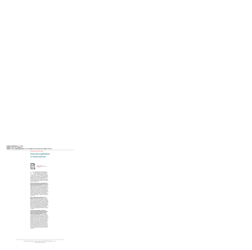 zródło: Puls Biznesu | 7.12.2015 rubryka: Puls Firmy | Strona: 10 nakład: 15293 | rozpowszechniono: 14115 | Temat: Prawo spółek-Prasa | AVE: 2 302 PLN KOMENTARZ PRAWNIKA Pożyczki wspólników w nowej ustawie DAWID MIELCARSKI adwokat w KSP Legal and Tax Advice w Katowicach O d 1 stycznia 2016 r. wchodzi w życie istotna zmiana przepisów regulujących kwestie upadłości oraz postępowania naprawczego. Dotychczasowa ustawa z 28 lutego 2003 r. — Prawo upadłościowe i naprawcze, zmieni nazwę na ustawę — Prawo upadłościowe (regulować będzie upadłość obejmującą likwidację podmiotu), oraz zacznie obowiązywać całkiem nowy akt prawny: ustawa z 15 maja 2015 r. — Prawo restrukturyzacyjne, która zawierać będzie przepisy dotyczące postępowania układowego oraz naprawczego (w nowej formie). Zmienione regulacje dotyczyć będą między innymi sposobu traktowania pożyczek wspólników (oraz akcjonariuszy) udzielonych upadłemu. W myśl obowiązujących regulacji zawartych w art. 14 § 3 Kodeksu spółek handlowych wierzytelność wspólnika albo akcjonariusza z tytułu pożyczki udzielonej spółce kapitałowej uważa się za jego wkład do spółki w przypadku ogłoszenia jej upadłości w terminie dwóch lat od dnia zawarcia umowy pożyczki. Regulacja ta powoduje, że w określonych sytuacjach (ogłoszenie upadłości spółki w terminie 2 lat od zawarcia umowy pożyczki) rzeczywisty wkład wspólnika (akcjonariusza) do spółki będzie wyższy, niż wynikałoby to z umowy spółki (statutu) — właśnie o kwotę udzielonej pożyczki. Wraz z 1 stycznia 2016 r. wskazany art. 14 § 3 Kodeksu spółek handlowych traci moc. Od tej daty (zgodnie z art. 342 ust. 1 pkt 4 nowego Prawa upadłościowego) należności wspólników albo akcjonariuszy z tytułu pożyczki dokonanej na rzecz upadłego będącego spółką kapitałową w okresie 5 lat przed ogłoszeniem upadłości (wraz z odsetkami) będą mogły być przedmiotem zgłoszenia do masy upadłości spółki. Jednak pozycja wspólników (akcjonariuszy) związana z dochodzeniem kwoty objętych udzieloną pożyczką od upadłej spółki jest o tyle niekorzystna, że ich wierzytelności podlegają zaspokojeniu z funduszów masy upadłości w czwartej — ostatniej — kategorii. Pewną szansą dla wspólników (udziałowców) w poprawieniu swojej pozycji jako wierzycieli masy upadłości z tytułu pożyczek udzielonych upadłej spółce jest ustanowienie zabezpieczeń rzeczowych dla udzielonych pożyczek (czyli np. hipoteki lub zastawu). Zgodnie bowiem z art. 336 nowego Prawa upadłościowego sumy uzyskane z likwidacji przedmiotu zabezpieczenia podlegają w pierwszej kolejności na zaspokojeniu wierzycieli posiadających zabezpieczenie rzeczowe. Przy czym nowe prawo upadłościowe nie zawiera regulacji wyłączających stosowanie pierwszeństwa zaspokojenia wierzycieli zabezpieczonych rzeczowo w sytuacji, gdy wierzycielami tymi są wspólnicy (akcjonariusze) spółki. Wspólnicy powinni jednak mieć na uwadze, że wobec masy upadłości skuteczne są tylko takie zabezpieczenia udzielonych przez nich pożyczek, które nie prowadzą (nawet hipotetycznie) do pokrzywdzenia wierzycieli upadłego (czyli nie są czynnościami, które mogą zostać uznane za bezskuteczne wobec upadłego). © Ⓟ Wycinek elektroniczny opracowała firma NEWTON Media sp. z o.o. www.newtonmedia.pl