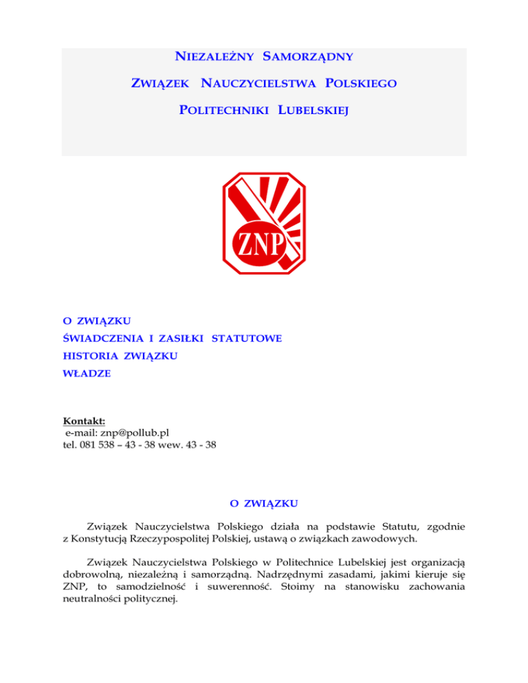 NIEZALEŻNY SAMORZĄDNY ZWIĄZEK NAUCZYCIELSTWA POLSKIEGO POLITECHNIKI LUBELSKIEJ O ZWIĄZKU ŚWIADCZENIA I ZASIŁKI STATUTOWE HISTORIA ZWIĄZKU WŁADZE Kontakt: e-mail: [email protected] tel. 081 538 – 43 - 38 wew. 43 - 38 O ZWIĄZKU Związek Nauczycielstwa Polskiego działa na podstawie Statutu, zgodnie z Konstytucją Rzeczypospolitej Polskiej, ustawą o związkach zawodowych. Związek Nauczycielstwa Polskiego w Politechnice Lubelskiej jest organizacją dobrowolną, niezależną i samorządną. Nadrzędnymi zasadami, jakimi kieruje się ZNP, to samodzielność i suwerenność. Stoimy na stanowisku zachowania neutralności politycznej. Celem związku jest obrona praw, godności i interesów pracowników Politechniki Lubelskiej, w tym: • • • obrona interesów zawodowych, materialnych i socjalno - bytowych pracowników oraz ich rodzin;. inicjowanie i popieranie działań na rzecz stwarzania pracownikom warunków do podnoszenia kwalifikacji zawodowych; działania na rzecz właściwego, zgodnego z poczuciem sprawiedliwości podziału środków finansowych ZFŚS PL dla wszystkich grup pracowniczych. Zadania stojące przed związkiem realizujemy poprzez: • • • • opiniowanie lub uzgadnianie postanowień, zarządzeń i innych aktów prawnych Władz Uczelni dotyczących kluczowych spraw pracowniczych; współpracę z innymi związkami działającymi na terenie Uczelni; organizowanie wyborów i nadzorowanie działalności społecznych inspektorów pracy; inicjatywy wobec Władz Uczelni w istotnych sprawach zgłaszanych przez członków związku i niezrzeszonych pracowników Uczelni. Zgodnie ze Statutu Związku - członkom wypłacane są poniższe świadczenia statutowe. ŚWIADCZENIA I ZASIŁKI STATUTOWE z funduszu NS ZNP Politechniki Lubelskiej w 2008/2009 roku przyjęte na zebraniu sprawozdawczym Związku w dniu 26 czerwca 2008 r. I. ZAPOMOGI STATUTOWE (udokumentowane) • z tytułu urodzenia dziecka: 500,00 zł II. ZAPOMOGI LOSOWE (udokumentowane) • z tytułu zgonu członka związku: 500,00 zł, • z tytułu zgonu członka rodziny: 250,00 zł, • z tytułu długotrwałej choroby, pożaru, powodzi, kradzieży i innych: do 300,00 zł, III. Dofinansowanie do działalności kulturalnej raz/rok: 190,00 zł. Wymienione świadczenia i zasiłki przyznawane są po rocznym nieprzerwanym stażu związkowym. HISTORIA ZWIĄZKU Działalność Związku Nauczycielstwa Polskiego w Politechnice Lubelskiej rozpoczyna się wraz z powstaniem oddziału Uczelnianego Związku Nauczycielstwa Polskiego w Wieczorowej Szkole Inżynierskiej 15 grudnia 19962 r. Pierwszym Prezesem Zarządu był Stanisław Dobrzycki, a wiceprezesem Tadeusz Rosiński. Dnia 1 czerwca 1965 Wieczorową Szkołę Inżynierską przekształcono w Wyższą Szkołę Inżynierską, w miejsce Zarządu Oddziału powstała Rada Zakładowa ZNP. W dniu 17 grudnia 1982 r. odbyło się zebranie Komitetu Założycielskiego Związku Zawodowego pracowników Politechniki Lubelskiej, któremu przewodniczył doc. Wacław Jaśkiewicz. Na zebraniu tym postanowiono, by związek zawodowy nosił nazwę Niezależny Samorządny Związek Nauczycielstwa Polskiego Pracowników Politechniki Lubelskiej. WŁADZE Zgodnie ze Statutem NS ZNP Politechniki Lubelskiej władze wybrane na zebraniu sprawozdawczo-wyborczym w dniu 26 czerwca 2008 r. ukonstytuowały się w następującym składzie: Prezydium Zarządu Związku: Dr inż. Krzysztof NALEWAJ Dr inż. Jolanta SŁOMA Dr inż. Jarosław ZUBRZYCKI Mgr Anna MUROŃ Mgr inż. Grażyna BORECKA Dr inż. Gabriel SZYMANIAK - Prezes Zarządu - Wiceprezes Zarządu - Sekretarz Zarządu - Skarbnik Zarządu - Członek Zarządu - Członek Zarządu Komisja Rewizyjna P. Danuta MACHOWICZ Mgr Ewa KRZYSIAK Mgr Ewa WÓJCIK Sąd Koleżeński P. Anna CIEKOT Mgr inż. Irena JAKONIUK Mgr Marzena SACZUK W skład Zarządu Związku weszli również przewodniczący Rad Oddziałowych: ∗ Wydział Mechaniczny - dr inż. Jarosław Zubrzycki ∗ Wydział Elektrotechniki i Informatyki - P. Danuta Frąckiewicz ∗ Wydział Inżynierii Budowlanej i Sanitarnej i Wydział Inżynierii Środowiska - dr inż. Jolanta Słoma ∗ Wydział Zarządzania i Wydział Podstaw Techniki – dr inż. Wacław Szymonik ∗ Jednostki Międzywydziałowe - mgr Longina Stachowicz ∗ Administracja Centralna - mgr Anna Muroń Grupa emerytów i rencistów działa w ramach Koła Emerytów i Rencistów NS ZNP Politechniki Lubelskiej a jej przewodniczącym jest dr inż. Ryszard Banaszak. Zgodnie ze Statutem NS ZNP Prezydium Zarządu powołało następujące komisje związkowe: 1. Komisja Socjalno-Bytowa ∗ Mgr Anna MUROŃ ∗ P. Anna CIEKOT ∗ Mgr inż. Irena JAKONIUK ∗ Inż. Jolanta RYCZEK 2. Komisja Kulturalno-Oświatowa ∗ P. Danuta FRĄCKIEWICZ ∗ Mgr Iwona CZAJKOWSKA-DENEKA ∗ P. Bogdan BOGUTA ∗ Mgr Piotr SOKÓŁ Zarząd Związku desygnował Prezesa Zarządu dr inż. Krzysztofa Nalewaja do reprezentowania interesów Związku w pracach Senatu Politechniki Lubelskiej w kadencji 2008-2012 i a swoich przedstawicieli do prac w radach wydziałów. W obecnej kadencji następujący przedstawiciele Związku pracują w komisjach: 1. Komisja ds. Organizacji i Rozwoju Politechniki Dr inż. Krzysztof NALEWAJ 2. Komisja ds. Badań Naukowych Dr inż. Jarosław ZUBRZYCKI 3. Komisja ds. Kształcenia Mgr inż. Grażyna BORECKA 4. Komisja ds. Rozwoju Kadry Dr inż. Gabriel SZYMANIAK 5. Komisja ds. Budżetu i Finansów Mgr Anna MUROŃ 6. Komisja ds. Nagród i Odznaczeń Dr inż. Jolanta SŁOMA