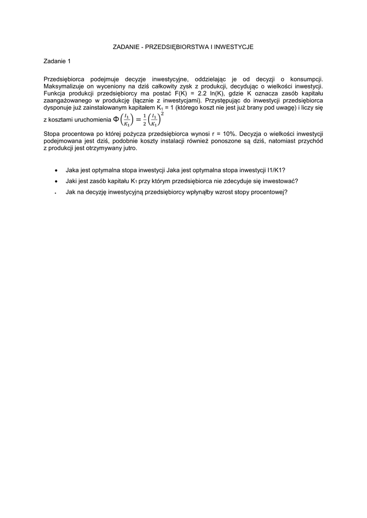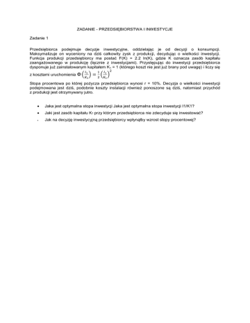 ZADANIE - PRZEDSIĘBIORSTWA I INWESTYCJE Zadanie 1 Przedsiębiorca podejmuje decyzje inwestycyjne, oddzielając je od decyzji o konsumpcji. Maksymalizuje on wyceniony na dziś całkowity zysk z produkcji, decydując o wielkości inwestycji. Funkcja produkcji przedsiębiorcy ma postać F(K) = 2.2 ln(K), gdzie K oznacza zasób kapitału zaangażowanego w produkcję (łącznie z inwestycjami). Przystępując do inwestycji przedsiębiorca dysponuje już zainstalowanym kapitałem K1 = 1 (którego koszt nie jest już brany pod uwagę) i liczy się z kosztami uruchomienia Stopa procentowa po której pożycza przedsiębiorca wynosi r = 10%. Decyzja o wielkości inwestycji podejmowana jest dziś, podobnie koszty instalacji również ponoszone są dziś, natomiast przychód z produkcji jest otrzymywany jutro. Jaka jest optymalna stopa inwestycji Jaka jest optymalna stopa inwestycji I1/K1? Jaki jest zasób kapitału K1 przy którym przedsiębiorca nie zdecyduje się inwestować? Jak na decyzję inwestycyjną przedsiębiorcy wpłynąłby wzrost stopy procentowej?