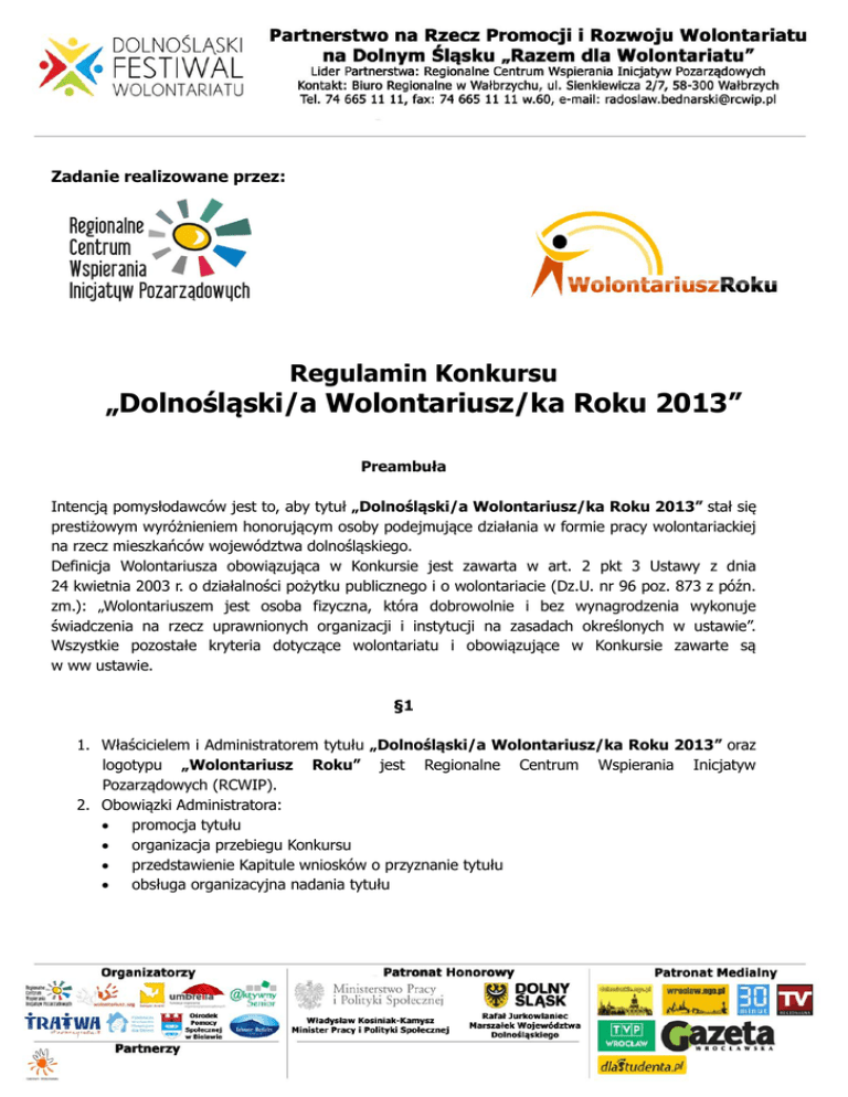 Zadanie realizowane przez: Regulamin Konkursu „Dolnośląski/a Wolontariusz/ka Roku 2013” Preambuła Intencją pomysłodawców jest to, aby tytuł „Dolnośląski/a Wolontariusz/ka Roku 2013” stał się prestiżowym wyróżnieniem honorującym osoby podejmujące działania w formie pracy wolontariackiej na rzecz mieszkańców województwa dolnośląskiego. Definicja Wolontariusza obowiązująca w Konkursie jest zawarta w art. 2 pkt 3 Ustawy z dnia 24 kwietnia 2003 r. o działalności pożytku publicznego i o wolontariacie (Dz.U. nr 96 poz. 873 z późn. zm.): „Wolontariuszem jest osoba fizyczna, która dobrowolnie i bez wynagrodzenia wykonuje świadczenia na rzecz uprawnionych organizacji i instytucji na zasadach określonych w ustawie”. Wszystkie pozostałe kryteria dotyczące wolontariatu i obowiązujące w Konkursie zawarte są w ww ustawie. §1 1. Właścicielem i Administratorem tytułu „Dolnośląski/a Wolontariusz/ka Roku 2013” oraz logotypu „Wolontariusz Roku” jest Regionalne Centrum Wspierania Inicjatyw Pozarządowych (RCWIP). 2. Obowiązki Administratora: promocja tytułu organizacja przebiegu Konkursu przedstawienie Kapitule wniosków o przyznanie tytułu obsługa organizacyjna nadania tytułu §2 Tryb i warunki przyznawania tytułu 1. Do Konkursu można nominować w trzech kategoriach: - Kategoria 1: „Dolnośląski/a Wolontariusz/ka Roku 2013” W tej kategorii nominowana może być każda osoba współpracująca z daną organizacją/instytucją na zasadach wolontariatu określonych w ustawie o działalności pożytku publicznego i o wolontariacie. Miejsce zamieszkania nominowanego wolontariusza i/lub miejsce wykonywania świadczeń na rzecz organizacji/instytucji musi znajdować się na terenie województwa dolnośląskiego. - Kategoria 2: „Dolnośląski/a Koordynator/ka Roku 2013” W tej kategorii nominowana może być każda osoba zajmująca się współpracą z wolontariuszami. Miejsce zamieszkania nominowanego koordynatora i/lub miejsce działalności wolontariuszy zarządzanych przez nominowanego koordynatora musi znajdować się na terenie województwa dolnośląskiego. - Kategoria 3: „Dolnośląska Grupa Wolontariacka Roku 2013” W tej kategorii nominowana może być każda grupa wolontariuszy działająca w sposób zorganizowany współpracująca z organizacjami/instytucjami lub realizująca własne inicjatywy na rzecz dobra wspólnego. Obszar działania nominowanej grupy musi znajdować się na terenie województwa dolnośląskiego. 2. Wniosek o przyznanie tytułu w kategorii: - „Dolnośląski/a Wolontariusz/ka Roku 2013” składają: Organizacje pozarządowe i podmioty wymienione w art. 3 ust. 3 ww ustawy, Organy administracji publicznej, Jednostki podległe lub nadzorowane przez organy administracji publicznej, Przedsiębiorstwa, w których działa program wolontariatu pracowniczego, Osoby indywidualne korzystające z pomocy wolontariuszy. - „Dolnośląski/a Koordynator/ka Roku 2013” składają: Wolontariusze współpracujący z organizacjami pozarządowymi i podmiotami wymienionymi w art. 3 ust. 3 ww ustawy, organami administracji publicznej, jednostkami podległymi lub nadzorowanymi przez organy administracji publicznej oraz przedsiębiorstwami, w których działa program wolontariatu pracowniczego. - „Dolnośląska Grupa Wolontariacka Roku 2013” składają: Organizacje pozarządowe i podmioty wymienione w art. 3 ust. 3 ww ustawy, Organy administracji publicznej, Jednostki podległe lub nadzorowane przez organy administracji publicznej, Przedsiębiorstwa, w których działa program wolontariatu pracowniczego, Osoby indywidualne korzystające z pomocy wolontariuszy. 3. Wniosek nominacyjny należy przygotować w specjalnym Generatorze Wniosków Nominacyjnych dla każdej nominowanej osoby/grupy w każdej kategorii oddzielnie. Link do formularza A – Wolontariusz: http://wolontariusz.rcwip.pl/wolontariusz/wolontariusz.php Link do formularza B – Grupa: http://wolontariusz.rcwip.pl/grupa/grupa.php Link do formularza C – Koordynator: http://wolontariusz.rcwip.pl/koordynator/koordynator.php Instrukcja wypełniania Generatora znajduje się na końcu niniejszego Regulaminu. 4. Po wypełnieniu w Generatorze Wniosek należy zapisać w formie pliku PDF, wydrukować, podpisać w miejscach do tego przeznaczonych i wraz z załącznikami odesłać na adres pocztowy Organizatora Konkursu: Regionalne Centrum Wspierania Inicjatyw Pozarządowych, Biuro Regionalne w Wałbrzychu, ul. Sienkiewicza 2/7, 58-300 Wałbrzych. Dodatkowo wygenerowany plik PDF należy przesłać pocztą elektroniczną na adres [email protected]. 5. Do wniosku mogą zostać dołączone dodatkowe dokumenty uzasadniające nominację np. artykuły prasowe, rekomendacje, filmy, galerie zdjęć, prezentacje multimedialne itp. 6. W uzasadnionych przypadkach dopuszcza się wypełnienie wniosku nominacyjnego poza generatorem na specjalnym formularzu. W tym wypadku Wniosek należy wypełnić komputerowo, na maszynie lub ręcznie (czytelnie, drukowanymi literami). Wnioski nieczytelne będą odrzucane. Brak możliwości wypełnienia wniosku w generatorze i zamiar jego wypełnienia na formularzu musi być uprzednio zgłoszony i uzgodniony z organizatorem Konkursu. 7. Do wniosku obowiązkowo należy załączyć materiały multimedialne: co najmniej 5 zdjęć przedstawiających nominowanego wolontariusza/koordynatora/grupę oraz jego działalność, krótki materiał filmowy prezentujący działalność nominowanej osoby/grupy wg następujących wytycznych: - Materiał filmowy można przygotować dowolnym sprzętem audiowizualnym (aparat cyfrowy z możliwością zapisu VIDEO, kamera cyfrowa itp.) - Materiał filmowy należy przygotować w dobrej jakości obrazu i dźwięku umożliwiającej późniejszą obróbkę. - Treść materiału filmowego powinna dotyczyć bezpośrednio działalności nominowanej/go wolontariuszki/a. - Forma przedstawienia nominowanej/go na filmie jest dowolna