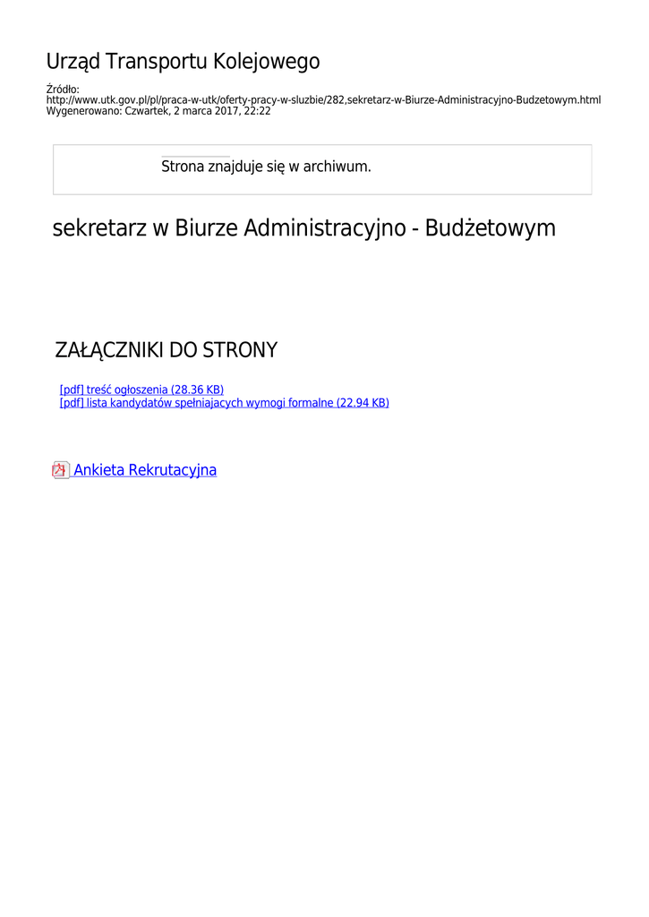 Urząd Transportu Kolejowego Źródło: http://www.utk.gov.pl/pl/praca-w-utk/oferty-pracy-w-sluzbie/282,sekretarz-w-Biurze-Administracyjno-Budzetowym.html Wygenerowano: Czwartek, 2 marca 2017, 22:22 Strona znajduje się w archiwum. sekretarz w Biurze Administracyjno - Budżetowym ZAŁĄCZNIKI DO STRONY [pdf] treść ogłoszenia (28.36 KB) [pdf] lista kandydatów spełniajacych wymogi formalne (22.94 KB) Ankieta Rekrutacyjna