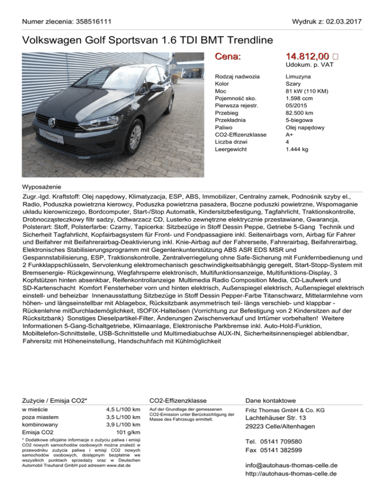 Numer zlecenia: 358516111 Wydruk z: 02.03.2017 Volkswagen Golf Sportsvan 1.6 TDI BMT Trendline Cena: 14.812,00 Rodzaj nadwozia Kolor Moc Pojemność sko. Pierwsza rejestr. Przebieg Przekładnia Paliwo CO2-Effizenzklasse Liczba drzwi Leergewicht Limuzyna Szary 81 kW (110 KM) 1.598 ccm 05/2015 82.500 km 5-biegowa Olej napędowy A+ 4 1.444 kg Udokum. p. VAT Wyposażenie Zugr.-lgd. Kraftstoff: Olej napędowy, Klimatyzacja, ESP, ABS, Immobilizer, Centralny zamek, Podnośnik szyby el., Radio, Poduszka powietrzna kierowcy, Poduszka powietrzna pasażera, Boczne poduszki powietrzne, Wspomaganie układu kierowniczego, Bordcomputer, Start-/Stop Automatik, Kindersitzbefestigung, Tagfahrlicht, Traktionskontrolle, Drobnocząsteczkowy filtr sadzy, Odtwarzacz CD, Lusterko zewnętrzne elektrycznie przestawiane, Gwarancja, Polsterart: Stoff, Polsterfarbe: Czarny, Tapicerka: Sitzbezüge in Stoff Dessin Peppe, Getriebe 5-Gang Technik und Sicherheit Tagfahrlicht, Kopfairbagsystem für Front- und Fondpassagiere inkl. Seitenairbags vorn, Airbag für Fahrer und Beifahrer mit Beifahrerairbag-Deaktivierung inkl. Knie-Airbag auf der Fahrerseite, Fahrerairbag, Beifahrerairbag, Elektronisches Stabilisierungsprogramm mit Gegenlenkunterstützung ABS ASR EDS MSR und Gespannstabilisierung, ESP, Traktionskontrolle, Zentralverriegelung ohne Safe-Sicherung mit Funkfernbedienung und 2 Funkklappschlüsseln, Servolenkung elektromechanisch geschwindigkeitsabhängig geregelt, Start-Stopp-System mit Bremsenergie- Rückgewinnung, Wegfahrsperre elektronisch, Multifunktionsanzeige, Multifunktions-Display, 3 Kopfstützen hinten absenkbar, Reifenkontrollanzeige Multimedia Radio Composition Media, CD-Laufwerk und SD-Kartenschacht Komfort Fensterheber vorn und hinten elektrisch, Außenspiegel elektrisch, Außenspiegel elektrisch einstell- und beheizbar Innenausstattung Sitzbezüge in Stoff Dessin Pepper-Farbe Titanschwarz, Mittelarmlehne vorn höhen- und längseinstellbar mit Ablagebox, Rücksitzbank asymmetrisch teil- längs verschieb- und klappbar Rückenlehne mitDurchlademöglichkeit, ISOFIX-Halteösen (Vorrichtung zur Befestigung von 2 Kindersitzen auf der Rücksitzbank) Sonstiges Dieselpartikel-Filter, Änderungen Zwischenverkauf und Irrtümer vorbehalten! Weitere Informationen 5-Gang-Schaltgetriebe, Klimaanlage, Elektronische Parkbremse inkl. Auto-Hold-Funktion, Mobiltelefon-Schnittstelle, USB-Schnittstelle und Multimediabuchse AUX-IN, Sicherheitsinnenspiegel abblendbar, Fahrersitz mit Höheneinstellung, Handschuhfach mit Kühlmöglichkeit Zużycie / Emisja CO2* w mieście poza miastem kombinowany Emisja CO2 4,5 L/100 km 3,5 L/100 km 3,9 L/100 km 101 g/km * Dodatkowe oficjalne informacje o zużyciu paliwa i emisji CO2 nowych samochodów osobowych można znaleźć w przewodniku zużycia paliwa i emisji CO2 nowych samochodów osobowych, dostępnym bezpłatnie we wszystkich punktach sprzedaży oraz w Deutschen Automobil Treuhand GmbH pod adresem www.dat.de CO2-Effizenzklasse Dane kontaktowe Auf der Grundlage der gemessenen CO2-Emission unter Berücksichtigung der Masse des Fahrzeugs ermittelt. Fritz Thomas GmbH & Co. KG Lachtehäuser Str. 13 29223 Celle/Altenhagen Tel. 05141 709580 Fax 05141 382599 [email protected] http://autohaus-thomas-celle.de Numer zlecenia: 358516111 Volkswagen Golf Sportsvan 1.6 TDI BMT Trendline Wydruk z: 02.03.2017 Numer zlecenia: 358516111 Volkswagen Golf Sportsvan 1.6 TDI BMT Trendline Wydruk z: 02.03.2017