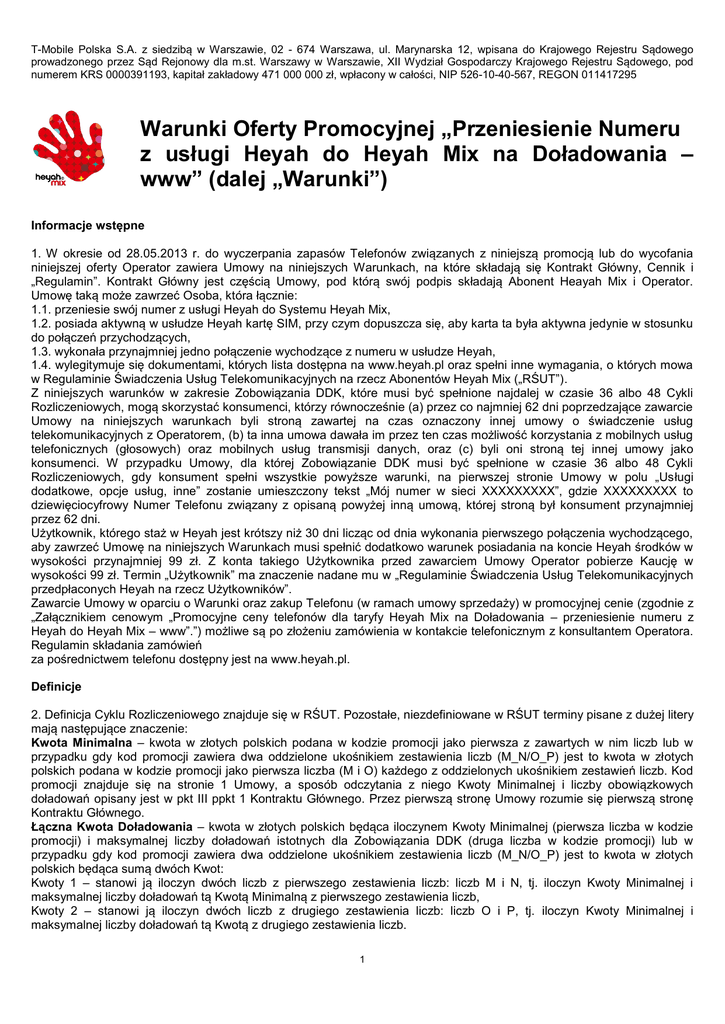 T-Mobile Polska S.A. z siedzibą w Warszawie, 02 - 674 Warszawa, ul. Marynarska 12, wpisana do Krajowego Rejestru Sądowego prowadzonego przez Sąd Rejonowy dla m.st. Warszawy w Warszawie, XII Wydział Gospodarczy Krajowego Rejestru Sądowego, pod numerem KRS 0000391193, kapitał zakładowy 471 000 000 zł, wpłacony w całości, NIP 526-10-40-567, REGON 011417295 Warunki Oferty Promocyjnej „Przeniesienie Numeru z usługi Heyah do Heyah Mix na Doładowania – www” (dalej „Warunki”) Informacje wstępne 1. W okresie od 28.05.2013 r. do wyczerpania zapasów Telefonów związanych z niniejszą promocją lub do wycofania niniejszej oferty Operator zawiera Umowy na niniejszych Warunkach, na które składają się Kontrakt Główny, Cennik i „Regulamin”. Kontrakt Główny jest częścią Umowy, pod którą swój podpis składają Abonent Heayah Mix i Operator. Umowę taką może zawrzeć Osoba, która łącznie: 1.1. przeniesie swój numer z usługi Heyah do Systemu Heyah Mix, 1.2. posiada aktywną w usłudze Heyah kartę SIM, przy czym dopuszcza się, aby karta ta była aktywna jedynie w stosunku do połączeń przychodzących, 1.3. wykonała przynajmniej jedno połączenie wychodzące z numeru w usłudze Heyah, 1.4. wylegitymuje się dokumentami, których lista dostępna na www.heyah.pl oraz spełni inne wymagania, o których mowa w Regulaminie Świadczenia Usług Telekomunikacyjnych na rzecz Abonentów Heyah Mix („RŚUT”). Z niniejszych warunków w zakresie Zobowiązania DDK, które musi być spełnione najdalej w czasie 36 albo 48 Cykli Rozliczeniowych, mogą skorzystać konsumenci, którzy równocześnie (a) przez co najmniej 62 dni poprzedzające zawarcie Umowy na niniejszych warunkach byli stroną zawartej na czas oznaczony innej umowy o świadczenie usług telekomunikacyjnych z Operatorem, (b) ta inna umowa dawała im przez ten czas możliwość korzystania z mobilnych usług telefonicznych (głosowych) oraz mobilnych usług transmisji danych, oraz (c) byli oni stroną tej innej umowy jako konsumenci. W przypadku Umowy, dla której Zobowiązanie DDK musi być spełnione w czasie 36 albo 48 Cykli Rozliczeniowych, gdy konsument spełni wszystkie powyższe warunki, na pierwszej stronie Umowy w polu „Usługi dodatkowe, opcje usług, inne” zostanie umieszczony tekst „Mój numer w sieci XXXXXXXXX”, gdzie XXXXXXXXX to dziewięciocyfrowy Numer Telefonu związany z opisaną powyżej inną umową, której stroną był konsument przynajmniej przez 62 dni. Użytkownik, którego staż w Heyah jest krótszy niż 30 dni licząc od dnia wykonania pierwszego połączenia wychodzącego, aby zawrzeć Umowę na niniejszych Warunkach musi spełnić dodatkowo warunek posiadania na koncie Heyah środków w wysokości przynajmniej 99 zł. Z konta takiego Użytkownika przed zawarciem Umowy Operator pobierze Kaucję w wysokości 99 zł. Termin „Użytkownik” ma znaczenie nadane mu w „Regulaminie Świadczenia Usług Telekomunikacyjnych przedpłaconych Heyah na rzecz Użytkowników”. Zawarcie Umowy w oparciu o Warunki oraz zakup Telefonu (w ramach umowy sprzedaży) w promocyjnej cenie (zgodnie z „Załącznikiem cenowym „Promocyjne ceny telefonów dla taryfy Heyah Mix na Doładowania – przeniesienie numeru z Heyah do Heyah Mix – www”.”) możliwe są po złożeniu zamówienia w kontakcie telefonicznym z konsultantem Operatora. Regulamin składania zamówień za pośrednictwem telefonu dostępny jest na www.heyah.pl. Definicje 2. Definicja Cyklu Rozliczeniowego znajduje się w RŚUT. Pozostałe, niezdefiniowane w RŚUT terminy pisane z dużej litery mają następujące znaczenie: Kwota Minimalna – kwota w złotych polskich podana w kodzie promocji jako pierwsza z zawartych w nim liczb lub w przypadku gdy kod promocji zawiera dwa oddzielone ukośnikiem zestawienia liczb (M_N/O_P) jest to kwota w złotych polskich podana w kodzie promocji jako pierwsza liczba (M i O) każdego z oddzielonych ukośnikiem zestawień liczb. Kod promocji znajduje się na stronie 1 Umowy, a sposób odczytania z niego Kwoty Minimalnej i liczby obowiązkowych doładowań opisany jest w pkt III ppkt 1 Kontraktu Głównego. Przez pierwszą stronę Umowy rozumie się pierwszą stronę Kontraktu Głównego. Łączna Kwota Doładowania – kwota w złotych polskich będąca iloczynem Kwoty Minimalnej (pierwsza liczba w kodzie promocji) i maksymalnej liczby doładowań istotnych dla Zobowiązania DDK (druga liczba w kodzie promocji) lub w przypadku gdy kod promocji zawiera dwa oddzielone ukośnikiem zestawienia liczb (M_N/O_P) jest to kwota w złotych polskich będąca sumą dwóch Kwot: Kwoty 1 – stanowi ją iloczyn dwóch liczb z pierwszego zestawienia liczb: liczb M i N, tj. iloczyn Kwoty Minimalnej i maksymalnej liczby doładowań tą Kwotą Minimalną z pierwszego zestawienia liczb, Kwoty 2 – stanowi ją iloczyn dwóch liczb z drugiego zestawienia liczb: liczb O i P, tj. iloczyn Kwoty Minimalnej i maksymalnej liczby doładowań tą Kwotą z drugiego zestawienia liczb. 1 Pakiet Startowy - pakiet jednostek rozliczeniowych stanowiących początkowe doładowanie konta Abonenta Heyah Mix predefiniowane w systemach teleinformatycznych Operatora w stosunku do Karty SIM wydawanej temu abonentowi w związku z zawarciem Umowy. Zobowiązanie DDK – Zobowiązanie Do Doładowania Konta; zobowiązanie Abonenta Heyah Mix do doładowania konta Łączną Kwotą Doładowania, które musi on spełnić najdalej w okresie pierwszych N Cykli Rozliczeniowych (gdzie N jest drugą z liczb w kodzie promocji znajdującym się na stronie 1 Umowy) lub w przypadku gdy kod promocji zawiera dwa oddzielone ukośnikiem zestawienia liczb (M_N/O_P) najdalej w okresie pierwszych N+P Cykli Rozliczeniowych (gdzie N i P to drugie liczby każdego z oddzielonych ukośnikiem zestawień liczb,w kodzie promocji (M_N/O_P, znajdującym się na 1 stronie Umowy), przy czym Abonent Heyah Mix zobowiązany jest doładować konto Kwotą 1 w okres