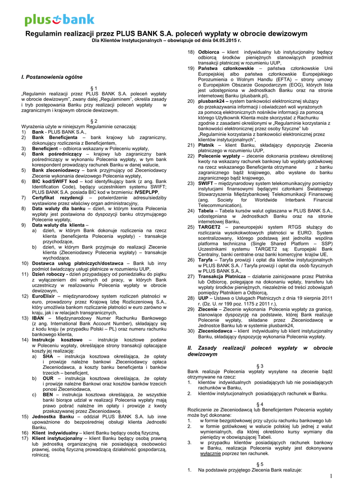 Regulamin realizacji przez PLUS BANK S.A. poleceń wypłaty w obrocie dewizowym Dla Klientów Instytucjonalnych – obowiązuje od dnia 04.05.2015 r. I. Postanowienia ogólne §1 „Regulamin realizacji przez PLUS BANK S.A. poleceń wypłaty w obrocie dewizowym”, zwany dalej „Regulaminem”, określa zasady i tryb postępowania Banku przy realizacji poleceń wypłaty w zagranicznym i krajowym obrocie dewizowym. §2 Wyrażenia użyte w niniejszym Regulaminie oznaczają: 1) Bank - PLUS BANK S.A., 2) Bank Beneficjenta – bank krajowy lub zagraniczny, dokonujący rozliczenia z Beneficjentem, 3) Beneficjent – odbiorca wskazany w Poleceniu wypłaty, 4) Bank pośredniczący – krajowy lub zagraniczny bank pośredniczący w wykonaniu Polecenia wypłaty, w tym bank korespondent prowadzący rachunek Banku w danej walucie, 5) Bank zleceniodawcy – bank przyjmujący od Zleceniodawcy Zlecenie wykonania dewizowego Polecenia wypłaty, 6) BIC kod/SWIFT kod – kod identyfikujący bank (z ang. Bank Identification Code), będący uczestnikiem systemu SWIFT; PLUS BANK S.A. posiada BIC kod w brzmieniu: IVSEPLPP, 7) Certyfikat rezydencji – potwierdzenie adresu/siedziby wystawione przez właściwy organ administracyjny, 8) Data waluty dla banku – dzień, w którym kwota Polecenia wypłaty jest postawiona do dyspozycji banku otrzymującego Polecenie wypłaty, 9) Data waluty dla klienta – a) dzień, w którym Bank dokonuje rozliczenia na rzecz klienta (beneficjenta Polecenia wypłaty) - transakcje przychodzące, b) dzień, w którym Bank przyjmuje do realizacji Zlecenie klienta (Zleceniodawcy Polecenia wypłaty) – transakcje wychodzące. 10) Dostawca usług płatniczych/dostawca – Bank lub inny podmiot świadczący usługi płatnicze w rozumieniu UUP, 11) Dzień roboczy - dzień przypadający od poniedziałku do piątku z wyłączeniem dni wolnych od pracy, w których Bank uczestniczy w realizowaniu Polecenia wypłaty w obrocie dewizowym, 12) EuroElixir – międzynarodowy system rozliczeń płatności w euro, prowadzony przez Krajową Izbę Rozliczeniową S.A., który umożliwia bankom rozliczanie płatności w euro zarówno w kraju, jak i w relacjach transgranicznych, 13) IBAN – Międzynarodowy Numer Rachunku Bankowego (z ang. International Bank Account Number), składający się z kodu kraju (w przypadku Polski – PL) oraz numeru rachunku bankowego klienta, 14) Instrukcje kosztowe – instrukcje kosztowe podane w Poleceniu wypłaty, określające strony transakcji opłacające koszty jej realizację: a) SHA – instrukcja kosztowa określająca, że opłaty i prowizje należne bankowi Zleceniodawcy opłaca Zleceniodawca, a koszty banku beneficjenta i banków trzecich – beneficjent, b) OUR – instrukcja kosztowa określająca, że opłaty i prowizje należne Bankowi oraz kosztów banków trzecich ponosi Zleceniodawca, c) BEN – instrukcja kosztowa określająca, że wszystkie banki biorące udział w realizacji Polecenia wypłaty mają prawo pobrać należne im opłaty i prowizje z kwoty przekazywanej przez Zleceniodawcę. 15) Jednostka Banku – oddział PLUS BANK S.A. lub inne upoważnione do bezpośredniej obsługi klienta Jednostki Banku, 16) Klient indywidualny – klient Banku będący osobą fizyczną, 17) Klient instytucjonalny – klient Banku będący osobą prawną lub jednostką organizacyjną nie posiadającą osobowości prawnej, osobą fizyczną prowadzącą działalność gospodarczą, rolniczą; 18) Odbiorca – klient indywidualny lub instytucjonalny będący odbiorcą środków pieniężnych stanowiących przedmiot transakcji płatniczej w rozumieniu UUP, 19) Państwa członkowskie – państwa członkowskie Unii Europejskiej albo państwa członkowskie Europejskiego Porozumienia o Wolnym Handlu (EFTA) – strony umowy o Europejskim Obszarze Gospodarczym (EOG), których lista jest udostępniona w Jednostkach Banku oraz na stronie internetowej Banku (plusbank.pl), 20) plusbank24 – system bankowości elektronicznej służący do przekazywania informacji i oświadczeń woli wyrażonych za pomocą elektronicznych nośników informacji za pomocą którego Użytkownik Klienta może skorzystać z Rachunku zgodnie z zasadami określonymi w „Regulaminie korzystania z bankowości elektronicznej przez osoby fizyczne” lub „Regulaminie korzystania z bankowości elektronicznej przez klientów instytucjonalnych”, 21) Płatnik – klient Banku, składający dyspozycję Zlecenia płatniczego w rozumieniu UUP, 22) Polecenie wypłaty – zlecenie dokonania przelewu określonej kwoty na wskazany rachunek bankowy lub wypłaty gotówkowej na rzecz wskazanego Beneficjenta otrzymane z banku zagranicznego bądź krajowego, albo wysłane do banku zagranicznego bądź krajowego, 23) SWIFT – międzynarodowy system telekomunikacyjny pomiędzy instytucjami finansowymi będącymi członkami Światowego Stowarzyszenia Międzybankowej Telekomunikacji Finansowej (ang. Society for Worldwide Interbank Financial Telecommunication), 24) Tabela – Tabela kursów walut ogłaszana w PLUS BANK S.A., udostępniana w Jednostkach Banku oraz na stronie internetowej Banku, 25) TARGET2 – paneuropejski system RTGS służący do rozliczania wysokokwotowych płatności w EURO. System scentralizowany, którego podstawą jest jednolita wspólna platforma techniczna (Single Shared Platform – SSP) Uczestnikami systemu TARGET2 są: Europejski Bank Centralny, banki centralne oraz banki komercyjne krajów UE, 26) Taryfa – Taryfa prowizji i opłat dla klientów instytucjonalnych w PLUS BANK S.A. / Taryfa prowizji i opłat dla osób fizycznych w PLUS BANK S.A., 27) Transakcja Płatnicza – działanie zainicjowane przez Płatnika lub Odbiorcę, polegające na dokonaniu wpłaty, transferu lub wypłaty środków pieniężnych, niezależnie od treści zobowiązań pomiędzy Płatnikiem a Odbiorcą, 28) UUP – Ustawa o Usługach Płatniczych z dnia 19 sierpnia 2011 r. (Dz. U. nr 199 poz. 1175 z 2011 r.), 29)