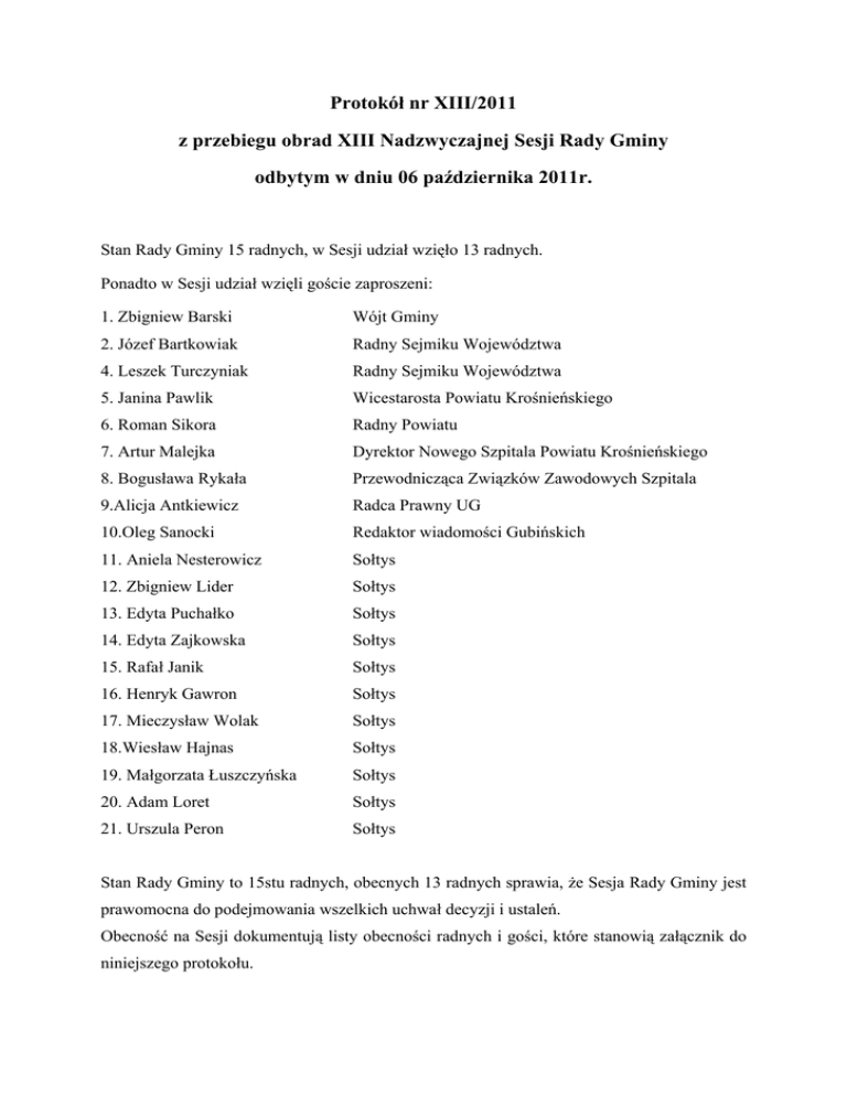 Protokół nr XIII/2011 z przebiegu obrad XIII Nadzwyczajnej Sesji Rady Gminy odbytym w dniu 06 października 2011r. Stan Rady Gminy 15 radnych, w Sesji udział wzięło 13 radnych. Ponadto w Sesji udział wzięli goście zaproszeni: 1. Zbigniew Barski Wójt Gminy 2. Józef Bartkowiak Radny Sejmiku Województwa 4. Leszek Turczyniak Radny Sejmiku Województwa 5. Janina Pawlik Wicestarosta Powiatu Krośnieńskiego 6. Roman Sikora Radny Powiatu 7. Artur Malejka Dyrektor Nowego Szpitala Powiatu Krośnieńskiego 8. Bogusława Rykała Przewodnicząca Związków Zawodowych Szpitala 9.Alicja Antkiewicz Radca Prawny UG 10.Oleg Sanocki Redaktor wiadomości Gubińskich 11. Aniela Nesterowicz Sołtys 12. Zbigniew Lider Sołtys 13. Edyta Puchałko Sołtys 14. Edyta Zajkowska Sołtys 15. Rafał Janik Sołtys 16. Henryk Gawron Sołtys 17. Mieczysław Wolak Sołtys 18.Wiesław Hajnas Sołtys 19. Małgorzata Łuszczyńska Sołtys 20. Adam Loret Sołtys 21. Urszula Peron Sołtys Stan Rady Gminy to 15stu radnych, obecnych 13 radnych sprawia, Ŝe Sesja Rady Gminy jest prawomocna do podejmowania wszelkich uchwał decyzji i ustaleń. Obecność na Sesji dokumentują listy obecności radnych i gości, które stanowią załącznik do niniejszego protokołu. Do punktu 1: Otwarcie i przyjęcie porządku obrad XIII Nadzwyczajnej Sesji Rady Gminy. Przewodniczący Rady Gminy Zbigniew Zygadło otworzył XIII Nadzwyczajną Sesję Rady Gminy o godz. 17.00. Stan Radnych 15 obecnych 13. Sesja Rady Gminy jest prawomocna do podejmowania wszelkich uchwał, decyzji i ustaleń. Przewodniczący Rady Gminy przywitał radnych, Wójta, pracowników Urzędu i zaproszonych gości. Poinformował, Ŝe Sesja Rady Gminy jest nagrywana, następnie przedstawił porządek obrad. Do punktu 2: Przedstawienie planu restrukturyzacji szpitala Powiatowego w Krośnie Odrzańskim (Gubinie). Radny Krzysztof Irisik przedstawił i odczytał pismo które skierowane zostało do Wójta Gminy Gubin Zbigniewa Barskiego od Starosty Powiatu Krośnieńskiego w celu wyraŜenia opinii dotyczącej planu restrukturyzacji szpitala. Następnie radny przedstawił pismo Konsorcjum Zakładu Usług Konsultingowych KNOW Sp z o.o Grupa Nowy szpital w Świebodzinie Sp. z o.o z siedzibą w Szczecinie przedstawiając równieŜ załączony plan restrukturyzacji szpitala jak i równieŜ pismo skierowanego Wicestarosty powiatu Krośnieńskiego , które zawiera informacje dotyczące wysokości kontraktu z Narodowym Funduszem Zdrowia, stan na dzień 31 sierpnia 2011 r. jak i równieŜ cel restrukturyzuj, który zbilansowałby działalność jednostki, która w chwil obecnej odnotowuje średniomiesięczną stratę w wysokości 120 tyś. zł. Do punktu 3: Dyskusja Przewodniczący Rady Zbigniew Zygadło – mam parę pytań do Dyrektora Szpitala Pana Artura Malejki. Pierwsze pytanie dotyczy danych statystycznych, gmina Gubin i miasto Gubin, to jest 43,71% ludności powiatu. Przytoczę parę wypowiedzi osób które wypowiadały się w tym temacie „ powiat krośnieński miasto Gubin ma absolutną specyfikę terytorialną, oddalone od Krosna Odrzańskiego o 30 km, gmina Gubin jest największą gminą w województwie lubuskim, jedna z największych w Polsce”. Większość mieszkańców jest nierozerwalnie związana z komunikacyjnie z Gubinem, a z takich miejscowości jak Mielno, Strzegów, Brzozów jest niemal 60 km do miasta powiatowego Krosna Odrzańskiego, nie da się z tych miejscowości w krótkim czasie dojechać do szpitala w Krośnie Odrzańskim. Biorąc pod uwagę powiatygdzie znajdują się dwa szpitale to odległość tych miast jest następująca np. Wschowa – Leszno 18 km, Wschowa – Głogów 28 km, śagań – śary 13 km, śary – Lubsko 20 km, KoŜuchów – Nowa Sól 11 km, Nowa Sól – Zielona Góra 23 km, Zielona Góra – Sulechów 19km, takich miejscowości w których szpitalu powielają się oddziały jest duŜo. Mam pytanie co się będzie działo z naszymi mieszkańcami jeśli w Krośnie Odrzańskim zostanie zablokowany most np. w przypadku powodzi? W tym przypadku odcinamy miasto Gubin i gminę Gubinom Krosna Odrzańskiego. Przeczytam kilka wypowiedzi udzielonych m. in. dla gazety lubuskiej przez Panią Michalak „ budynek lecznicy w Gubinie jest znacznie nowocześniejszy, w Krośnie Odrzańskim planuje utworzenie dwóch małych oddziałów, chirurgię jednego dnia i ginekologię jednego dnia, wasz budynek zostanie w całości zagospodarowany, przeniesiemy zespół wyjazdowy ratownictwa medycznego” niespełna po 1,5 roku wypowiedź Pana Artura Malejki „ gubiński szpital jest o wiele większy od krośnieńskiego lecz stan techniczny pozostawia wiele do Ŝyczenia, prowadzenie szpitala w dwóch miastach to logicznie, organizacyjnie i ekonomiczny koszmar, nie wyobraŜam sobie dalszego funkcjonowania szpitala w obecnej formie”, następna wypowiedź „ mamy o wiele niŜszy kontrakt z NFZ niŜ zakładaliśmy, sytuacja zmusza nas do oszczędności, jeśli nie przeorganizujemy szpitala teraz to placówce moŜe nawet grozić upadłość”. Proszę Państwa nie moŜemy stanąć po stronie spółki, poniewaŜ naszych mieszkańców skazuje to na tułaczkę, nie liczy się nasze zdanie prywatne, liczą się nasi mieszkańcy. Dyrektor Szpitala Artur Malejka – nie do końca słowa które teraz padły są prawdą, przesłany do Starostwa Powiatowego projekt restrukturyzacji szpitala daje moŜliwość oszczędności. Dzięki restrukturyzacji kwota oszczędności to 160 tys. zł miesięcznie, deficyt szpitala który teraz wynosi to 120 tys. zł Prawdą jest to, Ŝe jeden budynek szpitala jest w najlepszym stanie, zgodnie z planem restrukturyzacji będzie zagospodarowany dla tych świadczeń dla których zostały przewidziane w planie restrukturyzacji szpitala w powiecie krośnieńskim. Prawdą jest równieŜ to, Ŝe mieszkańcy Gubina sa szarpani, to jest rzecz którą szanuje, dlatego jestem dziś z państwem, przyznaje się Ŝe sam jestem autorem tego pla