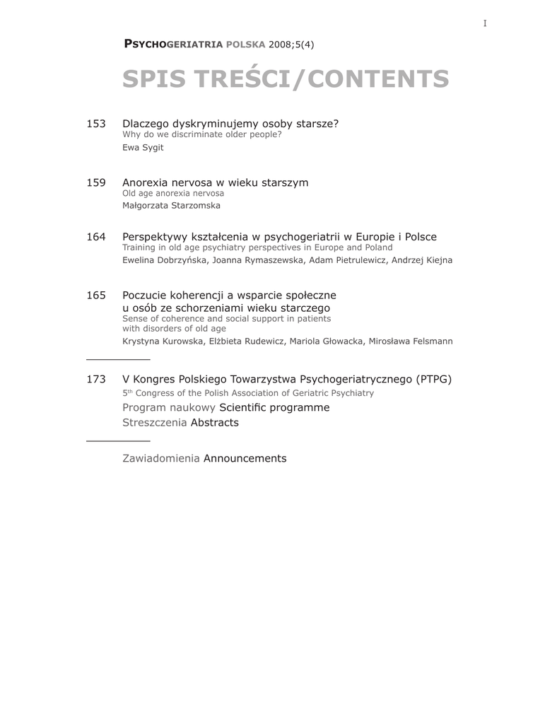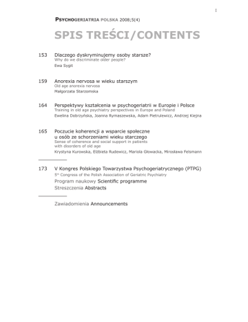 I PSYCHOGERIATRIA POLSKA 2008;5(4) SPIS TREŚCI/CONTENTS 153 Dlaczego dyskryminujemy osoby starsze? Why do we discriminate older people? Ewa Sygit 159 Anorexia nervosa w wieku starszym 164 Perspektywy kształcenia w psychogeriatrii w Europie i Polsce Old age anorexia nervosa Małgorzata Starzomska Training in old age psychiatry perspectives in Europe and Poland Ewelina Dobrzyńska, Joanna Rymaszewska, Adam Pietrulewicz, Andrzej Kiejna 165 Poczucie koherencji a wsparcie społeczne u osób ze schorzeniami wieku starczego Sense of coherence and social support in patients with disorders of old age Krystyna Kurowska, Elżbieta Rudewicz, Mariola Głowacka, Mirosława Felsmann 173 V Kongres Polskiego Towarzystwa Psychogeriatrycznego (PTPG) 5th Congress of the Polish Association of Geriatric Psychiatry Program naukowy Scientific programme Streszczenia Abstracts Zawiadomienia Announcements II Redaktor Naczelny/Editor-in-Chief Andrzej Kiejna (Wrocław, Poland) Redaktor Międzynarodowy/International Editor Ralf Ihl (Düsseldorf, Germany) Rada Naukowa/Editorial Board Aleksander Araszkiewicz (Bydgoszcz, Poland) Stavros Baloyannis (Thessaloniki, Greece) Leszek Bidzan (Gdańsk, Poland) Jason Brown (New York, USA) Pasquale Calabrese (Bochum, Germany) Salvatore DiMauro (New York, USA) Knut Engedal (Oslo, Norway) Tomasz Gabryelewicz (Warszawa, Poland) Andrzej Górski (Wrocław, Poland) George T. Grossberg (Saint Louis, USA) Lars Gustafson (Lund, Sweden) Khalid Iqbal (New York, USA) Marek Jarema (Warszawa, Poland) Marek Jutel (Wrocław, Poland) Thomas Kallert (Dresden, Germany) Siegfried Kanowski (Berlin, Germany) Cornelius Katona (London, Great Britain) Iwona Kłoszewska (Łódź, Poland) Amos Korczyn (Tel-Aviv, Israel) Raimundo Mateos (Santiago de Compostela, Spain) Konrad Maurer (Frankfurt/Main, Germany) Carlos Augusto de Mendonça Lima (Rio de Janeiro, Brasil) Bruce Duncan MacQueen (Bydgoszcz, Poland) Janusz Moryś (Gdańsk, Poland) Grzegorz Opala (Katowice, Poland) Tadeusz Parnowski (Warszawa, Poland) Maria Pąchalska (Kraków, Poland) Michael Philpot (London, Great Britain) Ryszard Podemski (Wrocław, Poland) Martin Prince (London, Great Britain) Stanisław Pużyński (Warszawa, Poland) Jiři Raboch (Prague, Czech Republic) Barry Reisberg (New York, USA) Jarl Risberg (Lund, Sweden) Joanna Rymaszewska (Wrocław, Poland) Johannes Schröder (Heidelberg, Germany) Andrzej Szczudlik (Kraków, Poland) Nicoleta Tataru (Oradea, Romania) Jerzy Vetulani (Kraków, Poland) Kolegium Redakcyjne/Executive Board Andrzej Kiejna, Jerzy Leszek, Ralf Ihl, Joanna Rymaszewska, Aleksandra Zawadzka, Tomasz Adamowski, Patryk Piotrowski Sekretarz Redakcyjny/Editorial Secretary Aleksandra Zawadzka, Patryk Piotrowski e-mail: [email protected] Adres Korespondencyjny Redakcji/Correspondence Address PSYCHOGERIATRIA POLSKA 50-119 Wrocław, ul. Nożownicza 4/8, Poland tel. (+48) (71) 343 21 52; faks (+48) (71) 343 21 55 Dział Reklamy i Marketingu/Advertising and Marketing Section Tomasz Adamowski e-mail: [email protected] Redakcja nie odpowiada za treść zamieszczonych reklam Projekt graficzny/design: Paweł Jaszczuk Skład i druk/press: Mediacom sp. z o.o., www.mediacom.com.pl Wydawca/Publisher FUNDACJA OCHRONY ZDROWIA PSYCHICZNEGO FOUNDATION OF MENTAL HEALTH 50-119 Wrocław, ul. Nożownicza 4/8, Poland http://www.fozp.org.pl nakład 500 egz. Copyright ©2004 Fundacja Ochrony Zdrowia Psychicznego III PSYCHOGERIATRIA POLSKA 2008;5(4) Od Redakcji Drodzy Czytelnicy! Grudniowy numer Psychogeriatrii Polskiej tradycyjnie poświęcony jest Kongresowi PTPG, którego uczestnicy spotkają się już po raz piąty. Z uwagi na to, że jest to mały jubileusz Polskiego Towarzystwa Psychogeriatrycznego, a zarazem Czasopisma, obojgu Jubilatom życzę dalszego harmonijnego rozwoju i pomyślności w kolejnych latach. Redaktor Naczelny Prof. Andrzej Kiejna IV PSYCHOGERIATRIA POLSKA 2008;5(4) From the Editor Dear Readers! The December’s issue of the Polish Journal of Geriatric Psychiatry is traditionally devoted to the Congress of Polish Association of Geriatric Psychiatry, at which for the already fifth time the participants are going to meet. Since it is a jubilee of Polish Association of Geriatric Psychiatry and at the same time – of the Journal, I wish to both of the jubilats further harmonious development and prosperity in the years to come. Prof. Andrzej Kiejna MD Editor–in–Chief PAŹDZIERNIK | GRUDZIEŃ 2008 VOL 5 NO 4 Organ naukowy Polskiego Towarzystwa Psychogeriatrycznego oraz Sekcji Psychogeriatrii i Choroby Alzheimera Polskiego Towarzystwa Psychiatrycznego An official journal of the Polish Association of Geriatric Psychiatry and of the Old Age Psychiatry and Alzheimer’s Section of the Polish Psychiatric Association Indexed in EMBASE / Excerpta Medica INDEX COPERNICUS ICV 4,98 pkt PsycINFO KBN 4,0