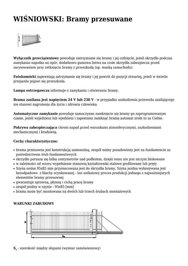 WIŚNIOWSKI: Bramy przesuwane Wyłącznik przeciążeniowy powoduje zatrzymanie się bramy i jej cofnięcie, jeżeli skrzydło podczas zamykania napotka na opór, dodatkowo gumowa listwa na czole skrzydła zabezpiecza przed zarysowaniem przy zetknięciu bramy z przeszkodą (np. maską samochodu). Fotokomórki zapewniają zatrzymanie się bramy i jej powrót do pozycji otwartej, jeżeli w świetle przejazdu pojawi się przeszkoda. Lampa ostrzegawcza informuje o zamykaniu i otwieraniu bramy. Brama zasilana jest napięciem 24 V lub 230 V - w przypadku uszkodzenia przewodu zasilającego nie stanowi zagrożenia dla życia i zdrowia człowieka. Automatyczne zamykanie powoduje samoczynne zamknięcie się bramy po zaprogramowanym czasie, jeżeli wyjedziesz lub wjedziesz i zapomnisz zamknąć bramę automat zrobi to za Ciebie. Pokrywa zabezpieczająca chroni napęd przed warunkami atmosferycznymi, uszkodzeniami mechanicznymi i kradzieżą. Cechy charakterystyczne: ● ● ● ● ● ● ● brama przesuwna jest konstrukcją samonośną, zespół nośny posadowiony jest na fundamencie za pośrednictwem śrub fundamentowych skrzydło porusza się kilka centymetrów nad podłożem, dzięki temu nie jest niczym blokowane w zależności od wzoru wypełnienie stanowią kształtowniki stalowe profilowane lub pręty Szyna nośna 95x85 mm przymocowana jest do skrzydła bramy, Szyna jezdna wykonywana jest bezodpadowo z blachy ocynkowanej - ten unikatowy proces produkcji jednego z najważniejszych elementów bramy przesuwnej gwarantuje sprawną, płynną i cichą pracę bramy zespół jezdny w szynie - 95x85 [mm] brama może być montowana na dwóch lub trzech śrubach montażowych WARUNKI ZABUDOWY So - szerokość między słupami (wymiar zamówieniowy) H - wysokość skrzydła bramy (wymiar zamówieniowy) BRAMA PRZESUWNA Z NAPĘDEM: Napęd w słupie – bezpiecznie, wygodnie, estetycznie Automat umieszczony w stalowym słupku bramy przesuwnej WIŚNIOWSKI jest jedynym takim rozwiązaniem na rynku. Zamiast urządzeń zewnętrznych, które często padają łupem złodziei i szpecą ogrodzenie, warto zamówić bramę ze zintegrowanym automatem. Słupek chroni mechanizm przed czynnikami atmosferycznymi. W razie braku prądu w łatwy sposób można rozblokować automat i otworzyć bramę ręcznie. Napęd w słupie AWSo2000 ● ● ● zamontowany w słupie o przekroju 120x120 mm zabezpieczenie pokrywą chroni napęd prze warunkami atmosferycznymi, uszkodzeniami mechanicznymi i kradzieżą dźwignia otwierania pokrywy jednocześnie rozlokowuje napęd i po zdjęciu pokrywy umożliwia dostęp do napędu Dostępna również opcja z napędem zewnętrznym. KONTAKT WIŚNIOWSKI Sp. z o.o. S.K.A. E-mail: [email protected] WWW: www.wisniowski.pl Tel: +48 447 71 11 Fax: +48 447 71 10 Adres: Wielogłowy 153 33-311 Wielogłowy