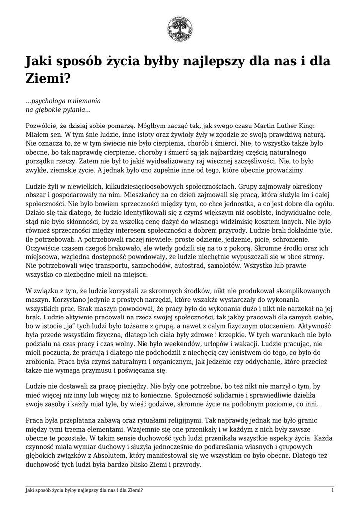 Jaki sposób życia byłby najlepszy dla nas i dla Ziemi? ...psychologa mniemania na głębokie pytania... Pozwólcie, że dzisiaj sobie pomarzę. Mógłbym zacząć tak, jak swego czasu Martin Luther King: Miałem sen. W tym śnie ludzie, inne istoty oraz żywioły żyły w zgodzie ze swoją prawdziwą naturą. Nie oznacza to, że w tym świecie nie było cierpienia, chorób i śmierci. Nie, to wszystko także było obecne, bo tak naprawdę cierpienie, choroby i śmierć są jak najbardziej częścią naturalnego porządku rzeczy. Zatem nie był to jakiś wyidealizowany raj wiecznej szczęśliwości. Nie, to było zwykłe, ziemskie życie. A jednak było ono zupełnie inne od tego, które obecnie prowadzimy. Ludzie żyli w niewielkich, kilkudziesięcioosobowych społecznościach. Grupy zajmowały określony obszar i gospodarowały na nim. Mieszkańcy na co dzień zajmowali się pracą, która służyła im i całej społeczności. Nie było bowiem sprzeczności między tym, co chce jednostka, a co jest dobre dla ogółu. Działo się tak dlatego, że ludzie identyfikowali się z czymś większym niż osobiste, indywidualne cele, stąd nie było skłonności, by za wszelką cenę dążyć do własnego widzimisię kosztem innych. Nie było również sprzeczności między interesem społeczności a dobrem przyrody. Ludzie brali dokładnie tyle, ile potrzebowali. A potrzebowali raczej niewiele: proste odzienie, jedzenie, picie, schronienie. Oczywiście czasem czegoś brakowało, ale wtedy godzili się na to z pokorą. Skromne środki oraz ich miejscowa, względna dostępność powodowały, że ludzie niechętnie wypuszczali się w obce strony. Nie potrzebowali więc transportu, samochodów, autostrad, samolotów. Wszystko lub prawie wszystko co niezbędne mieli na miejscu. W związku z tym, że ludzie korzystali ze skromnych środków, nikt nie produkował skomplikowanych maszyn. Korzystano jedynie z prostych narzędzi, które wszakże wystarczały do wykonania wszystkich prac. Brak maszyn powodował, że pracy było do wykonania dużo i nikt nie narzekał na jej brak. Ludzie aktywnie pracowali na rzecz swojej społeczności, tak jakby pracowali dla samych siebie, bo w istocie „ja” tych ludzi było tożsame z grupą, a nawet z całym fizycznym otoczeniem. Aktywność była przede wszystkim fizyczna, dlatego ich ciała były zdrowe i krzepkie. W tych warunkach nie było podziału na czas pracy i czas wolny. Nie było weekendów, urlopów i wakacji. Ludzie pracując, nie mieli poczucia, że pracują i dlatego nie podchodzili z niechęcią czy lenistwem do tego, co było do zrobienia. Praca była czymś naturalnym i organicznym, jak jedzenie czy oddychanie, które przecież także nie wymaga przymusu i poświęcania się. Ludzie nie dostawali za pracę pieniędzy. Nie były one potrzebne, bo też nikt nie marzył o tym, by mieć więcej niż inny lub więcej niż to konieczne. Społeczność solidarnie i sprawiedliwie dzieliła swoje zasoby i każdy miał tyle, by wieść godziwe, skromne życie na podobnym poziomie, co inni. Praca była przeplatana zabawą oraz rytuałami religijnymi. Tak naprawdę jednak nie było granic między tymi trzema elementami. Wzajemnie się one przenikały i w każdym z nich były zawsze obecne te pozostałe. W takim sensie duchowość tych ludzi przenikała wszystkie aspekty życia. Każda czynność miała wymiar duchowy i służyła jednocześnie do podkreślania własnych i grupowych głębokich związków z Absolutem, który manifestował się we wszystkim co było obecne. Dlatego też duchowość tych ludzi była bardzo blisko Ziemi i przyrody. Jaki sposób życia byłby najlepszy dla nas i dla Ziemi? 1 Decyzje w grupie były podejmowane wspólnie przez wszystkich jej dorosłych członków. Każdy miał prawo się wypowiedzieć. Bezpośrednia komunikacja dawała poczucie wpływu na bieg rzeczy i jeszcze bardziej sprzyjała identyfikacji jednostki z grupą. Życie tych ludzi było Pełne. Mieli bowiem bliski kontakt ze sobą, z innymi, z ziemią, Absolutem i przyrodą. Widzieli siebie jako połączonych z całym żywym wszechświatem, który był ich prawdziwym domem. Kochali tę swoją ziemię i dbali o nią, jak o samych siebie. Nie potrzebowali zbyt wiele, a to, czego potrzebowali, było na miejscu. Nie śpieszyli się. Oddychali czystym powietrzem, pili czystą wodę i jedli zdrowe, mało przetworzone jedzenie. A kiedy przychodził ich czas, umierali w takim wieku, jaki był im pisany w związku z życiem, które prowadzili. Nie miało większego znaczenia to, czy ktoś żył lat 30 czy 80. Nikt nie chciał żyć dłużej i za wszelką cenę. Liczył się bowiem ten dzień i ta chwila. Bo przecież umiera się zawsze w teraźniejszości, niezależnie od ilości przeżytych lat. Poza tym ludzie ci zdawali sobie sprawę, że śmierć jest tylko kolejnym obrotem koła. Przyjmowali choroby i śmierć jako coś naturalnego i godzili się na nie, choć oczywiście przeżywali w związku z tym również uczucia smutku, rozpaczy, złości i żalu. Ludzie ci byli otwarci na swoje uczucia, przeżywali je i wyrażali, próbując zrozumieć siebie i innych. Dzięki temu, jakkolwiek zdarzały się w grupie konflikty, to rozwiązywały się one niejako same, gdy ludzie zaczynali szczerze mówić o sobie i swoich uczuciach. To marzenie, ten sen z pewnością coś wam przypomina. Prawdopodobnie przez większość naszej gatunkowej historii wiedliśmy właśnie takie lub podobne życie. Wspomnienie tego jest pewnie zapisane w każdym z nas gdzieś głęboko w zakamarkach zbiorowej nieświadomości. Może też odkrywasz w sobie, przeczuwasz, intuicyjnie doświadczasz takiej wizji życia? Dzisiaj żyjemy inaczej i wszystko wskazuje, że coraz bardziej będziemy oddalać się od tej sennej wizji, od tego marzenia. Czy to dobrze, czy źle? A może trzeba powiedzieć, że jest jak jest. I że ten sposób życia, który praktykujemy obecnie zawiedzie nas tam, gdzie nas zawie