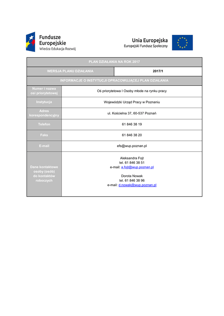 PLAN DZIAŁANIA NA ROK 2017 WERSJA PLANU DZIAŁANIA 2017/1 INFORMACJE O INSTYTUCJI OPRACOWUJĄCEJ PLAN DZIAŁANIA Numer i nazwa osi priorytetowej Oś priorytetowa I Osoby młode na rynku pracy Instytucja Wojewódzki Urząd Pracy w Poznaniu Adres korespondencyjny ul. Kościelna 37, 60-537 Poznań Telefon 61 846 38 19 Faks 61 846 38 20 E-mail [email protected] Dane kontaktowe osoby (osób) do kontaktów roboczych Aleksandra Fojt tel. 61 846 38 51 e-mail: [email protected] Dorota Nowak tel. 61 846 38 96 e-mail: [email protected] DZIAŁANIE/PODDZIAŁANIE PO WER Działanie 1.1 Wsparcie osób młodych pozostających bez pracy na regionalnym rynku pracy – projekty pozakonkursowe/Poddziałanie 1.1.1 Wsparcie udzielane z Europejskiego Funduszu Społecznego FISZKA PROJEKTU POZAKONKURSOWEGO WDROŻENIOWEGO PODSTAWOWE INFORMACJE O PROJEKCIE Tytuł lub zakres projektu Uzasadnienie realizacji projektu w trybie pozakonkursowym Cel szczegółowy PO WER, w ramach którego projekt będzie realizowany Priorytet inwestycyjny Aktywizacja osób młodych pozostających bez pracy w województwie wielkopolskim. Uzasadnieniem jest charakter i cel projektów powiatowych urzędów pracy z terenu województwa. Możliwość zastosowania trybu pozakonkursowego wynika z zapisów art. 38 ust. 2 i 3 ustawy z dnia 11 lipca 2014 r. o zasadach realizacji programów w zakresie polityki spójności finansowanych w perspektywie finansowej 2014–2020 mówiących o wnioskodawcach oraz projektach, których wybór jest możliwy w trybie pozakonkursowym. Zgodnie z zapisami podrozdziału 5.2.1 Polityka spójności, rozdziału 5.2 Zasady wyboru projektów Umowy Partnerstwa z dnia 21 maja 2014 r. projektem pozakonkursowym EFS może być projekt o charakterze wdrożeniowym polegający na świadczeniu usług rynku pracy. Zwiększenie możliwości zatrudnienia osób młodych do 29 roku życia bez pracy, w tym w szczególności osób, które nie uczestniczą w kształceniu i szkoleniu (tzw. młodzież NEET). Priorytet inwestycyjny 8ii trwała integracja na rynku pracy ludzi młodych, w szczególności tych, którzy nie pracują, nie kształcą się ani nie szkolą, w tym ludzi młodych zagrożonych wykluczeniem społecznym i ludzi młodych wywodzących się ze środowisk marginalizowanych, także poprzez wdrażanie gwarancji dla młodzieży. Instrumenty i usługi rynku pracy wynikające z Ustawy z dnia 20 kwietnia 2004 r. o promocji zatrudnienia i instytucjach rynku pracy (Dz.U. z 2013 r. poz. 674, z późn.zm.), z wyłączeniem robót publicznych, odnoszące się do następujących typów operacji: instrumenty i usługi rynku pracy służące indywidualizacji wsparcia oraz pomocy w zakresie określenia ścieżki zawodowej (obligatoryjne): 1. Typ/typy projektów przewidziane do realizacji w ramach projektu identyfikacja potrzeb osób młodych pozostających bez zatrudnienia oraz diagnozowanie możliwości w zakresie doskonalenia zawodowego, w tym identyfikacja stopnia oddalenia od rynku pracy osób młodych, kompleksowe i indywidualne pośrednictwo pracy w zakresie wyboru zawodu zgodnego z kwalifikacjami i kompetencjami wspieranej osoby lub poradnictwo zawodowe w zakresie planowania rozwoju kariery zawodowej, w tym podnoszenia lub uzupełniania kompetencji i kwalifikacji zawodowych, instrumenty i usługi rynku pracy skierowane do osób, które przedwcześnie opuszczają system edukacji lub osób, u których zidentyfikowano potrzebę uzupełnienia lub zdobycia nowych umiejętności i kompetencji: kontynuacja nauki dla osób młodych, u których zdiagnozowano potrzebę uzupełnienia edukacji formalnej lub potrzebę potwierdzenia kwalifikacji m.in. poprzez odpowiednie egzaminy, nabywanie, podwyższanie lub dostosowywanie kompetencji i kwalifikacji, niezbędnych na rynku pracy w kontekście zidentyfikowanych potrzeb osoby, której udzielane jest wsparcie, m.in. poprzez wysokiej jakości szkolenia, instrumenty i usługi rynku pracy służące zdobyciu doświadczenia zawodowego wymaganego przez pracodawców: nabywanie lub uzupełnianie doświadczenia zawodowego oraz praktycznych umiejętności w zakresie wykonywania danego zawodu, m.in. poprzez staże i praktyki, spełniające standardy wskazane w Europejskich Ramach Jakości 2. 3. 2 Praktyk i Staży, wsparcie zatrudnienia osoby młodej u przedsiębiorcy lub innego pracodawcy, stanowiące zachętę do zatrudnienia, m.in. poprzez pokrycie kosztów subsydiowania zatrudnienia dla osób, u których zidentyfikowano adekwatność tej formy wsparcia, refundację wyposażenia lub doposażenia stanowiska pracy (wyłącznie w połączeniu z subsydiowanym zatrudnieniem), instrumenty i usługi rynku pracy służące wsparciu mobilności międzysektorowej i geograficznej (uwzględniając mobilność zawodową na europejskim rynku pracy za pośrednictwem sieci EURES): wsparcie mobilności międzysektorowej dla osób, które mają trudności ze znalezieniem zatrudnienia w sektorze lub branży, m.in. poprzez zmianę lub uzupełnienie kompetencji lub kwalifikacji pozwalających na podjęcie zatrudnienia w innym sektorze, m.in. poprzez praktyki, staże i szkolenia, spełniające standardy wyznaczone dla tych usług (np. Europejskie i Polskie Ramy Jakości Praktyk i Staży), wsparcie mobilności geograficznej dla osób młodych, u których zidentyfikowano problem z zatrudnieniem w miejscu zamieszkania, m.in. poprzez pokrycie kosztów dojazdu do pracy lub wstępnego zagospodarowania w nowym miejscu zamieszkania, m.in. poprzez finansowanie kosztów dojazdu, zapewnienie środków na zasiedlenie, instrumenty i usługi rynku pracy skierowane do osób niepełnosprawnych: niwelowanie barier jakie napotykają osoby młode niepełnosprawne w zakresie zdobycia i utrzymania zatrudnienia, m.in. poprzez finansowanie pracy asystenta osoby niepełnosprawnej, którego praca spełnia standardy wyznaczone dla takiej usługi i doposażenie stanowiska pracy do potrzeb osób niepełnosprawnych. instrumenty i usługi rynku pracy sł