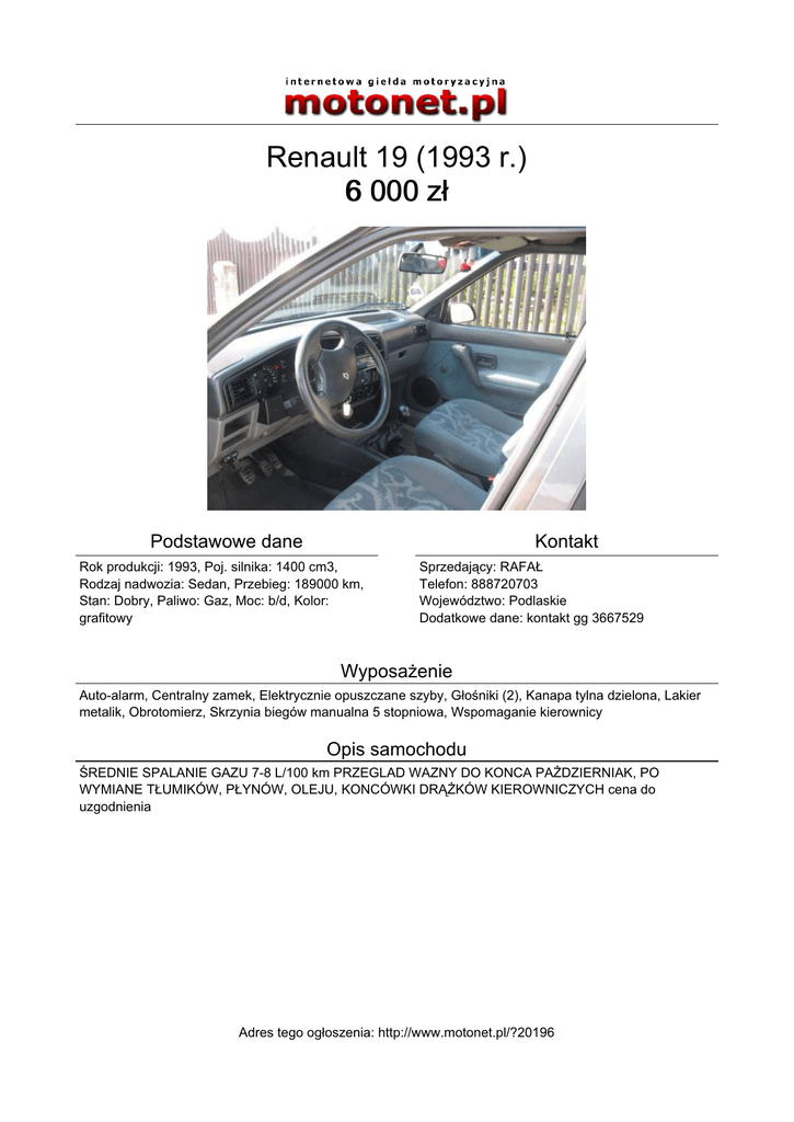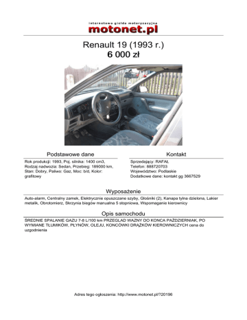 Renault 19 (1993 r.) 6 000 zł Podstawowe dane Kontakt Rok produkcji: 1993, Poj. silnika: 1400 cm3, Rodzaj nadwozia: Sedan, Przebieg: 189000 km, Stan: Dobry, Paliwo: Gaz, Moc: b/d, Kolor: grafitowy Sprzedający: RAFAŁ Telefon: 888720703 Województwo: Podlaskie Dodatkowe dane: kontakt gg 3667529 Wyposażenie Auto-alarm, Centralny zamek, Elektrycznie opuszczane szyby, Głośniki (2), Kanapa tylna dzielona, Lakier metalik, Obrotomierz, Skrzynia biegów manualna 5 stopniowa, Wspomaganie kierownicy Opis samochodu ŚREDNIE SPALANIE GAZU 7-8 L/100 km PRZEGLAD WAZNY DO KONCA PAŻDZIERNIAK, PO WYMIANE TŁUMIKÓW, PŁYNÓW, OLEJU, KONCÓWKI DRĄŻKÓW KIEROWNICZYCH cena do uzgodnienia Adres tego ogłoszenia: http://www.motonet.pl/?20196