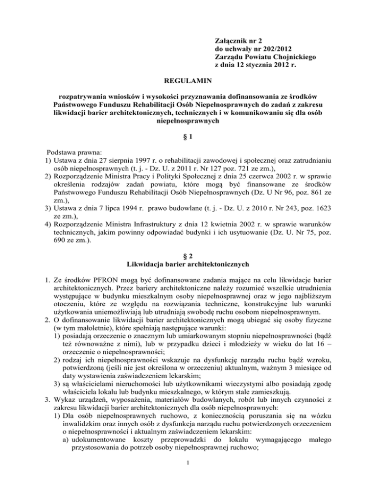 Załącznik nr 2 do uchwały nr 202/2012 Zarządu Powiatu Chojnickiego z dnia 12 stycznia 2012 r. REGULAMIN rozpatrywania wniosków i wysokości przyznawania dofinansowania ze środków Państwowego Funduszu Rehabilitacji Osób Niepełnosprawnych do zadań z zakresu likwidacji barier architektonicznych, technicznych i w komunikowaniu się dla osób niepełnosprawnych §1 Podstawa prawna: 1) Ustawa z dnia 27 sierpnia 1997 r. o rehabilitacji zawodowej i społecznej oraz zatrudnianiu osób niepełnosprawnych (t. j. - Dz. U. z 2011 r. Nr 127 poz. 721 ze zm.), 2) Rozporządzenie Ministra Pracy i Polityki Społecznej z dnia 25 czerwca 2002 r. w sprawie określenia rodzajów zadań powiatu, które mogą być finansowane ze środków Państwowego Funduszu Rehabilitacji Osób Niepełnosprawnych (Dz. U Nr 96, poz. 861 ze zm.), 3) Ustawa z dnia 7 lipca 1994 r. prawo budowlane (t. j. - Dz. U. z 2010 r. Nr 243, poz. 1623 ze zm.), 4) Rozporządzenie Ministra Infrastruktury z dnia 12 kwietnia 2002 r. w sprawie warunków technicznych, jakim powinny odpowiadać budynki i ich usytuowanie (Dz. U. Nr 75, poz. 690 ze zm.). §2 Likwidacja barier architektonicznych 1. Ze środków PFRON mogą być dofinansowane zadania mające na celu likwidacje barier architektonicznych. Przez bariery architektoniczne należy rozumieć wszelkie utrudnienia występujące w budynku mieszkalnym osoby niepełnosprawnej oraz w jego najbliższym otoczeniu, które ze względu na rozwiązania techniczne, konstrukcyjne lub warunki użytkowania uniemożliwiają lub utrudniają swobodę ruchu osobom niepełnosprawnym. 2. O dofinansowanie likwidacji barier architektonicznych mogą ubiegać się osoby fizyczne (w tym małoletnie), które spełniają następujące warunki: 1) posiadają orzeczenie o znacznym lub umiarkowanym stopniu niepełnosprawności (bądź też równoważne z nimi), lub w przypadku dzieci i młodzieży w wieku do lat 16 – orzeczenie o niepełnosprawności; 2) rodzaj ich niepełnosprawności wskazuje na dysfunkcję narządu ruchu bądź wzroku, potwierdzoną (jeśli nie jest określona w orzeczeniu) aktualnym, ważnym 3 miesiące od daty wystawienia zaświadczeniem lekarskim; 3) są właścicielami nieruchomości lub użytkownikami wieczystymi albo posiadają zgodę właściciela lokalu lub budynku mieszkalnego, w którym stale zamieszkują. 3. Wykaz urządzeń, wyposażenia, materiałów budowlanych, robót lub innych czynności z zakresu likwidacji barier architektonicznych dla osób niepełnosprawnych: 1) Dla osób niepełnosprawnych ruchowo, z koniecznością poruszania się na wózku inwalidzkim oraz innych osób z dysfunkcja narządu ruchu potwierdzonych orzeczeniem o niepełnosprawności i aktualnym zaświadczeniem lekarskim: a) udokumentowane koszty przeprowadzki do lokalu wymagającego małego przystosowania do potrzeb osoby niepełnosprawnej ruchowo; 1 b) budowa pochylni i dojścia do budynku mieszkalnego, zapewniającego osobom niepełnosprawnym samodzielny dostęp do lokalu; c) dostawa, zakup i montaż: podnośnika, platformy schodowej, transportera schodowego, windy przyściennej, innych urządzeń do transportu pionowego; d) opłaty poniesione z tytułu sporządzenia dokumentów stanowiących podstawę do wydania zgody na dopuszczenie do eksploatacji urządzenia, jeżeli konieczność uzyskania takiej zgody wynika z odrębnych przepisów; e) dostawa, zakup i montaż poręczy i uchwytów w ciągach komunikacyjnych oraz uchwytów ułatwiających korzystanie z urządzeń higieniczno – sanitarnych; f) roboty polegające na: - likwidacji progów w miarę konieczności wymiana stolarki drzwiowej; - likwidacji zróżnicowania poziomu podłogi; g) przystosowanie drzwi: - zakup i montaż drzwi wejściowych o szerokości w świetle ościeżnicy co najmniej 90 cm, pozostałych co najmniej 80 cm; - zakup i montaż drzwi przesuwnych; - zakup i montaż systemu otwierania drzwi, w tym balkonowych, przyciskiem (dla wnioskodawców o niesprawnych rękach); - zakup i montaż zabezpieczenia drzwi (do wysokości 40 cm od podłogi) przed uszkodzeniami mechanicznymi i zainstalowanie ościeżnicy stalowej - wyłącznie wnioskodawcom poruszającym się na wózku inwalidzkim); - zakup i montaż okuć do drzwi balkonowych i okien. umożliwiające ich samodzielną obsługę przez osobę poruszającą się na wózku inwalidzkim, zamieszkałą samotnie lub z osobą o takiej samej lub innej dysfunkcji narządu ruchu – gdy montaż okuć ze względu na stan techniczny okien i drzwi balkonowych jest możliwy - w kuchni i jednym pokoju, wybranym przez wnioskodawcę; - zakup i wymiana okien i drzwi balkonowych w przypadkach, o których mowa wyżej, gdy montaż okuć nie jest możliwy; - zakup i zainstalowanie systemu automatycznego otwierania drzwi garażu - dla wnioskodawców posiadających i prowadzących samodzielnie samochód; h) wymiana wykładziny podłogowej (w miarę konieczności z podłożem, jeżeli stwarza trudności w poruszaniu); i) adaptacja pomieszczeń na pomieszczenia higieniczno – sanitarne poprzez dostosowanie do indywidualnych potrzeb wnioskodawcy; j) przystosowanie pomieszczeń higieniczno – sanitarnych do indywidualnych potrzeb wnioskodawcy; k) przystosowanie wyposażenia kuchni do samodzielnej obsługi przez osobę niepełnosprawną, w tym: - obniżenie i obudowanie zlewozmywaka oraz zakup i montaż niskich blatów, umożliwiające dojazd wózkiem inwalidzkim; - zakup i montaż ruchomych półek oraz pojemników na specjalnych prowadnicach; - zakup i montaż zawiasów umożliwiających otwieranie drzwiczek pod kątem większym niż 90° (do 170°); - zakup i montaż zatrzasków magnetycznych; l) koszty zamiany lokalu mieszkalnego na lokal mieszkalny bez barier architektonicznych w przypadku, gdy likwidacja barier w dotychczasowym lokalu jest niemożliwa ze względów technicznych lub koszty likwidacji barier byłyby wyższe niż koszty zamiany lokalu. 2) Dla osób z dysfunkcją narządu wzroku: a) dostawa, 