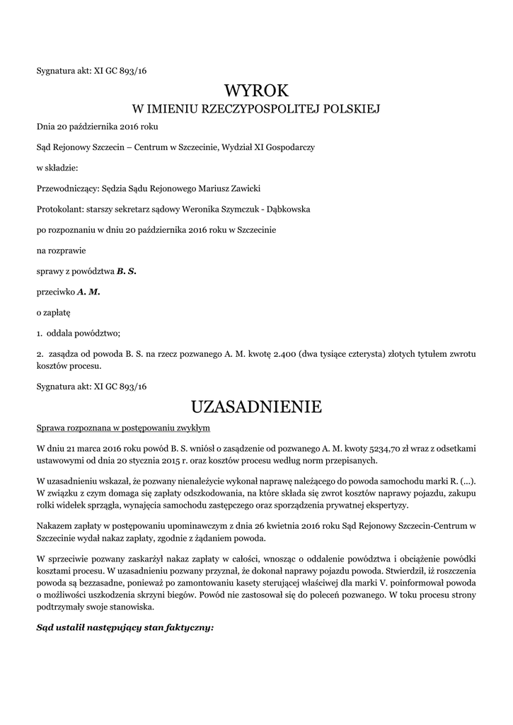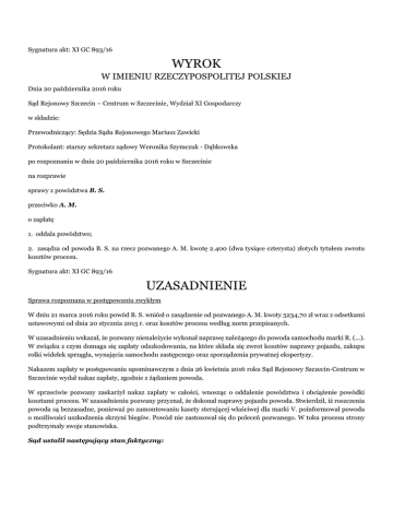 Sygnatura akt: XI GC 893/16 WYROK W IMIENIU RZECZYPOSPOLITEJ POLSKIEJ Dnia 20 października 2016 roku Sąd Rejonowy Szczecin – Centrum w Szczecinie, Wydział XI Gospodarczy w składzie: Przewodniczący: Sędzia Sądu Rejonowego Mariusz Zawicki Protokolant: starszy sekretarz sądowy Weronika Szymczuk - Dąbkowska po rozpoznaniu w dniu 20 października 2016 roku w Szczecinie na rozprawie sprawy z powództwa B. S. przeciwko A. M. o zapłatę 1. oddala powództwo; 2. zasądza od powoda B. S. na rzecz pozwanego A. M. kwotę 2.400 (dwa tysiące czterysta) złotych tytułem zwrotu kosztów procesu. Sygnatura akt: XI GC 893/16 UZASADNIENIE Sprawa rozpoznana w postępowaniu zwykłym W dniu 21 marca 2016 roku powód B. S. wniósł o zasądzenie od pozwanego A. M. kwoty 5234,70 zł wraz z odsetkami ustawowymi od dnia 20 stycznia 2015 r. oraz kosztów procesu według norm przepisanych. W uzasadnieniu wskazał, że pozwany nienależycie wykonał naprawę należącego do powoda samochodu marki R. (...). W związku z czym domaga się zapłaty odszkodowania, na które składa się zwrot kosztów naprawy pojazdu, zakupu rolki widełek sprzągła, wynajęcia samochodu zastępczego oraz sporządzenia prywatnej ekspertyzy. Nakazem zapłaty w postępowaniu upominawczym z dnia 26 kwietnia 2016 roku Sąd Rejonowy Szczecin-Centrum w Szczecinie wydał nakaz zapłaty, zgodnie z żądaniem powoda. W sprzeciwie pozwany zaskarżył nakaz zapłaty w całości, wnosząc o oddalenie powództwa i obciążenie powódki kosztami procesu. W uzasadnieniu pozwany przyznał, że dokonał naprawy pojazdu powoda. Stwierdził, iż roszczenia powoda są bezzasadne, ponieważ po zamontowaniu kasety sterującej właściwej dla marki V. poinformował powoda o możliwości uszkodzenia skrzyni biegów. Powód nie zastosował się do poleceń pozwanego. W toku procesu strony podtrzymały swoje stanowiska. Sąd ustalił następujący stan faktyczny: W dniu 18 czerwca 2014 r. w drodze ze S. do B. w pojeździe powoda marki R. (...) doszło do usterki. Kierowca pojazdu Z. B. przyjechał do warsztatu pozwanego w W.. Początkowo komputer wskazał błąd czujnika (...). Po wymianie czujnika wada pojazdu nie ustała. D. S., ojciec powoda, w trakcie rozmowy telefonicznej zlecił pozwanemu naprawę samochodu. Pozwany po ustaleniu, iż przyczyną usterki pojazdu było łożysko oraz sprzęgło dokonał ich naprawy. Ostatecznie pozwany uznał, iż problem stanowi płyta sterująca skrzynią biegów. Pozwany w porozumieniu z D. S. dokonał wymiany kasety sterującej skrzyni biegów na używaną część właściwą dla pojazdu marki V.. Po zamontowaniu używanej kasety sterującej skrzyni biegów pozwany nie mógł jej skonfigurować, nie wyświetlała się numeracja biegowa. Pozwany poinformował kierowcę o problemie ze skalibrowaniem skrzyni z silnikiem, o prawidłowej pracy samochodu dopiero po dokonaniu kalibracji oraz o możliwości jej dokonania w serwisie. W celu dokonania kalibracji pozwany skierował kierowcę do Ż.. Pozwany poinformował D. S., że w drodze powrotnej do S. może uszkodzić skrzynię biegów i że bezpieczniej byłoby pojazd zawieźć lawetą. W trakcie pobytu kierowcy w warsztacie pozwanego D. S. szukał odpowiedniej płyty i zdecydował, że naprawa, tj. przeprogramowanie elementu nastąpi po powrocie kierowcy. Pozwany umówił się z D. S., że jeżeli D. S. nie uda się zaprogramować płyty to będzie mógł ja odesłać, a pozwany zwróci mu pieniądze. Kierowca wyjechał z warsztatu w dniu 21 czerwca 2014 r. W dniu 18 czerwca 2014 r. pozwany wystawił powodowi fakturę Vat nr (...) na kwotę 3348,06 zł obejmującą: kasetę sterującą skrzyni biegów o wartości 1845 zł; gniazdo widełek wycisku sprzęgła o wartości 8,61 zł; komplet naprawczy widełek wycisku sprzęgła o wartości 166,05 zł; łożysko koła zamachowego o wartości 36,90 zł; dwie sztuki rolek widełek sprzęgła o wartości 123 zł; łożysko wycisku sprzęgła o wartości 676,50 zł oraz wymiana łożyska wycisku sprzęgła o wartości 492 zł. Dowód: - faktura Vat nr (...), k. 17 - zeznania świadka Z. B., k. 81-83 - zeznania świadka D. S., k. 83-84 - zeznania żony pozwanego, k. 78-79 - zeznania pozwanego, k. 84-85 Powód odesłał pozwanemu zamontowaną przez pozwanego kasetę sterującą skrzyni biegów. W związku z powyższym w dniu 26 lipca 2014 r. pozwany wystawił powodowi fakturę korygującą nr (...) i zwrócił powodowi kwotę 1845 zł. Dowód: - faktura korygująca nr (...), k. 56 - zeznania żony pozwanego, k. 78-79 - zeznania świadka D. S., k. 83-84 Po zwrocie pieniędzy i skorygowaniu faktury D. S. zakupił inną używaną kasetę sterującą skrzyni biegów i zamontował ją w okolicach P.. D. S. został uprzedzony przez sprzedawcę, iż będzie wyświetlał się błąd niezgodności numeru vin innego pojazdu. Samochód funkcjonował prawidłowo do momentu przejechania ok. 3-4 tys. km. Po przejechaniu około 8 tysięcy km od odebrania samochodu z warsztatu pozwanego D. S. oddał pojazd do (...) serwisu (...)/V. w S., w celu weryfikacji usterki skrzyni biegów objawiającej się zbyt długim czasem wybierania przełożenia biegu. W serwisie stwierdzono bardzo duże zużycie tulei widełek sprzęgła. Ustalono również, że powyższe było wynikiem uszkodzenia pokrywki i hamulca osi skrzyni biegów. Pojazd znajdował się w serwisie w dniach 1-8 września 2014 r. Ze względu na niezgodność kasety sterującej z nadwoziem serwis nie dokonał kalibracji skrzyni biegów. Samochód dalej jeździł na kasecie zamontowanej w okolicach P.. W dniu 4 września 2014 r. PW (...) spółka z ograniczoną odpowiedzialnością w S. Oddział w S. wystawił powodowi fakturę Vat nr (...) na kwotę 118,08 zł z tytułu dwóch sztuk rolek widełek sprzęgła. W dniu 8 września 2014 r. Serwisy (...) spółka z ograniczoną odpowiedzialnością spółka komandytowa Oddział w S. (...) serwis (...)/V. wystawiła powodowi fakturę Vat nr