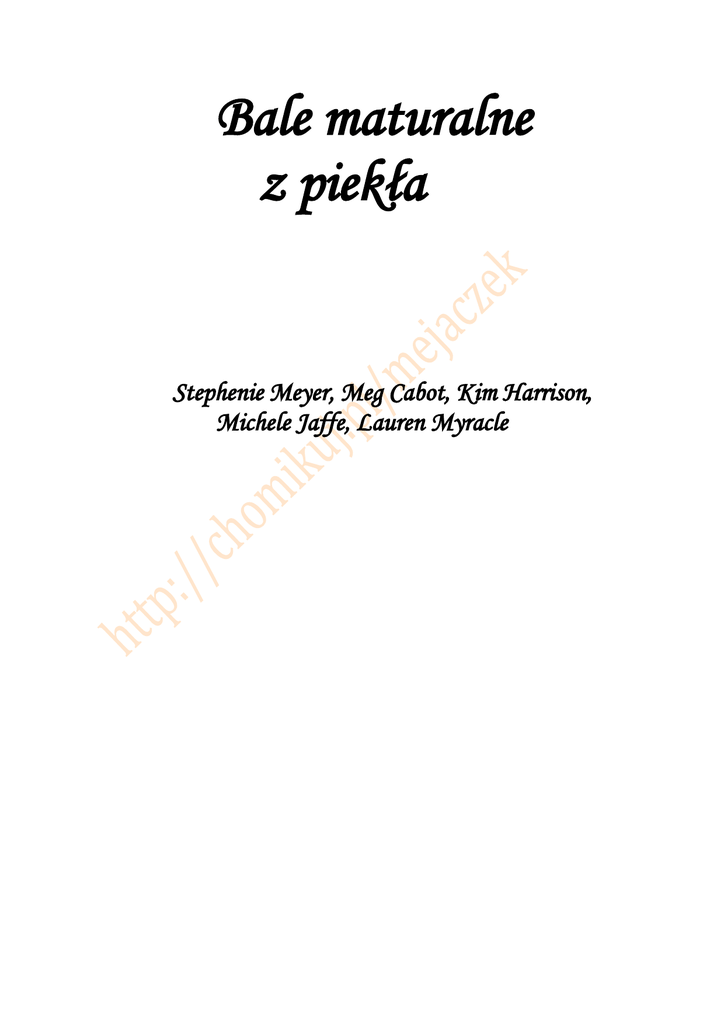 Bale maturalne z piekła Stephenie Meyer, Meg Cabot, Kim Harrison, Michele Jaffe, Lauren Myracle Spis Treści: Stephenie Meyer Piekło na ziemi 9 Meg Cabot Córka likwidatora Kim Harrison Madison Avery i Żniwiarz ciemności 105 Lauren Myracle Bukiecik 169 Michele Jaffe Superdziewczyny nie płaczą 211 59 Lauren Myracle Bukiecik Czytelnicy strzeżcie! Niniejsza historia zainspirowana Małpią łapką W.W. Jacobsa, wydana po raz pierwszy w 1902, która nieźle mnie wystraszyła, gdy byłam nastolatką. Serio, ostrożnie z życzeniami! Lauren Myracle. Wokół domu Madame Zanzibar hulała wiatr. Obluzowana rynna uderzała o ścianę. Choć była dopiero czwarta, niebo zrobiło się już ciemno granatowe. Ale w krzykliwie urządzonej poczekalni świeciły jasno już trzy lampki przesłonięte czerwono – niebieskimi apaszkami. Rubinowa poświata rozjaśniała okrągłą twarz Yun Sun, a niebiesko – fioletowa podkreślała trupi wygląd Willa. - Wyglądasz jakbyś wstał z grobu – powiedziałam. - Frankie – skarciła mnie Yun Sun. Wskazała ruchem głowy na drzwi gabinetu. Bała się chyba, że Madame Z. Mnie usłyszy i poczuje się urażona. Na gałce drzwi wisiała czerwona plastikowa małpka, informując, że Madame Z ma klienta. My byliśmy następni. Will miał nieobecne spojrzenie. - Jestem kosmitą w ludzkim ciele – zajęczał. Wyciągnął ręce w naszym kierunku – Oddajcie mi wasze serca i wątroby. - Och nie! Kosmici zawładnęli naszym ukochanym Willem! - Ścisnęłam ramię Yun Sun. - Szybko, oddaj mu swoje serce i wątrobę, żeby się ode mnie odczepił! Yun Sun uwolniła się z uścisku. - Wcale mnie to nie bawi - rzuciła ostrzegawczo. -I jeśli nie będziecie dla mnie mili, to sobie pójdę. - Daj spokój - westchnęłam. - Podniosę swoje wielgachne uda i wymaszeruję stąd. Zobaczycie! Yun Sun miała fazę na grube uda. I to tylko dlatego, że jej superseksowna balowa suknia wymagała lekkiego poluzowania. Ale przynajmniej miała suknię. I szansę, że ją włoży. - Bla, bla - odpowiedziałam. Jej zrzędzenie narażało nasz plan. A szkolny bal miał się odbyć lada dzień. Tym bardziej nie zamierzałam siedzieć sama w domu, kiedy inni, usmarowani brokatem, będą dobrze się bawić. Nie chciałam za żadne skarby tak skończyć, szczególnie że w głębi serca wiedziałam, iż Will ma ochotę mnie zaprosić. Potrzebował tylko odrobiny zachęty. Ściszyłam głos, przez cały czas uśmiechając się do Willa, jakby to były babskie sprawy. - To był nasz wspólny pomysł, pamiętasz Yun Sun? - Nie, Frankie, to byt twój pomysł - stwierdziła na cały głos. - Ja już mam partnera na bal, nawet jeśli zgniotę go niechcący moimi udami. To ty liczysz na cud. - Yun Sun! - Zerknęłam na Willa, który zrobił się czerwony. Wstrętna baba, jak może. Wstrętna, wstrętna, niegrzeczna dziewczyna! - Auć! - zajęczała. Bo dałam jej kuksańca w bok. - Jestem na ciebie zła - warknęłam. - Skończ z tym krygowaniem się. Chcesz żeby cię zaprosił, tak czy nie? Auć! - Dziewczyny? - wtrącił Will. Robił tę słodką rzecz ze swoją szyją. Jego jabłko Adama podskakiwało w górę i w dół. Chociaż właściwie to był dość nieprzyjemny widok. Przywodził na myśl łowienie zębami jabłek w misce pełnej wody. Co z kolei skojarzyło mi się z zatopieniem zębów w jabłku Adama... Ale nieważne. Will miał wyjątkowo ruchliwą grdykę, która kołysała się w górę i w dół. To wyglądało tak słodko. Był wtedy taki bezbronny. - Ona mnie uderzyła - narzekała Yun Sun. - Zasłużyła sobie - odgryzłam się. Ale nie chciałam ciągnąć dłużej tego tematu; ta rozmowa i tak już zbyt wiele zdradzała. Klepnęłam więc Yun Sun w nieotłuszczone udo i powiedziałam - Ale wybaczam ci. A teraz się zamknij. Do Yun Sun jeszcze nie dotarło - albo raczej jeszcze tego nie zrozumiała - że nie wszystko należy mówić głośno. Pewnie, że chciałam, żeby Will mnie zaprosił, i to szybko, bo do balu pod hasłem „Wiosna jest dla zakochanych" zostały ledwie dwa tygodnie. Okej, nazwa potańcówki była idiotyczna, ale wiosna naprawdę jest dla zakochanych. To było tak oczywiste, jak to, że Will mógłby być moim chłopakiem. Gdyby wreszcie przełamał nieśmiałość i zrobił ten cholerny pierwszy krok. Już dość koleżeńskiego poklepywania się po plecach, dość chichotania i parskania w trakcie wojen na łaskotki! Dość ściskania się nawzajem i wrzasków, niby że to zabawa w Porywaczy ciał czy Wzgórza mają oczy. Czy Will nie widział, że sama pcham mu się w ręce? W ostatni weekend prawie to z siebie wydusił, byłam tego pewna na dziewięćdziesiąt dziewięć procent. Oglądaliśmy Pretty Woman, kiczowate romansidło, które zawsze bawiło nas do łez. Yun Sun wyszła do kuchni po przekąski, a my zostaliśmy sami. - Frankie? - zaczął Will. Stukał stopą o podłogę, przebierał palcami po dżinsach. - Mogę cię o coś zapytać? Każdy głupek by się domyślił, że coś się szykuje. Bo gdyby tylko chodziło mu o podkręcenie głosu w telewizorze, po prostu by rzucił: „Franks, zrób głośniej". Zwyczajnie. Prosto z mostu. Bez żadnych wstępów. Ale skoro były wstępy... To o co innego mógłby spytać niż: „Czy pójdziesz ze mną na szkolny bal?" Wieczne szczęście było na wyciągnięcie ręki. I wtedy musiałam to zepsuć. Jego wręcz namacalna nerwowość była tak zaraźliwa, że jak tchórz zmieniłam temat. Bo jestem frikiem. - Popatrz, tak to się robi! - powiedziałam, wskazując na telewizor. Richard Gere galopował na swoim białym rumaku, który w rzeczywistości był limuzyną, do zamku Julii Roberts, który tak naprawdę był mieszkaniem na drugim piętrze. Patrzyliśmy, jak Richard Gere wyłazi przez szyberdach i wspina się po schodach przeciwpożarowych, tylko po to, żeby zdobyć uznanie swojej ukochanej. - Żadnych niemrawych podchodów w stylu: „Jesteś nawet całkiem ładna" - ciągnęłam. Gad