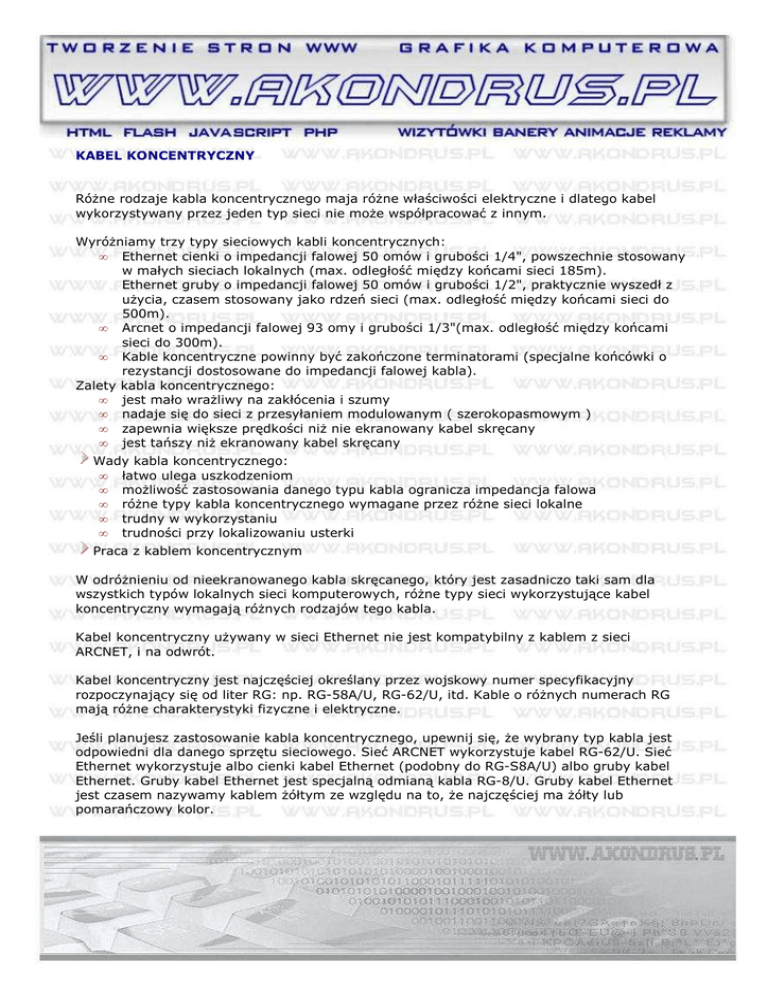 KABEL KONCENTRYCZNY RóŜne rodzaje kabla koncentrycznego maja róŜne właściwości elektryczne i dlatego kabel wykorzystywany przez jeden typ sieci nie moŜe współpracować z innym. WyróŜniamy trzy typy sieciowych kabli koncentrycznych: • Ethernet cienki o impedancji falowej 50 omów i grubości 1/4", powszechnie stosowany w małych sieciach lokalnych (max. odległość między końcami sieci 185m). Ethernet gruby o impedancji falowej 50 omów i grubości 1/2", praktycznie wyszedł z uŜycia, czasem stosowany jako rdzeń sieci (max. odległość między końcami sieci do 500m). • Arcnet o impedancji falowej 93 omy i grubości 1/3"(max. odległość między końcami sieci do 300m). • Kable koncentryczne powinny być zakończone terminatorami (specjalne końcówki o rezystancji dostosowane do impedancji falowej kabla). Zalety kabla koncentrycznego: • jest mało wraŜliwy na zakłócenia i szumy • nadaje się do sieci z przesyłaniem modulowanym ( szerokopasmowym ) • zapewnia większe prędkości niŜ nie ekranowany kabel skręcany • jest tańszy niŜ ekranowany kabel skręcany Wady kabla koncentrycznego: • łatwo ulega uszkodzeniom • moŜliwość zastosowania danego typu kabla ogranicza impedancja falowa • róŜne typy kabla koncentrycznego wymagane przez róŜne sieci lokalne • trudny w wykorzystaniu • trudności przy lokalizowaniu usterki Praca z kablem koncentrycznym W odróŜnieniu od nieekranowanego kabla skręcanego, który jest zasadniczo taki sam dla wszystkich typów lokalnych sieci komputerowych, róŜne typy sieci wykorzystujące kabel koncentryczny wymagają róŜnych rodzajów tego kabla. Kabel koncentryczny uŜywany w sieci Ethernet nie jest kompatybilny z kablem z sieci ARCNET, i na odwrót. Kabel koncentryczny jest najczęściej określany przez wojskowy numer specyfikacyjny rozpoczynający się od liter RG: np. RG-58A/U, RG-62/U, itd. Kable o róŜnych numerach RG mają róŜne charakterystyki fizyczne i elektryczne. Jeśli planujesz zastosowanie kabla koncentrycznego, upewnij się, Ŝe wybrany typ kabla jest odpowiedni dla danego sprzętu sieciowego. Sieć ARCNET wykorzystuje kabel RG-62/U. Sieć Ethernet wykorzystuje albo cienki kabel Ethernet (podobny do RG-S8A/U) albo gruby kabel Ethernet. Gruby kabel Ethernet jest specjalną odmianą kabla RG-8/U. Gruby kabel Ethernet jest czasem nazywamy kablem Ŝółtym ze względu na to, Ŝe najczęściej ma Ŝółty lub pomarańczowy kolor. Najpopularniejszym typem złącznika uŜywanym do łączenia cienkich kabli koncentrycznych (takich jak cienki Ethernet lub RG-62/U) jest złącznik BNC. Złączniki takie umoŜliwiają szybkie łączenie i rozłączanie. Dostępne są trzy typy złączników BNC: obciskane, sworzniowe i śrubowe. Złączniki obciskane dają najlepsze połączenia i powodują najmniej kłopotów w eksploatacji. Zaletą złączników sworzniowych i śrubowych jest to, Ŝe nie wymagają przy instalacji specjalnych szczypiec obciskowych lub innych narzędzi poza zwykłymi kluczami maszynowymi. Jednak koszty wynikające z kłopotów, jakie mogą powodować przy eksploatacji mogą przewaŜać nad kosztami zakupu szczypiec. Jeśli planujesz wykonywanie lub naprawę połączeń kabla koncentrycznego, zainwestuj w dobre szczypce obciskowe i urządzenie do zdejmowania izolacji z kabla. Szczypce powinny być dostosowane do uŜywanego typu kabla koncentrycznego i powinny być w stanie ściskać zarówno środkowy sworzeń połączeniowy, jak i zewnętrzną tulejkę. Instalacja złącznika BNC na kablu Standardowy obciskowy złącznik BNC składa się z trzech części: korpusu, wewnętrznego sworznia oraz tulejki (patrz Rysunek 1). Te części składowe mogą być niewymienialne pomiędzy róŜnymi typami i modelami złączników, więc lepiej nie mieszać części pochodzących od róŜnych złączników. NaleŜy się równieŜ upewnić, Ŝe stosowany złącznik jest odpowiedni do uŜywanego typu kabla koncentrycznego. Rysunek 1. Części złącznika BNC Aby zainstalować złącznik, naleŜy postępować według następujących punktów: • Nasuń tulejkę na koniec kabla (patrz Rysunek 2). Rysunek 2. Kabel koncentryczny z tulejką • Zdejmij wierzchnią izolację z końca kabla o długości nieco ponad 1 cm, usuń siatkę lub folię ekranującą z nieco ponad 0,5 cm kabla i zdejmij wewnętrzną izolację z trochę krótszego odcinka kabla (patrz Rysunek 3). Przy pomocy dobrego, trójostrzowego urządzenia do zdejmowania izolacji oraz odrobiny praktyki moŜna te czynności wykonać za jednym razem. • Wewnętrzne Ŝyłki kabla powinny być ciasno razem skręcone i nie postrzępione. Nasuń centralny sworzeń na wewnętrzną, przewodzącą część kabla (patrz Rysunek 4). Upewnij się, Ŝe wszystkie Ŝyłki wewnętrznego przewodu są wewnątrz środkowego sworznia złącznika (w razie potrzeby posłuŜ się szkłem powiększającym). Sworzeń powinien dochodzić aŜ do izolacji otaczającej wewnętrzny przewód kabla. Jeśli tak nie jest, centralny przewód wystaje za daleko lub sworzeń jest wadliwy. Rysunek 3. Kabel koncentryczny ze zdjętą izolacją Rysunek 4. Centralny sworzeń zainstalowany na kablu • Zaciśnij sworzeń na wewnętrznym przewodzie kabla przy pomocy szczypiec. Upewnij się, Ŝe Ŝadne części przewodu nie wystają na zewnątrz. Rysunek 5. Zainstalowany korpus złącznika • Zainstaluj korpus złącznika tak, aby wystający rękaw wszedł pomiędzy wewnętrzną izolację a siatkę lub folię ekranującą. Wewnętrzny sworzeń powinien trafić w otwór w korpusie złącznika (patrz Rysunek 5). Rysunek 6. Prawidłowo ustawiona tulejka • Nasuń tulejkę tak aby ściśle przylegała do korpusu złącznika (zobacz Rysunek 6). śaden kawałek przewodu ekranującego nie powinien wystawać pomiędzy korpusem złącznika a tulejką. Rysunek 7. Prawidłowo obciśnięta tulejka • Ustaw szczypce obciskowe na tulejce i zaciśnij tulejkę na kablu i złączniku. Ściśnij s