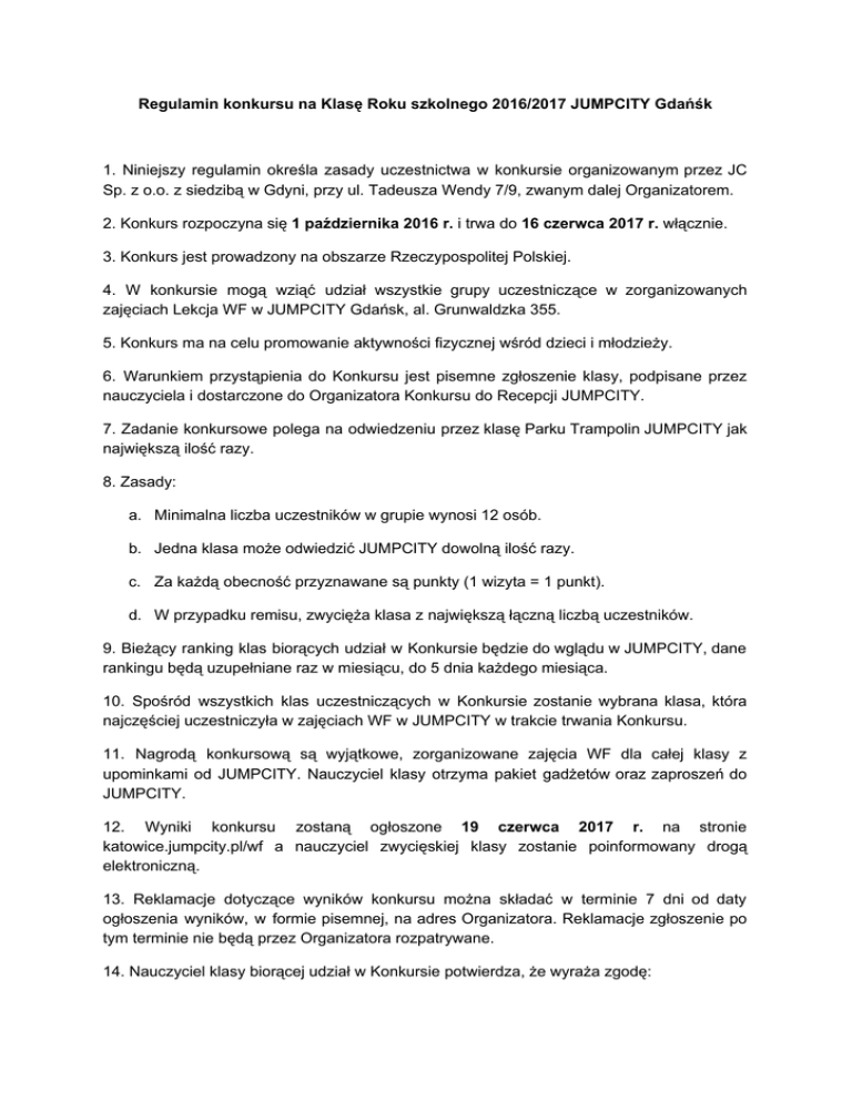 Regulamin konkursu na Klasę Roku szkolnego 2016/2017 JUMPCITY Gdańśk 1. Niniejszy regulamin określa zasady uczestnictwa w konkursie organizowanym przez JC Sp. z o.o. z siedzibą w Gdyni, przy ul. Tadeusza Wendy 7/9, zwanym dalej Organizatorem. 2. Konkurs rozpoczyna się 1 października 2016 r. i trwa do 16 czerwca 2017 r. włącznie. 3. Konkurs jest prowadzony na obszarze Rzeczypospolitej Polskiej. 4. W konkursie mogą wziąć udział wszystkie grupy uczestniczące w zorganizowanych zajęciach Lekcja WF w JUMPCITY Gdańsk, al. Grunwaldzka 355. 5. Konkurs ma na celu promowanie aktywności fizycznej wśród dzieci i młodzieży. 6. Warunkiem przystąpienia do Konkursu jest pisemne zgłoszenie klasy, podpisane przez nauczyciela i dostarczone do Organizatora Konkursu do Recepcji JUMPCITY. 7. Zadanie konkursowe polega na odwiedzeniu przez klasę Parku Trampolin JUMPCITY jak największą ilość razy. 8. Zasady: a. Minimalna liczba uczestników w grupie wynosi 12 osób. b. Jedna klasa może odwiedzić JUMPCITY dowolną ilość razy. c. Za każdą obecność przyznawane są punkty (1 wizyta = 1 punkt). d. W przypadku remisu, zwycięża klasa z największą łączną liczbą uczestników. 9. Bieżący ranking klas biorących udział w Konkursie będzie do wglądu w JUMPCITY, dane rankingu będą uzupełniane raz w miesiącu, do 5 dnia każdego miesiąca. 10. Spośród wszystkich klas uczestniczących w Konkursie zostanie wybrana klasa, która najczęściej uczestniczyła w zajęciach WF w JUMPCITY w trakcie trwania Konkursu. 11. Nagrodą konkursową są wyjątkowe, zorganizowane zajęcia WF dla całej klasy z upominkami od JUMPCITY. Nauczyciel klasy otrzyma pakiet gadżetów oraz zaproszeń do JUMPCITY. 12. Wyniki konkursu zostaną ogłoszone 19 czerwca 2017 r. na stronie katowice.jumpcity.pl/wf a nauczyciel zwycięskiej klasy zostanie poinformowany drogą elektroniczną. 13. Reklamacje dotyczące wyników konkursu można składać w terminie 7 dni od daty ogłoszenia wyników, w formie pisemnej, na adres Organizatora. Reklamacje zgłoszenie po tym terminie nie będą przez Organizatora rozpatrywane. 14. Nauczyciel klasy biorącej udział w Konkursie potwierdza, że wyraża zgodę: a. na zapisy niniejszego Regulaminu b. na umieszczenie swoich danych osobowych w adresowej bazie danych Organizatora c. na dalsze ich wykorzystanie i przetwarzanie w celach marketingowych 15. W kwestiach nieuregulowanych niniejszym Regulaminem zastosowanie mają przepisy polskiego prawa, w szczególności Kodeksu Cywilnego.