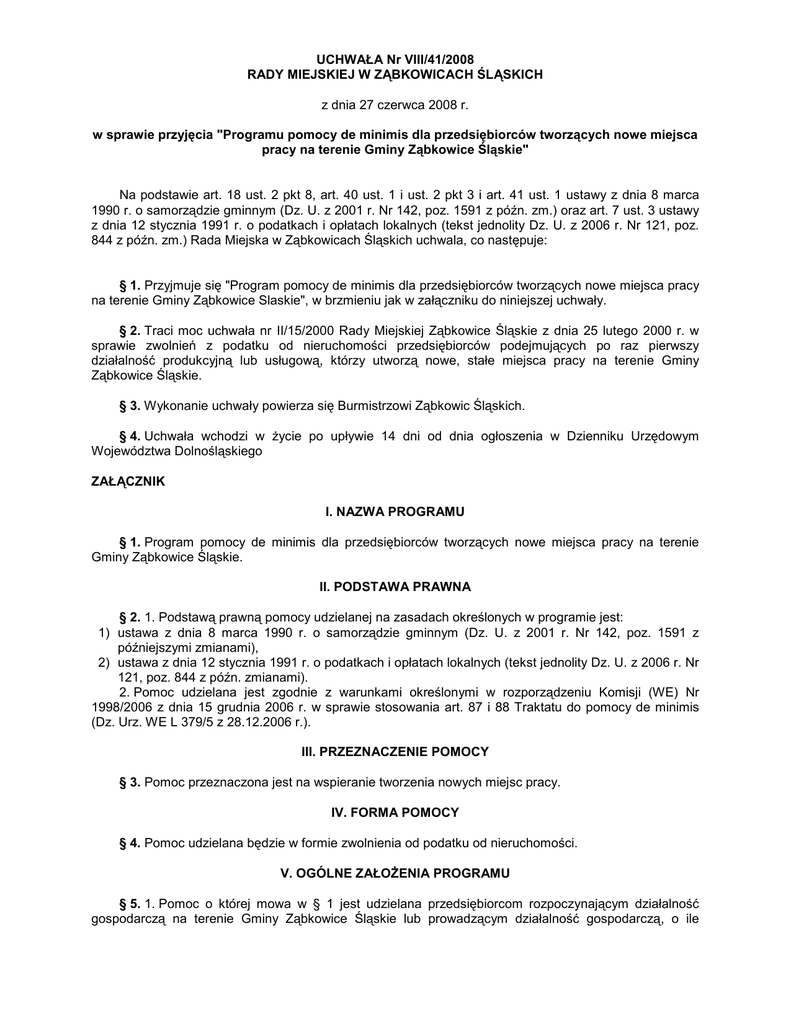 UCHWAŁA Nr VIII/41/2008 RADY MIEJSKIEJ W ZĄBKOWICACH ŚLĄSKICH z dnia 27 czerwca 2008 r. w sprawie przyjęcia "Programu pomocy de minimis dla przedsiębiorców tworzących nowe miejsca pracy na terenie Gminy Ząbkowice Śląskie" Na podstawie art. 18 ust. 2 pkt 8, art. 40 ust. 1 i ust. 2 pkt 3 i art. 41 ust. 1 ustawy z dnia 8 marca 1990 r. o samorządzie gminnym (Dz. U. z 2001 r. Nr 142, poz. 1591 z późn. zm.) oraz art. 7 ust. 3 ustawy z dnia 12 stycznia 1991 r. o podatkach i opłatach lokalnych (tekst jednolity Dz. U. z 2006 r. Nr 121, poz. 844 z późn. zm.) Rada Miejska w Ząbkowicach Śląskich uchwala, co następuje: § 1. Przyjmuje się "Program pomocy de minimis dla przedsiębiorców tworzących nowe miejsca pracy na terenie Gminy Ząbkowice Slaskie", w brzmieniu jak w załączniku do niniejszej uchwały. § 2. Traci moc uchwała nr II/15/2000 Rady Miejskiej Ząbkowice Śląskie z dnia 25 lutego 2000 r. w sprawie zwolnień z podatku od nieruchomości przedsiębiorców podejmujących po raz pierwszy działalność produkcyjną lub usługową, którzy utworzą nowe, stałe miejsca pracy na terenie Gminy Ząbkowice Śląskie. § 3. Wykonanie uchwały powierza się Burmistrzowi Ząbkowic Śląskich. § 4. Uchwała wchodzi w życie po upływie 14 dni od dnia ogłoszenia w Dzienniku Urzędowym Województwa Dolnośląskiego ZAŁĄCZNIK I. NAZWA PROGRAMU § 1. Program pomocy de minimis dla przedsiębiorców tworzących nowe miejsca pracy na terenie Gminy Ząbkowice Śląskie. II. PODSTAWA PRAWNA § 2. 1. Podstawą prawną pomocy udzielanej na zasadach określonych w programie jest: 1) ustawa z dnia 8 marca 1990 r. o samorządzie gminnym (Dz. U. z 2001 r. Nr 142, poz. 1591 z późniejszymi zmianami), 2) ustawa z dnia 12 stycznia 1991 r. o podatkach i opłatach lokalnych (tekst jednolity Dz. U. z 2006 r. Nr 121, poz. 844 z późn. zmianami). 2. Pomoc udzielana jest zgodnie z warunkami określonymi w rozporządzeniu Komisji (WE) Nr 1998/2006 z dnia 15 grudnia 2006 r. w sprawie stosowania art. 87 i 88 Traktatu do pomocy de minimis (Dz. Urz. WE L 379/5 z 28.12.2006 r.). III. PRZEZNACZENIE POMOCY § 3. Pomoc przeznaczona jest na wspieranie tworzenia nowych miejsc pracy. IV. FORMA POMOCY § 4. Pomoc udzielana będzie w formie zwolnienia od podatku od nieruchomości. V. OGÓLNE ZAŁOŻENIA PROGRAMU § 5. 1. Pomoc o której mowa w § 1 jest udzielana przedsiębiorcom rozpoczynającym działalność gospodarczą na terenie Gminy Ząbkowice Śląskie lub prowadzącym działalność gospodarczą, o ile rozszerzyli swoją działalność w sposób określony niniejszą uchwałą. 2. Przedsiębiorca może uzyskać pomoc na podstawie niniejszego programu, jeżeli jej wartość brutto, łącznie z wartością innej pomocy w ramach zasady de minimis (w rozumieniu art. 2 rozporządzenia Komisji (WE) Nr 1998/2006 z dnia 15 grudnia 2006 r. w sprawie stosowania art. 87 i 88 Traktatu do pomocy de minimis (Dz. Urz. WE L 379/5 z 28 12.2006 r.), otrzymanej przez niego w okresie 3 kolejnych lat poprzedzających dzień uzyskania planowanej pomocy, nie przekracza kwoty stanowiącej równość 200 tys. euro. 3. Całkowita wartość pomocy de minimis przyznanej jednemu przedsiębiorcy działającemu w sektorze transportu drogowego przez okres trzech lat kalendarzowych nie może przekroczyć 100 tys. euro. 4. Program nie przewiduje udzielania pomocy: 1) w sektorze rybołówstwa i akwakultury, 2) w dziedzinie produkcji podstawowej produktów rolnych wymienionych w załączniku I do Traktatu ustanawiającego Wspólnotę Europejską (Dz. Urz. UE 2002 C 325, s. 33), 3) w dziedzinie przetwarzania i wprowadzania do obrotu produktów rolnych wymienionych w załączniku I do Traktatu w następujących przypadkach: - kiedy wysokość ustalana jest na podstawie ceny lub ilości takich produktów zakupionych od producentów surowców lub wprowadzonych na rynek przez podmioty gospodarcze objęte pomocą, - kiedy przyznanie pomocy zależy od faktu jej przekazania w części lub całości producentom surowców. 4) w sektorze węglowym, 5) na działalność związaną z wywozem do państw trzecich lub państw członkowskich, tzn. pomocy bezpośrednio związanej z ilością wywożonych produktów, tworzeniem i prowadzeniem sieci dystrybucyjnej lub innymi wydatkami bieżącymi związanymi z prowadzeniem działalności eksportowej, 6) uwarunkowanej pierwszeństwem użycia towarów produkcji krajowej względem towarów importowanych, 7) na nabycie pojazdów przeznaczonych do transportu drogowego przyznawanej podmiotom gospodarczym prowadzącym działalność zarobkową w zakresie drogowego transportu towarowego, 8) podmiotom gospodarczym znajdującym się w trudnej sytuacji. § 6. Zwolnień od podatku od nieruchomości w ramach niniejszego programu nie stosuje się wobec przedsiębiorców: 1) prowadzących działalność handlową, zarówno detaliczną jak i hurtową, 2) zalegających z zapłatą zobowiązań wobec Gminy Ząbkowice Śląskie. VI. CZAS TRWANIA PROGRAMU § 7. Ustala się okres obowiązywania programu do 31.12.2013 roku. § 8. Po upływie okresu obowiązywania programu przedsiębiorcy, którzy na jego podstawie nabyli prawa do zwolnień, zachowują je przez okresy wskazane w niniejszej uchwale po spełnieniu warunków w niej określonych. VII. WARUNKI DOPUSZCZALNOŚCI POMOCY § 9. 1. Zwolnienie w podatku od nieruchomości przysługuje przedsiębiorcom prowadzącym działalność gospodarczą na terenie Gminy Ząbkowice Śląskie od gruntów, budynków i budowli lub ich części stanowiących ich własność lub przejętych w wieczyste użytkowanie, przeznaczonych na nowo utworzoną działalność gospodarczą lub rozszerzenie zakresu dotychczasowej działalności gospodarczej na terenie Gminy Ząbkowice Śląskie, zakresie produkcji lub usług wskazanych w § 9 ust. 4, w części o którą uległa zwiększeniu zajęta powierzchnia na skutek tego rozszerzenia, jeżeli w wyniku rozpoczęcia działalności gospodarczej lub