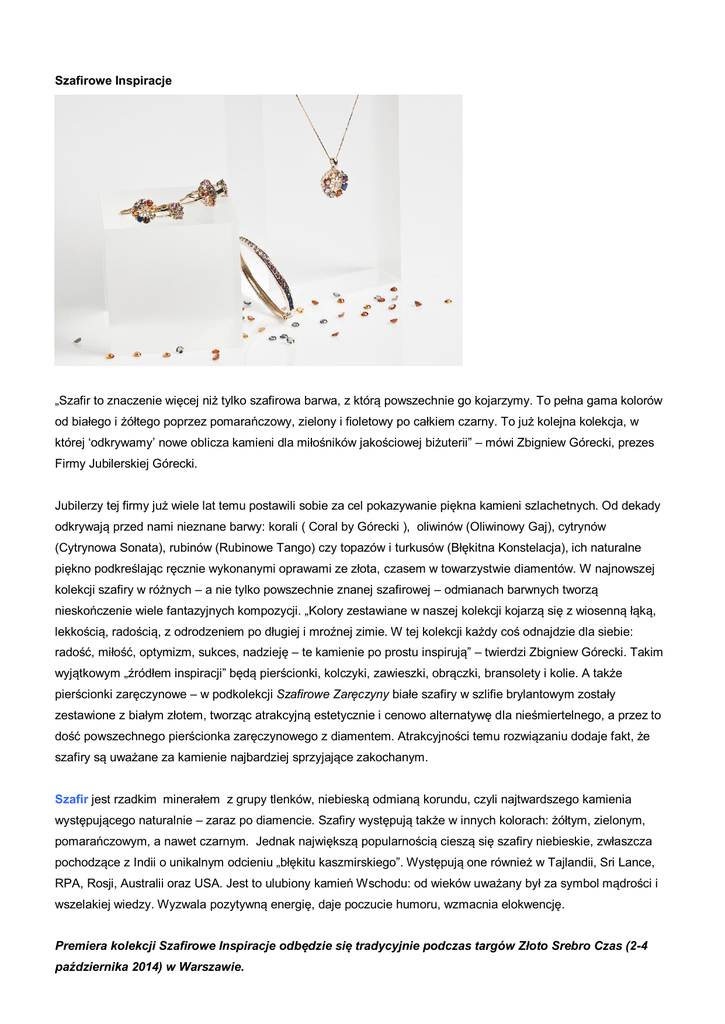 Szafirowe Inspiracje „Szafir to znaczenie więcej niż tylko szafirowa barwa, z którą powszechnie go kojarzymy. To pełna gama kolorów od białego i żółtego poprzez pomarańczowy, zielony i fioletowy po całkiem czarny. To już kolejna kolekcja, w której ‘odkrywamy’ nowe oblicza kamieni dla miłośników jakościowej biżuterii” – mówi Zbigniew Górecki, prezes Firmy Jubilerskiej Górecki. Jubilerzy tej firmy już wiele lat temu postawili sobie za cel pokazywanie piękna kamieni szlachetnych. Od dekady odkrywają przed nami nieznane barwy: korali ( Coral by Górecki ), oliwinów (Oliwinowy Gaj), cytrynów (Cytrynowa Sonata), rubinów (Rubinowe Tango) czy topazów i turkusów (Błękitna Konstelacja), ich naturalne piękno podkreślając ręcznie wykonanymi oprawami ze złota, czasem w towarzystwie diamentów. W najnowszej kolekcji szafiry w różnych – a nie tylko powszechnie znanej szafirowej – odmianach barwnych tworzą nieskończenie wiele fantazyjnych kompozycji. „Kolory zestawiane w naszej kolekcji kojarzą się z wiosenną łąką, lekkością, radością, z odrodzeniem po długiej i mroźnej zimie. W tej kolekcji każdy coś odnajdzie dla siebie: radość, miłość, optymizm, sukces, nadzieję – te kamienie po prostu inspirują” – twierdzi Zbigniew Górecki. Takim wyjątkowym „źródłem inspiracji” będą pierścionki, kolczyki, zawieszki, obrączki, bransolety i kolie. A także pierścionki zaręczynowe – w podkolekcji Szafirowe Zaręczyny białe szafiry w szlifie brylantowym zostały zestawione z białym złotem, tworząc atrakcyjną estetycznie i cenowo alternatywę dla nieśmiertelnego, a przez to dość powszechnego pierścionka zaręczynowego z diamentem. Atrakcyjności temu rozwiązaniu dodaje fakt, że szafiry są uważane za kamienie najbardziej sprzyjające zakochanym. Szafir jest rzadkim minerałem z grupy tlenków, niebieską odmianą korundu, czyli najtwardszego kamienia występującego naturalnie – zaraz po diamencie. Szafiry występują także w innych kolorach: żółtym, zielonym, pomarańczowym, a nawet czarnym. Jednak największą popularnością cieszą się szafiry niebieskie, zwłaszcza pochodzące z Indii o unikalnym odcieniu „błękitu kaszmirskiego”. Występują one również w Tajlandii, Sri Lance, RPA, Rosji, Australii oraz USA. Jest to ulubiony kamień Wschodu: od wieków uważany był za symbol mądrości i wszelakiej wiedzy. Wyzwala pozytywną energię, daje poczucie humoru, wzmacnia elokwencję. Premiera kolekcji Szafirowe Inspiracje odbędzie się tradycyjnie podczas targów Złoto Srebro Czas (2-4 października 2014) w Warszawie.