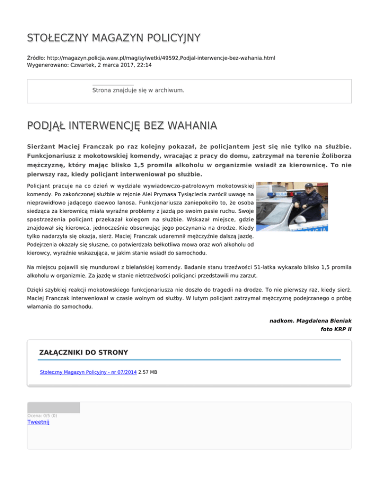 STOŁECZNY MAGAZYN POLICYJNY Źródło: http://magazyn.policja.waw.pl/mag/sylwetki/49592,Podjal-interwencje-bez-wahania.html Wygenerowano: Czwartek, 2 marca 2017, 22:14 Strona znajduje się w archiwum. PODJĄŁ INTERWENCJĘ BEZ WAHANIA Sierżant Maciej Franczak po raz kolejny pokazał, że policjantem jest się nie tylko na służbie. Funkcjonariusz z mokotowskiej komendy, wracając z pracy do domu, zatrzymał na terenie Żoliborza mężczyznę, który mając blisko 1,5 promila alkoholu w organizmie wsiadł za kierownicę. To nie pierwszy raz, kiedy policjant interweniował po służbie. Policjant pracuje na co dzień w wydziale wywiadowczo-patrolowym mokotowskiej komendy. Po zakończonej służbie w rejonie Alei Prymasa Tysiąclecia zwrócił uwagę na nieprawidłowo jadącego daewoo lanosa. Funkcjonariusza zaniepokoiło to, że osoba siedząca za kierownicą miała wyraźne problemy z jazdą po swoim pasie ruchu. Swoje spostrzeżenia policjant przekazał kolegom na służbie. Wskazał miejsce, gdzie znajdował się kierowca, jednocześnie obserwując jego poczynania na drodze. Kiedy tylko nadarzyła się okazja, sierż. Maciej Franczak udaremnił mężczyźnie dalszą jazdę. Podejrzenia okazały się słuszne, co potwierdzała bełkotliwa mowa oraz woń alkoholu od kierowcy, wyraźnie wskazująca, w jakim stanie wsiadł do samochodu. Na miejscu pojawili się mundurowi z bielańskiej komendy. Badanie stanu trzeźwości 51-latka wykazało blisko 1,5 promila alkoholu w organizmie. Za jazdę w stanie nietrzeźwości policjanci przedstawili mu zarzut. Dzięki szybkiej reakcji mokotowskiego funkcjonariusza nie doszło do tragedii na drodze. To nie pierwszy raz, kiedy sierż. Maciej Franczak interweniował w czasie wolnym od służby. W lutym policjant zatrzymał mężczyznę podejrzanego o próbę włamania do samochodu. nadkom. Magdalena Bieniak foto KRP II ZAŁĄCZNIKI DO STRONY Stołeczny Magazyn Policyjny - nr 07/2014 2.57 MB Ocena: 0/5 (0) Tweetnij