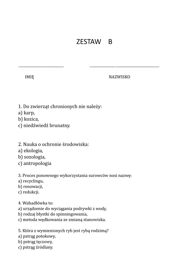 ZESTAW B ….............................................. …........................…............................................. IMIĘ NAZWISKO 1. Do zwierząt chronionych nie należy: a) karp, b) kozica, c) niedźwiedź brunatny. 2. Nauka o ochronie środowiska: a) ekologia, b) sozologia, c) antropologia 3. Proces ponownego wykorzystania surowców nosi nazwę: a) recyclingu, b) renowacji, c) redukcji. 4. Wahadłówka to: a) urządzenie do wyciągania podrywki z wody, b) rodzaj błystki do spinningowania, c) metoda wędkowania ze zmianą stanowiska. 5. Która z wymienionych ryb jest rybą rodzimą? a) pstrąg potokowy, b) pstrąg tęczowy, c) pstrąg źródlany. 6. Liczba gatunków ryb i minogów, żyjących w wodach śródlądowych naszego kraju objętych prawną ochroną gatunkową jest; a) większa niż 15 b) zawiera się w przedziale 10 –15 c ) jest mniejsza niż 10 7. Tarło węgorza europejskiego odbywa się w morzu a) Morze Barentsa b) Morze Północne c) Morze Sargassowe 8. Podaj ile wąsów posiada sum a) trzy wąsy b) sześć wąsów c) osiem wąsów 9. U których gatunków ryb występuje płetwa tłuszczowa a) szczupakowate b) sumowate c) łososiowate 10. Podaj która z ryb składa ikrę w muszli małża a) różanka b) jelec c) strzebla 11. Która z ryb ma tzw zęby gardłowe a) troć b) karp c) sandacz 12. Do czego służy rybom linia boczna a) do oddychania b) jako organ zmysłu c) ozdoba w okresie tarła 13. Z jakich urządzeń dozwolone jest wędkowanie w porze dziennej a) hydrotechnicznych b) tam i zapór wodnych służących do piętrzenia wody. c) pomostów wędkarskich, 14. Ile metrów powinna wynosić minimalna odległość pomiędzy wędkarzami łowiącymi metodą spinningową z łodzi: a) 50 metrów b) 75 metrów c) 150 metrów 15 Czy wolno stosować dodatkowe zewnętrzne obciążenia linki lub przyponu do połowu ryb metodą muchową? a) tak b) nie c) tak, ale tylko kulą wodną 16 Co to są przynęty sztuczne? a) wykonane z części roślin i zwierząt, a także imitujące owada lub jego stadia rozwojowe b) zbudowane przy pomocy sztucznych materiałów c) ciasta ze sztucznymi barwnikami 17 Czy nadmierne nęcenie może być szkodliwe dla wód? a) nie, ponieważ ryby zjadają cała zanętę b) tak, ponieważ resztki nie zjedzonej zanęty gniją i zatruwają środowisko c) nie, ponieważ są obojętne dla środowiska, nie gniją i nie pochłaniają tlenu 18 Dlaczego ścieki wpływają negatywnie na stan wody i żyjących w niej organizmów? a) ponieważ nie może powstać warstwa lodu b) ponieważ ulegają zatruciu c) ponieważ duszą się 19 Co to są zbiorniki zaporowe? a) jeziora powstałe sztucznie na terenach popowodziowych b) jeziora powstałe w wyniku zbudowania zapór na rzekach c) jeziora powstałe z zatorów wodnych np. zbudowanych przez bobry 20 Co należy zrobić w przypadku zauważenia przypadku kłusownictwa? a) zgłosić natychmiast organom ścigania: policji, straży rybackiej b) odejść z tego miejsca w obawie o własne bezpieczeństwo c) podjąć próbę czynnego przeciwdziałania 21 Co należy zrobić ze złowioną i zabraną rybą, która jest oznakowana? a) przesłać do okręgu PZW na terenie, którego została złowiona ryba, znaczek i kilka łusek z grzbietu ryby, z podaniem gatunku, długości i ciężaru oraz miejsca, daty i godziny połowu b) zachować znaczek na pamiątkę c) odnotować połów w rejestrze połowów 22 Co należy zrobić gdy złowimy ryby z widocznymi objawami choroby lub obecności pasożytów? a) wyrzucamy na brzeg lub zakopujemy b) zgłaszamy taki przypadek i oddajemy ryby do rybackiego gospodarza wód w celu podjęcia dalszego postępowania c) wrzucamy z powrotem do wody 23 Co należy zrobić z przeznaczoną do zabrania rybą złowioną pod lodem? a) zważyć i zmierzyć b) natychmiast usunąć haczyk c) uśmiercić 24 W jakiej odległości można wędkować od rozstawionych i oznakowanych sieci i innych rybackich narzędzi połowu? a) Nie mniej niż 100 m b) Nie mniej niż 50 m c) Nie mniej niż 150 m 25 W jakich typach jeziora występuje najwięcej gatunków ryb? a) w leszczowym b) w karasiowym c) w linowo-szczupakowym 26Które z wymienionych grup ryb składają ikrę na roślinności podwodnej? a) różanka, kiełb b) szczupak, leszcz, okoń c) brzana, koza 27 Która ryba posiada tylko jeden wąs? a) brzana b) miętus c) lin 28 Która grupa ryb występujących w naszej ichtiofaunie obejmuje największą liczbę gatunków? a) łososiowate b) okoniokształtne c) karpiowate 29 Czy do złowienia żywej ryby jako przynęty wędkarskiej wolno używać podrywki? a) nie b) tak , tylko podczas wędkowania c) tak, tylko z pomostu 30 Czy osoby w wieku do 14 lat mogą wędkować? a) Tak, ale wyłącznie pod opieką osoby uprawnionej do wędkowania b) Nie c) Tak, ale nie w porze nocnej KLUCZ DO ZESTAWU B 1 A , 2 A , 3 A , 4 B , 5 A , 6 A ,7 C , 8 B , 9 C , 10 A 11 B , 12 B , 13 C , 14 A , 15 B , 16 A , 17 B , 18 B , 19 B , 20 A , 21 A , 22 B, 23 C , 24 B , 25 B , 26 B, 27 B, 28 C , 29 B, 30 A