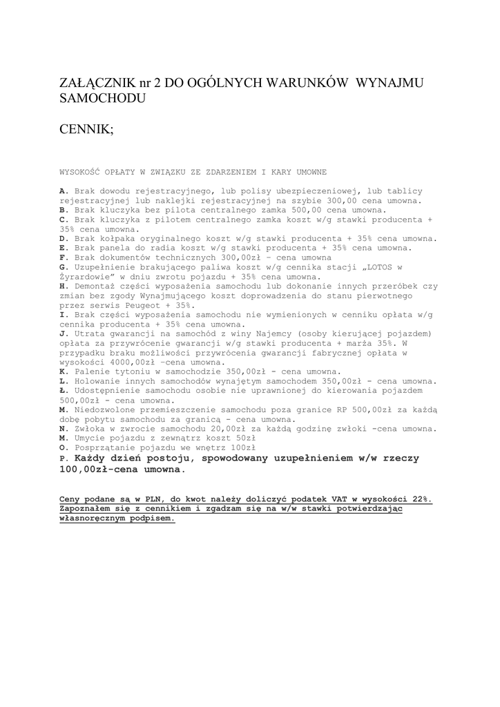 ZAŁĄCZNIK nr 2 DO OGÓLNYCH WARUNKÓW WYNAJMU SAMOCHODU CENNIK; WYSOKOŚĆ OPŁATY W ZWIĄZKU ZE ZDARZENIEM I KARY UMOWNE A. Brak dowodu rejestracyjnego, lub polisy ubezpieczeniowej, lub tablicy rejestracyjnej lub naklejki rejestracyjnej na szybie 300,00 cena umowna. B. Brak kluczyka bez pilota centralnego zamka 500,00 cena umowna. C. Brak kluczyka z pilotem centralnego zamka koszt w/g stawki producenta + 35% cena umowna. D. Brak kołpaka oryginalnego koszt w/g stawki producenta + 35% cena umowna. E. Brak panela do radia koszt w/g stawki producenta + 35% cena umowna. F. Brak dokumentów technicznych 300,00zł – cena umowna G. Uzupełnienie brakującego paliwa koszt w/g cennika stacji „LOTOS w Żyrardowie” w dniu zwrotu pojazdu + 35% cena umowna. H. Demontaż części wyposażenia samochodu lub dokonanie innych przeróbek czy zmian bez zgody Wynajmującego koszt doprowadzenia do stanu pierwotnego przez serwis Peugeot + 35%. I. Brak części wyposażenia samochodu nie wymienionych w cenniku opłata w/g cennika producenta + 35% cena umowna. J. Utrata gwarancji na samochód z winy Najemcy (osoby kierującej pojazdem) opłata za przywrócenie gwarancji w/g stawki producenta + marża 35%. W przypadku braku możliwości przywrócenia gwarancji fabrycznej opłata w wysokości 4000,00zł –cena umowna. K. Palenie tytoniu w samochodzie 350,00zł - cena umowna. L. Holowanie innych samochodów wynajętym samochodem 350,00zł - cena umowna. Ł. Udostępnienie samochodu osobie nie uprawnionej do kierowania pojazdem 500,00zł - cena umowna. M. Niedozwolone przemieszczenie samochodu poza granice RP 500,00zł za każdą dobę pobytu samochodu za granicą - cena umowna. N. Zwłoka w zwrocie samochodu 20,00zł za każdą godzinę zwłoki -cena umowna. M. Umycie pojazdu z zewnątrz koszt 50zł O. Posprzątanie pojazdu we wnętrz 100zł P. Każdy dzień postoju, spowodowany uzupełnieniem w/w rzeczy 100,00zł-cena umowna. Ceny podane są w PLN, do kwot należy doliczyć podatek VAT w wysokości 22%. Zapoznałem się z cennikiem i zgadzam się na w/w stawki potwierdzając własnoręcznym podpisem.