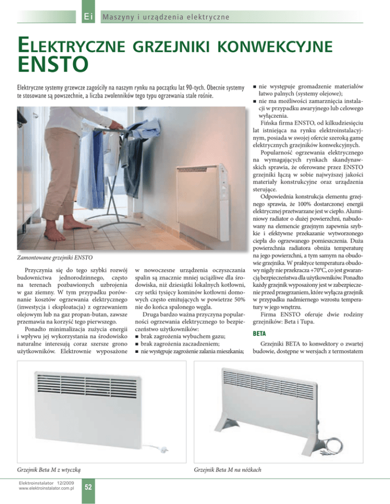 Ei Maszy n y i u r ządze nia e le ktr yczne ELEKTRYCZNE GRZEJNIKI KONWEKCYJNE ENSTO Elektryczne systemy grzewcze zagościły na naszym rynku na początku lat 90-tych. Obecnie systemy te stosowane są powszechnie, a liczba zwolenników tego typu ogrzewania stale rośnie. Zamontowane grzejniki ENSTO Przyczynia się do tego szybki rozwój budownictwa jednorodzinnego, często na terenach pozbawionych uzbrojenia w gaz ziemny. W tym przypadku porównanie kosztów ogrzewania elektrycznego (inwestycja i eksploatacja) z ogrzewaniem olejowym lub na gaz propan-butan, zawsze przemawia na korzyść tego pierwszego. Ponadto minimalizacja zużycia energii i wpływu jej wykorzystania na środowisko naturalne interesują coraz szersze grono użytkowników. Elektrownie wyposażone Grzejnik Beta M z wtyczką Elektroinstalator 12/2009 www.elektroinstalator.com.pl w nowoczesne urządzenia oczyszczania spalin są znacznie mniej uciążliwe dla środowiska, niż dziesiątki lokalnych kotłowni, czy setki tysięcy kominów kotłowni domowych często emitujących w powietrze 50% nie do końca spalonego węgla. Druga bardzo ważna przyczyna popularności ogrzewania elektrycznego to bezpieczeństwo użytkowników: brak zagrożenia wybuchem gazu; brak zagrożenia zaczadzeniem; nie występuje zagrożenie zalania mieszkania; nie występuje gromadzenie materiałów łatwo palnych (systemy olejowe); nie ma możliwości zamarznięcia instalacji w przypadku awaryjnego lub celowego wyłączenia. Fińska firma ENSTO, od kilkudziesięciu lat istniejąca na rynku elektroinstalacyjnym, posiada w swojej ofercie szeroką gamę elektrycznych grzejników konwekcyjnych. Popularność ogrzewania elektrycznego na wymagających rynkach skandynawskich sprawia, że oferowane przez ENSTO grzejniki łączą w sobie najwyższej jakości materiały konstrukcyjne oraz urządzenia sterujące. Odpowiednia konstrukcja elementu grzejnego sprawia, że 100% dostarczonej energii elektrycznej przetwarzane jest w ciepło. Aluminiowy radiator o dużej powierzchni, nabudowany na elemencie grzejnym zapewnia szybkie i efektywne przekazanie wytworzonego ciepła do ogrzewanego pomieszczenia. Duża powierzchnia radiatora obniża temperaturę na jego powierzchni, a tym samym na obudowie grzejnika. W praktyce temperatura obudowy nigdy nie przekracza +70°C, co jest gwarancją bezpieczeństwa dla użytkowników. Ponadto każdy grzejnik wyposażony jest w zabezpieczenie przed przegrzaniem, które wyłącza grzejnik w przypadku nadmiernego wzrostu temperatury w jego wnętrzu. Firma ENSTO oferuje dwie rodziny grzejników: Beta i Tupa. BETA Grzejniki BETA to konwektory o zwartej budowie, dostępne w wersjach z termostatem Grzejnik Beta M na nóżkach 52 M a s z yn y i ur ząd zen i a elek t r y czn e mechanicznym bądź elektronicznym. Wykonane są w II klasie izolacji, co eliminuje konieczność stosowania przewodu ochronnego. Każdy grzejnik ma zawiesie do zamocowania na ścianie, co sprawia, że montaż jest szybki i nieskomplikowany. Grzejniki wyposażone w termostat mechaniczny mają przewód przyłączeniowy zakończony wtyczką, a termostat reguluje temperaturę z dokładnością +/- 0,5°C. Zakres nastawy wynosi od +5°C do +30°C. Grzejniki z termostatem mechanicznym mogą być wyposażone w dodatkowe nóżki, dzięki czemu można je stosować jako przenośne źródło ciepła. Grzejniki z termostatem elektronicznym mają puszkę przyłączeniową (funkcja redukcji temp. ze skokiem co 5°C), a dokładność regulacji wynosi +/-0,1°C. Zakres nastawy wynosi od +6°C do +36 °C. Moc grzejna wynosi od 500 do 2000 W, wysokość grzejnika to 39 cm. TUPA Rodzina grzejników TUPA obejmuje trzy typy konwektorów wyposażonych w termostaty elektroniczne: TASO, LISTA oraz ROTI. Charakteryzują się dużą powierzchnią obudowy, przy mocy maksymalnej wynoszącej do 1200 W. Dzięki temu temperatura obudowy jest niska (do 60°C) i część energii cieplnej jest oddawana w postaci Ei promieniowania cieplnego z powierzchni obudowy. Wykonane są w II klasie izolacji. Przewód zasilający grzejnik zakończony jest puszką przyłączeniową, z możliwością realizacji redukcji temperatury (płynnie od 2 do 20°C). Dokładność termostatu wynosi +/- 0,1°C. W ofercie występują również grzejniki TUPA bez termostatu. Dzięki temu, przy większej liczbie grzejników w pomieszczeniu, można wykonać ogrzewanie przy pomocy jednego grzejnika z termostatem, sterującego wszystkimi pozostałymi (układ master/slave, maks. do 1900 W). Każdy grzejnik wyposażony jest w zawiesie do montażu na ścianie. Grzejniki TASO przeznaczone są do pomieszczeń suchych (IP 20). Wysokość grzejnika wynosi 40 cm, moc od 200 do 1200 W. Grzejniki LISTA mają moc od 200 do 900 W, a ich wysokość wynosi 20 cm, dzięki czemu mogą być stosowane w pomieszczeniach, gdzie przestrzeń do montażu grzejnika jest ograniczona. Są one przeznaczone do ogrzewania pomieszczeń suchych (IP 20). Grzejniki ROTI stosowane są w pomieszczeniach wilgotnych (IP24) i mają moc od 150 do 700 W, przy wysokości wynoszącej 40 cm. Piotr Gapanowicz Kierownik Regionu ENSTO Pol LISTA (IP20) Niski grzejnik pod duże okna lub na poddasze TASO (IP20) Uniwersalny grzejnik do domu i domku letniskowego ROTI (IP24) Grzejnik bryzgoszczelny do zastosowań w łazienkach, piwnicach i garażach