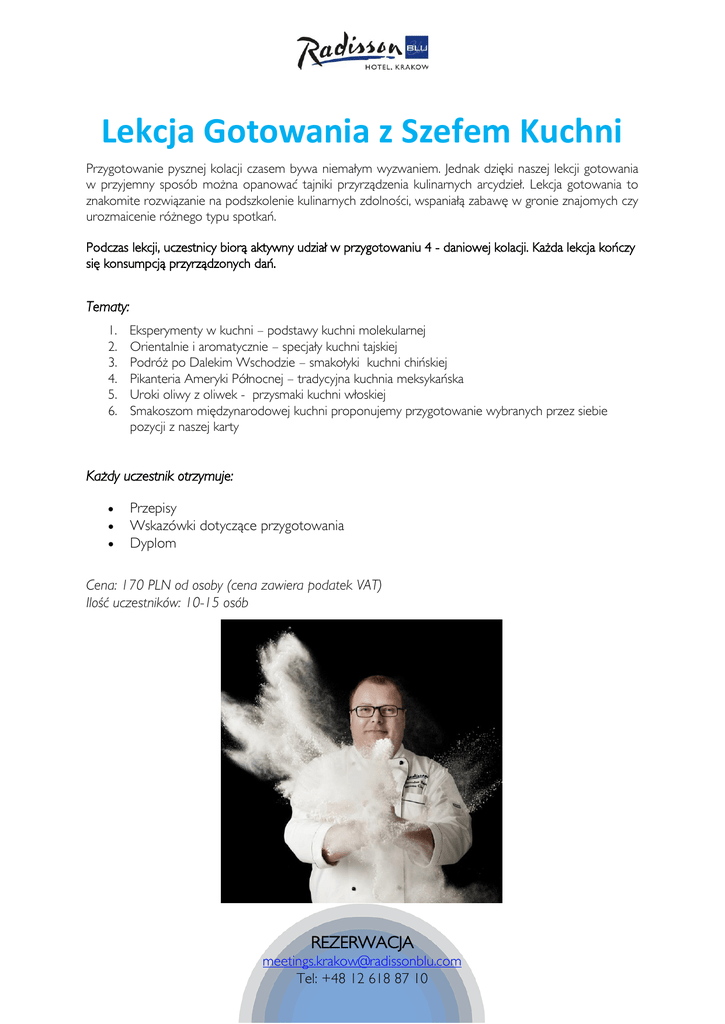 Lekcja Gotowania z Szefem Kuchni Przygotowanie pysznej kolacji czasem bywa niemałym wyzwaniem. Jednak dzięki naszej lekcji gotowania w przyjemny sposób można opanować tajniki przyrządzenia kulinarnych arcydzieł. Lekcja gotowania to znakomite rozwiązanie na podszkolenie kulinarnych zdolności, wspaniałą zabawę w gronie znajomych czy urozmaicenie różnego typu spotkań. Podczas lekcji, uczestnicy biorą aktywny udział w przygotowaniu 4 - daniowej kolacji. Każda lekcja kończy się konsumpcją przyrządzonych dań. Tematy: 1. 2. 3. 4. 5. 6. Eksperymenty w kuchni – podstawy kuchni molekularnej Orientalnie i aromatycznie – specjały kuchni tajskiej Podróż po Dalekim Wschodzie – smakołyki kuchni chińskiej Pikanteria Ameryki Północnej – tradycyjna kuchnia meksykańska Uroki oliwy z oliwek - przysmaki kuchni włoskiej Smakoszom międzynarodowej kuchni proponujemy przygotowanie wybranych przez siebie pozycji z naszej karty Każdy uczestnik otrzymuje: Przepisy Wskazówki dotyczące przygotowania Dyplom Cena: 170 PLN od osoby (cena zawiera podatek VAT) Ilość uczestników: 10-15 osób REZERWACJA [email protected] Tel: +48 12 618 87 10