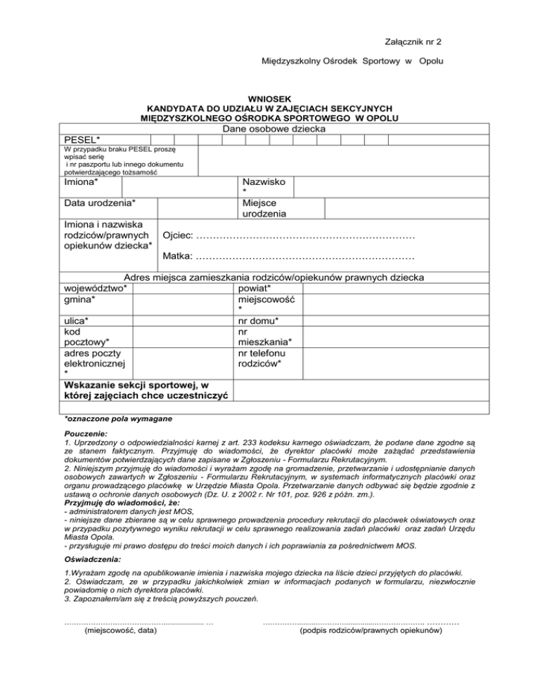 Załącznik nr 2 Międzyszkolny Ośrodek Sportowy w Opolu WNIOSEK KANDYDATA DO UDZIAŁU W ZAJĘCIACH SEKCYJNYCH MIĘDZYSZKOLNEGO OŚRODKA SPORTOWEGO W OPOLU Dane osobowe dziecka PESEL* W przypadku braku PESEL proszę wpisać serię i nr paszportu lub innego dokumentu potwierdzającego tożsamość Imiona* Nazwisko * Miejsce urodzenia Data urodzenia* Imiona i nazwiska rodziców/prawnych opiekunów dziecka* Ojciec: ………………………………………………………… Matka: ………………………………………………………… Adres miejsca zamieszkania rodziców/opiekunów prawnych dziecka województwo* powiat* gmina* miejscowość * ulica* nr domu* kod nr pocztowy* mieszkania* adres poczty nr telefonu elektronicznej rodziców* * Wskazanie sekcji sportowej, w której zajęciach chce uczestniczyć *oznaczone pola wymagane Pouczenie: 1. Uprzedzony o odpowiedzialności karnej z art. 233 kodeksu karnego oświadczam, że podane dane zgodne są ze stanem faktycznym. Przyjmuję do wiadomości, że dyrektor placówki może zażądać przedstawienia dokumentów potwierdzających dane zapisane w Zgłoszeniu - Formularzu Rekrutacyjnym. 2. Niniejszym przyjmuję do wiadomości i wyrażam zgodę na gromadzenie, przetwarzanie i udostępnianie danych osobowych zawartych w Zgłoszeniu - Formularzu Rekrutacyjnym, w systemach informatycznych placówki oraz organu prowadzącego placówkę w Urzędzie Miasta Opola. Przetwarzanie danych odbywać się będzie zgodnie z ustawą o ochronie danych osobowych (Dz. U. z 2002 r. Nr 101, poz. 926 z późn. zm.). Przyjmuję do wiadomości, że: - administratorem danych jest MOS, - niniejsze dane zbierane są w celu sprawnego prowadzenia procedury rekrutacji do placówek oświatowych oraz w przypadku pozytywnego wyniku rekrutacji w celu sprawnego realizowania zadań placówki oraz zadań Urzędu Miasta Opola. - przysługuje mi prawo dostępu do treści moich danych i ich poprawiania za pośrednictwem MOS. Oświadczenia: 1.Wyrażam zgodę na opublikowanie imienia i nazwiska mojego dziecka na liście dzieci przyjętych do placówki. 2. Oświadczam, ze w przypadku jakichkolwiek zmian w informacjach podanych w formularzu, niezwłocznie powiadomię o nich dyrektora placówki. 3. Zapoznałem/am się z treścią powyższych pouczeń. ……………………………………................... … (miejscowość, data) ……………........…………................……………….. ………… (podpis rodziców/prawnych opiekunów)
