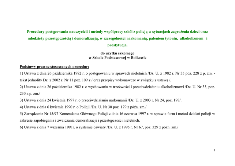 Procedury postępowania nauczycieli i metody współpracy szkół z policją w sytuacjach zagrożenia dzieci oraz młodzieży przestępczością i demoralizacją, w szczególności narkomanią, paleniem tytoniu, alkoholizmem i prostytucją. do użytku szkolnego w Szkole Podstawowej w Bolkowie Podstawy prawne stosowanych procedur: 1) Ustawa z dnia 26 października 1982 r. o postępowaniu w sprawach nieletnich /Dz. U. z 1982 r. Nr 35 poz. 228 z p. zm. tekst jednolity Dz. z 2002 r. Nr 11 poz. 109 z / oraz przepisy wykonawcze w związku z ustawą /. 2) Ustawa z dnia 26 października 1982 r. o wychowaniu w trzeźwości i przeciwdziałaniu alkoholizmowi /Dz. U. Nr 35, poz. 230 z p. zm./ 3) Ustawa z dnia 24 kwietnia 1997 r. o przeciwdziałaniu narkomanii /Dz. U. z 2003 r. Nr 24, poz. 198/. 4) Ustawa z dnia 6 kwietnia 1990 r. o Policji /Dz. U. Nr 30 poz. 179 z późn. zm./ 5) Zarządzenie Nr 15/97 Komendanta Głównego Policji z dnia 16 czerwca 1997 r. w sprawie form i metod działań policji w zakresie zapobiegania i zwalczania demoralizacji i przestępczości nieletnich. 6) Ustawa z dnia 7 września 1991r. o systemie oświaty /Dz. U. z 1996 r. Nr 67, poz. 329 z późn. zm./ 1 7) Rozporządzenie Ministra Edukacji Narodowej i sportu z dnia 31 stycznia 2003 r. w sprawie szczegółowych form działalności wychowawczej i zapobiegawczej wśród dzieci i młodzieży zagrożonych uzależnieniem /Dz. U. Nr 26, poz. 226/. Procedury postępowania nauczycieli w sytuacjach zagrożenia dzieci i młodzieży demoralizacją Podstawowym aktem prawnym regulującym zasady postępowania policji z nieletnimi sprawcami czynów karalnych jest Ustawa z dnia 26 października 1982 r. o postępowaniu w sprawach nieletnich. Policja zgodnie z art. 37 ustawy, w wypadkach nie cierpiących zwłoki zbiera i utrwala dowody czynów karalnych, w razie potrzeby dokonuje ujęcia nieletniego, a także wykonuje czynności zlecone przez sędziego rodzinnego. Dokumentem wewnętrznym uściślającym te zasady jest Zarządzenie nr 15/97 Komendanta Głównego Policji z dnia 16 czerwca 1997 r. w sprawie form i metod działań policji w zakresie zapobiegania i zwalczania demoralizacji i przestępczości nieletnich. 1 Do podejmowania działań interwencyjnych w sytuacjach kryzysowych w szkole zobowiązuje Rozporządzenie Ministra Edukacji Narodowej i Sportu z dnia 31 stycznia 2003 r. w sprawie szczegółowych form działalności wychowawczej i zapobiegawczej wśród dzieci i młodzieży zagrożonych uzależnieniem. W myśl tego dokumentu szkoły i placówki podejmują działania interwencyjne polegające na powiadomieniu rodziców i policji w sytuacjach kryzysowych, w szczególności, gdy dzieci i młodzież używają, posiadają lub rozprowadzają środki odurzające. W rozporządzeniu §10 zobowiązuje szkoły i placówki do opracowania, strategii działań wychowawczych i zapobiegawczych oraz interwencyjnych, wobec dzieci i młodzieży zagrożonej uzależnieniem. 2 Działania interwencyjne: I . W przypadku, gdy uczeń sprawia trudności wychowawcze podejmowane są następujące procedury: 1. Ustalenie przez nauczyciela i/lub wychowawcę klasy na początku roku szkolnego sposobów komunikacji z rodzicami /prawnymi opiekunami/ uwzględniających udostępnienie niezbędnych danych dotyczących miejsca pobytu i pracy rodziców /opiekunów prawnych/ oraz numerów telefonów kontaktowych. 2. Powiadomienie (telefoniczne, osobiste lub pisemne) przez wychowawcę, nauczyciela, pedagoga, wicedyrektora lub dyrektora (z zachowaniem obowiązującej w szkole drogi służbowej rodziców /prawnych opiekunów o trudnych sytuacjach wychowawczych. 3. Odnotowanie faktu powiadomienia rodziców /prawnych opiekunów ucznia w dzienniku lekcyjnym, w rubryce „Kontakty wychowawcy z rodzicami”. 4. Zgłoszenie problemów wychowawczych pedagogowi i/ lub psychologowi szkolnemu w formie ustnej lub pisemnej. 5. Objęcie opieką i wsparciem pedagogicznym i psychologicznym ucznia i jego rodziców /prawnych opiekunów. 6. W przypadku odmowy współpracy ze strony rodziców dyrektor szkoły, wicedyrektor lub pedagog zwraca się o pomoc do zewnętrznych instytucji wspierających szkołę ( np. MOPS, TPD, Sąd Rodzinny, itp.). 7. W szczególnie trudnych wychowawczo sytuacjach (brak możliwości ustalenia miejsca pobytu rodziców/prawnych opiekunów, rodzic pod wpływem alkoholu lub innych środków odurzających, itp.) dyrektor, wicedyrektor lub pedagog wnioskują do instytucji (uprawnionych z mocy prawa) o przejęcie opieki nad uczniem. II. W przypadku uzyskania informacji, że uczeń który, nie ukończył 18 lat, używa alkoholu lub innych środków w celu wprowadzenia się w stan odurzenia, uprawia nierząd, bądź przejawia inne zachowania świadczące o demoralizacji nauczyciel powinien podjąć następujące kroki: 1. Przekazać uzyskaną informację wychowawcy klasy. 2. Wychowawca informuje o fakcie pedagoga/psychologa szkolnego i dyrektora szkoły. 3 3. Wychowawca wzywa do szkoły rodziców (prawnych opiekunów) ucznia i przekazuje im uzyskaną informację. Przeprowadza rozmowę z rodzicami oraz z uczniem, w ich obecności. W przypadku potwierdzenia informacji, zobowiązuje ucznia do zaniechania negatywnego postępowania, rodziców zaś bezwzględnie do szczególnego nadzoru nad dzieckiem. W toku interwencji profilaktycznej może zaproponować rodzicom skierowanie dziecka do specjalistycznej placówki i udział dziecka w programie terapeutycznym. 4. Jeżeli rodzice odmawiają współpracy lub nie stawiają się do szkoły, a nadal z wiarygodnych źródeł napływają informacje o przejawach demoralizacji ich dziecka, dyrektor szkoły pisemnie powiadamia o zaistniałej sytuacji sąd rodzinny lub policję (specjalistę ds. nieletnich). 5. Podobnie, w sytuacji gdy, szkoła wykorzysta wszystkie dostępne jej środki oddziaływań wychowawczych, (rozmowa z rodzicami, ostrzeżenie ucznia, spotkania z pedagogiem, psychologiem, itp.), a ich zastosowanie nie przynosi oczek
