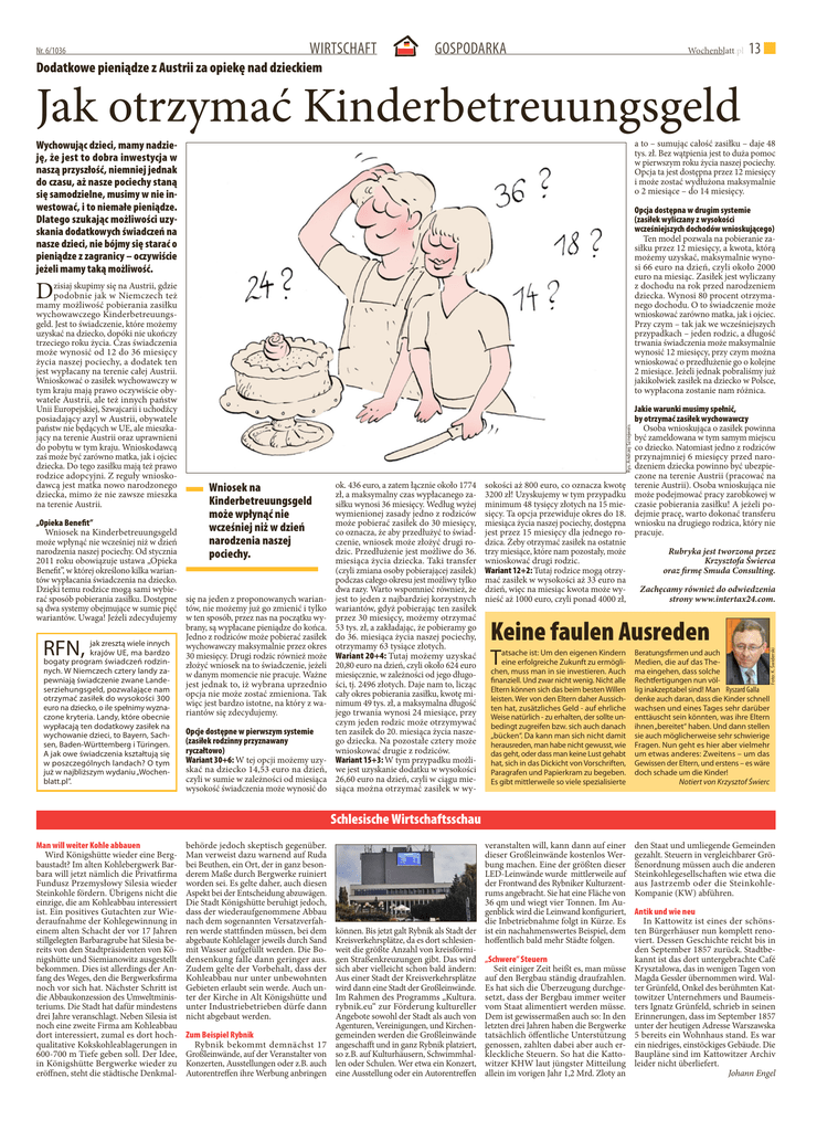 Nr. 6/1036 Wirtschaft Gospodarka Wochenblatt.pl 13 Dodatkowe pieniądze z Austrii za opiekę nad dzieckiem Jak otrzymać Kinderbetreuungsgeld a to – sumując całość zasiłku – daje 48 tys. zł. Bez wątpienia jest to duża pomoc w pierwszym roku życia naszej pociechy. Opcja ta jest dostępna przez 12 miesięcy i może zostać wydłużona maksymalnie o 2 miesiące – do 14 miesięcy. Wychowując dzieci, mamy nadzieję, że jest to dobra inwestycja w naszą przyszłość, niemniej jednak do czasu, aż nasze pociechy staną się samodzielne, musimy w nie inwestować, i to niemałe pieniądze. Dlatego szukając możliwości uzyskania dodatkowych świadczeń na nasze dzieci, nie bójmy się starać o pieniądze z zagranicy – oczywiście jeżeli mamy taką możliwość. Opcja dostępna w drugim systemie (zasiłek wyliczany z wysokości wcześniejszych dochodów wnioskującego) Ten model pozwala na pobieranie zasiłku przez 12 miesięcy, a kwota, którą możemy uzyskać, maksymalnie wynosi 66 euro na dzień, czyli około 2000 euro na miesiąc. Zasiłek jest wyliczany z dochodu na rok przed narodzeniem dziecka. Wynosi 80 procent otrzymanego dochodu. O to świadczenie może wnioskować zarówno matka, jak i ojciec. Przy czym – tak jak we wcześniejszych przypadkach – jeden rodzic, a długość trwania świadczenia może maksymalnie wynosić 12 miesięcy, przy czym można wnioskować o przedłużenie go o kolejne 2 miesiące. Jeżeli jednak pobraliśmy już jakikolwiek zasiłek na dziecko w Polsce, to wypłacona zostanie nam różnica. Wniosek na Kinderbetreuungsgeld może wpłynąć nie wcześniej niż w dzień narodzenia naszej pociechy. „Opieka Benefit” Wniosek na Kinderbetreuungsgeld może wpłynąć nie wcześniej niż w dzień narodzenia naszej pociechy. Od stycznia 2011 roku obowiązuje ustawa „Opieka Benefit”, w której określono kilka wariantów wypłacania świadczenia na dziecko. Dzięki temu rodzice mogą sami wybierać sposób pobierania zasiłku. Dostępne się na jeden z proponowanych wariansą dwa systemy obejmujące w sumie pięć tów, nie możemy już go zmienić i tylko wariantów. Uwaga! Jeżeli zdecydujemy w ten sposób, przez nas na początku wybrany, są wypłacane pieniądze do końca. Jedno z rodziców może pobierać zasiłek jak zresztą wiele innych wychowawczy maksymalnie przez okres krajów UE, ma bardzo 30 miesięcy. Drugi rodzic również może bogaty program świadczeń rodzinzłożyć wniosek na to świadczenie, jeżeli nych. W Niemczech cztery landy zaw danym momencie nie pracuje. Ważne pewniają świadczenie zwane Landejest jednak to, iż wybrana uprzednio serziehungsgeld, pozwalające nam opcja nie może zostać zmieniona. Tak otrzymać zasiłek do wysokości 300 więc jest bardzo istotne, na który z waeuro na dziecko, o ile spełnimy wyznariantów się zdecydujemy. czone kryteria. Landy, które obecnie RFN, wypłacają ten dodatkowy zasiłek na wychowanie dzieci, to Bayern, Sachsen, Baden-Württemberg i Türingen. A jak owe świadczenia kształtują się w poszczególnych landach? O tym już w najbliższym wydaniu „Wochenblatt.pl”. Opcje dostępne w pierwszym systemie (zasiłek rodzinny przyznawany ryczałtowo) Wariant 30+6: W tej opcji możemy uzyskać na dziecko 14,53 euro na dzień, czyli w sumie w zależności od miesiąca wysokość świadczenia może wynosić do ok. 436 euro, a zatem łącznie około 1774 zł, a maksymalny czas wypłacanego zasiłku wynosi 36 miesięcy. Według wyżej wymienionej zasady jedno z rodziców może pobierać zasiłek do 30 miesięcy, co oznacza, że aby przedłużyć to świadczenie, wniosek może złożyć drugi rodzic. Przedłużenie jest możliwe do 36. miesiąca życia dziecka. Taki transfer (czyli zmiana osoby pobierającej zasiłek) podczas całego okresu jest możliwy tylko dwa razy. Warto wspomnieć również, że jest to jeden z najbardziej korzystnych wariantów, gdyż pobierając ten zasiłek przez 30 miesięcy, możemy otrzymać 53 tys. zł, a zakładając, że pobieramy go do 36. miesiąca życia naszej pociechy, otrzymamy 63 tysiące złotych. Wariant 20+4: Tutaj możemy uzyskać 20,80 euro na dzień, czyli około 624 euro miesięcznie, w zależności od jego długości, tj. 2496 złotych. Daje nam to, licząc cały okres pobierania zasiłku, kwotę minimum 49 tys. zł, a maksymalna długość jego trwania wynosi 24 miesiące, przy czym jeden rodzic może otrzymywać ten zasiłek do 20. miesiąca życia naszego dziecka. Na pozostałe cztery może wnioskować drugie z rodziców. Wariant 15+3: W tym przypadku możliwe jest uzyskanie dodatku w wysokości 26,60 euro na dzień, czyli w ciągu miesiąca można otrzymać zasiłek w wy- sokości aż 800 euro, co oznacza kwotę 3200 zł! Uzyskujemy w tym przypadku minimum 48 tysięcy złotych na 15 miesięcy. Ta opcja przewiduje okres do 18. miesiąca życia naszej pociechy, dostępna jest przez 15 miesięcy dla jednego rodzica. Żeby otrzymać zasiłek na ostatnie trzy miesiące, które nam pozostały, może wnioskować drugi rodzic. Wariant 12+2: Tutaj rodzice mogą otrzymać zasiłek w wysokości aż 33 euro na dzień, więc na miesiąc kwota może wynieść aż 1000 euro, czyli ponad 4000 zł, Jakie warunki musimy spełnić, by otrzymać zasiłek wychowawczy Osoba wnioskująca o zasiłek powinna być zameldowana w tym samym miejscu co dziecko. Natomiast jedno z rodziców przynajmniej 6 miesięcy przed narodzeniem dziecka powinno być ubezpieczone na terenie Austrii (pracować na terenie Austrii). Osoba wnioskująca nie może podejmować pracy zarobkowej w czasie pobierania zasiłku! A jeżeli podejmie pracę, warto dokonać transferu wniosku na drugiego rodzica, który nie pracuje. Rubryka jest tworzona przez Krzysztofa Świerca oraz firmę Smuda Consulting. Zachęcamy również do odwiedzenia strony www.intertax24.com. Keine faulen Ausreden T atsache ist: Um den eigenen Kindern eine erfolgreiche Zukunft zu ermöglichen, muss man in si