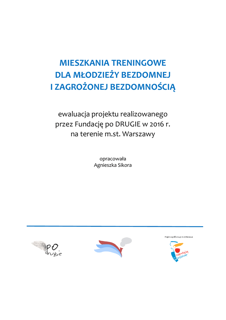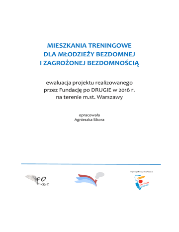 MIESZKANIA TRENINGOWE DLA MŁODZIEŻY BEZDOMNEJ I ZAGROŻONEJ BEZDOMNOŚCIĄ ewaluacja projektu realizowanego przez Fundację po DRUGIE w 2016 r. na terenie m.st. Warszawy opracowała Agnieszka Sikora SPIS TREŚCI Założenia programu str. 3 Cele programu str. 4 Metody ewaluacji str. 6 Uczestnicy str. 6 Sytuacja życiowa str. 7 Oferta str. 12 Młodzież w programie str. 14 Młode matki str. 21 Wnioski str. 23 2|Strona ZAŁOŻENIA PROGRAMU Program mieszkań treningowych realizowany w Warszawie przez Fundację po DRUGIE jest skierowany do młodzieży (18-25 lat) znajdującej się w kryzysie bezdomności. W szczególności beneficjentami działania są dziewczęta i chłopcy posiadający na swoim koncie pobyty w różnego rodzaju placówkach (opiekuńczo-wychowawczych, socjalizacyjnych i resocjalizacyjnych) oraz w rodzinach zastępczych. W ramach programu młodzież korzysta z następujących form wsparcia: zabezpieczenie sytuacji mieszkaniowej poprzez pobyt w mieszkaniu treningowym; praca nad poprawą własnej sytuacji oraz kontrola funkcjonowania w mieszkaniu zapewniane przez opiekuna mieszkania, koordynatora projektu oraz wolontariuszy organizacji; praca socjalna zapewniana przez organizację i ośrodki pomocy społecznej; wsparcie w aktywizacji zawodowej zapewniane przez organizację, urząd pracy, realizowane również poprzez włączanie młodzieży do programów innych organizacji miejskich; pomoc terapeutyczna/psychologiczna w oparciu o dostępną na terenie miasta ofertę. Każdy uczestnik programu mieszkań treningowych jest zobowiązany do przestrzegania regulaminu mieszkań, w tym m.in. do utrzymywania trzeźwości, podejmowania aktywności na rzecz poprawy własnej sytuacji (edukacja, praca, terapia), współpracy z Fundacją po DRUGIE i udziału w proponowanych działaniach dodatkowych (organizacja czasu wolnego, udział w warsztatach, programach). Pierwsze dwa tygodnie pobytu w mieszkaniu treningowym to czas, w którym kadra ma możliwość poznania nowego mieszkańca i jego potrzeb oraz rozpoznania jego sytuacji życiowej zarówno w kontekście spraw formalnych jak i osobistych. W okresie dwóch pierwszych tygodni mieszkaniec przechodzi przez tzw. okres adaptacyjny, w ramach którego jest zobowiązany do przestrzegania bardziej rygorystycznych zasad – np. zakaz przyjmowania gości, konieczność powrotu do mieszkania do godziny 20 (chyba, że pracuje). Pierwsze dwa tygodnie intensywnej pracy z uczestnikiem są również czasem 3|Strona pozwalającym sprawdzić czy jest osobą zmotywowaną i potrafiącą dostosować się do panujących reguł. Współpraca z organizacją opiera się na kontrakcie socjalnym, którym po pomyślnym przejściu przez okres adaptacyjny, zostaje objęty każdy uczestnik. Kontrakt spisywany jest przy udziale podopiecznego przez opiekuna mieszkania treningowego i zawiera spis najważniejszych zadań i celów, które powinien osiągnąć mieszkaniec oraz wszelkie informacje dotyczące jego sytuacji życiowej. Zwykle kontrakt jest weryfikowany raz na miesiąc, ale również częściej, jeśli wymaga tego indywidualna sytuacja mieszkańca. Oferta kierowana do mieszkańca jest dostosowana do jego potrzeb, uwzględnia szeroki kontekst jego funkcjonowania. Program jest dedykowany osobom rzeczywiście gotowym do podejmowania wyzwania jakim jest zmiana stylu życia, na wstępie eliminuje tych, którzy nastawieni są na zaspokojenie jedynie podstawowych potrzeb bytowych. W ramach programu realizowanego w 2016 roku Fundacja po DRUGIE dysponowała dwoma mieszkaniami wynajętymi na wolnym rynku. W każdym mieszkaniu przygotowano cztery miejsca dla uczestników – osobno dla dziewcząt i chłopców. Mieszkania były trzypokojowe, każde posiadało przestrzeń wspólną (salon, kuchnia, łazienka) oraz dwoma sypialniami wyposażonymi w dwa łóżka. Rekrutacja do projektu ma charakter ciągły i jest prowadzona w oparciu o szeroką współpracę Fundacji po DRUGIE z przedstawicielami placówek, ośrodkami pomocy społecznej, Warszawskim Centrum Pomocy Rodzinie, kuratorami, organizacjami pozarządowymi. Młodzież przyjmowana jest do programu w miarę wolnych miejsc. Kadra programu mieszkań treningowych jest objęta pracą superwizyjną odbywającą się raz w miesiącu. Dodatkowo realizowane są stałe spotkania zespołu mieszkań, które odbywają się nie rzadziej niż raz na dwa tygodnie. CELE PROGRAMU 1. Budowanie systemu wsparcia dla młodzieży dotkniętej ryzykiem bezdomności poprzez stworzenie sieci mieszkań treningowych i systemu opieki następczej. 2. Tworzenie alternatywnego środowiska dla młodzieży zagrożonej bezdomnością umożliwiającego budowanie prawidłowych relacji z otoczeniem w tym prawidłowych 4|Strona relacji z rodziną i relacji rówieśniczych poprzez umieszczenie w nowym środowisku i prowadzenie oddziaływań wychowawczych oraz działań z zakresu edukacji pozaformalnej. 3. Aktywizacja społeczna i zawodowa młodzieży poprzez prowadzenie oddziaływań pedagogicznych, pracę z doradcą zawodowym z Urzędu Pracy m.st. Warszawy, działania z zakresu edukacji pozaformalnej, dostępność narzędzi projektu Punkt Zwrotny realizowanego wspólnie z m.st. Warszawą i koncentrującego się wokół aktywizacji zawodowej. 4. Wsparcie procesu usamodzielnienia wychowanek i wychowanków realizowane we współpracy z Warszawskim Centrum Pomocy Rodzinie umożliwiające uczestnikom korzystanie ze wszystkich dostępnych systemowych narzędzi wsparcia. 5. Zapobieganie wykluczeniu i degradacji społecznej grupy objętej zadaniem poprzez prowadzone oddziaływania i zapewnienie mieszkania. 6. Zapobieganie uzależnieniom i rozwojowi przestępczości poprzez odpowiednie oddziaływania pedagogiczne jak również poprzez pomoc w znalezieniu pracy i uzyskaniu godziwych zarobków. 7. Zmniejszanie liczby beneficjentów pomocy społecznej poprzez nabywanie przez adresatów umiejętności samodzielnego funkcjonowania w społeczeństwie. 8. Współpraca war