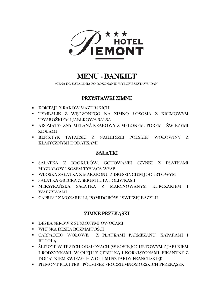 MENU - BANKIET (CENA DO USTALENIA PO DOKONANIU WYBORU ZESTAWU DAŃ) PRZYSTAWKI ZIMNE     KOKTAJL Z RAKÓW MAZURSKICH TYMBALIK Z WĘDZONEGO NA ZIMNO ŁOSOSIA Z KREMOWYM TWAROŻKIEM I JABŁKOWĄ SALSĄ AROMATYCZNY MELANŻ KRABOWY Z MELONEM, POREM I ŚWIEŻYMI ZIOŁAMI BEFSZTYK TATARSKI Z NAJLEPSZEJ POLSKIEJ WOŁOWINY Z KLASYCZNYMI DODATKAMI SAŁATKI      SAŁATKA Z BROKUŁÓW, GOTOWANEJ SZYNKI Z PŁATKAMI MIGDAŁÓW I SOSEM TYSIĄCA WYSP WŁOSKA SAŁATKA Z MAKARONU Z DRESSINGIEM JOGURTOWYM SAŁATKA GRECKA Z SEREM FETA I OLIWKAMI MEKSYKAŃSKA SAŁATKA Z MARYNOWANYM KURCZAKIEM I WARZYWAMI CAPRESE Z MOZARELLI, POMIDORÓW I SWIEŻEJ BAZYLII ZIMNE PRZEKĄSKI      DESKA SERÓW Z SUSZONYMI OWOCAMI WIEJSKA DESKA ROZMAITOŚCI CARPACCIO WOŁOWE Z PŁATKAMI PARMEZANU, KAPARAMI I RUCOLĄ ŚLEDZIE W TRZECH ODSŁONACH (W SOSIE JOGURTOWYM Z JABŁKIEM I RODZYNKAMI, W OLEJU Z CEBULKĄ I KORNISZONAMI, PIKANTNE Z DODATKIEM ŚWIEZYCH ZIÓŁ I MUSZTARDY FRANCUSKIEJ) PIEMONT PLATTER - PÓŁMISEK SRÓDZIEMNOMORSKICH PRZEKĄSEK DANIA GORĄCE        ZUPA KREM Z SEZONOWYCH WARZYW Z CHRUPIĄCYMI GRZANKAMI ŻUREK STAROPOLSKI Z JAJKIEM I BIAŁĄ KIEŁBASĄ DOPRAWIONY CHRZANEM I MAJERANKIEM MADZIARSKA ZUPA GULASZOWA BARSZCZ CZERWONY Z MIĘSNYM PASZTECIKIEM LUB GRZYBOWYM KROKIETEM GNOCCHI (WŁOSKIE KLUSECZKI ZIEMNIACZANE) ZE SZPINAKIEM I PLEŚNIOWYM SEREM TORTELLINI (WŁOSKIE PIEROŻKI) ZATOPIONE W KREMOWYM SOSIE Z SZYNKĄ I ZIELONYM GROSZKIEM MAKARON PENNE W PIKANTNYM SOSIE ARABBIATTA DANIA GŁÓWNE        DELIKATNY FILET Z ŁOSOSIA Z SALSĄ POMIDOROWĄ LUB ZAPIEKANY POD SOSEM HOLENDERSKIM SOCZYSTY FILET Z KURCZAKA NADZIEWANY SUSZONYM POMIDOREM W TOWARZYSTWIE SOSU BAZYLIOWEGO POLĘDWICZKA WIEPRZOWA PIECZONA „NA RÓŻOWO” Z SOSEM KURKOWYM KOTLET KIJOWSKI Z MASŁEM CZOSNKOWYM I NATKĄ PIETRUSZKI KOTLET SZWAJCARSKI NADZIEWANY SEREM I SZYNKĄ LUB GRZYBAMI PIECZEŃ KARKOWA KRUSZONA W BIAŁYM WINIE I ZIOŁACH Z SOSEM MYŚLIWSKIM SCHAB MARYNOWANY W PESTO I PIECZONY W CAŁOŚCI Z JABŁKAMI DODATKI DO DAŃ GŁÓWNYCH   PUSZYSTE ZIEMNIAKI PUREE, ZIEMNIAKI Z WODY Z KOPERKIEM I MASŁEM, ZIEMNIAKI PIECZONE W FOLII Z CZOSNKOWYM TWAROŻKIEM KLUSECZKI ŚLĄSKIE LUB KOPYTKA