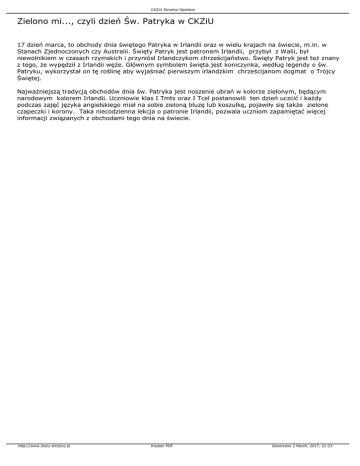 CKZiU Strzelce Opolskie Zielono mi..., czyli dzień Św. Patryka w CKZiU 17 dzień marca, to obchody dnia świętego Patryka w Irlandii oraz w wielu krajach na świecie, m.in. w Stanach Zjednoczonych czy Australii. Święty Patryk jest patronem Irlandii, przybył z Walii, był niewolnikiem w czasach rzymskich i przyniósł Irlandczykom chrześcijaństwo. Święty Patryk jest też znany z tego, że wypędził z Irlandii węże. Głównym symbolem święta jest koniczynka, według legendy o św. Patryku, wykorzystał on tę roślinę aby wyjaśniać pierwszym irlandzkim chrześcijanom dogmat o Trójcy Świętej. Najważniejszą tradycją obchodów dnia św. Patryka jest noszenie ubrań w kolorze zielonym, będącym narodowym kolorem Irlandii. Uczniowie klas I Tmts oraz I Tcel postanowili ten dzień uczcić i każdy podczas zajęć języka angielskiego miał na sobie zieloną bluzę lub koszulkę, pojawiły się także zielone czapeczki i korony. Taka niecodzienna lekcja o patronie Irlandii, pozwala uczniom zapamiętać więcej informacji związanych z obchodami tego dnia na świecie. http://www.ckziu-strzelce.pl Kreator PDF Utworzono 2 March, 2017, 21:23