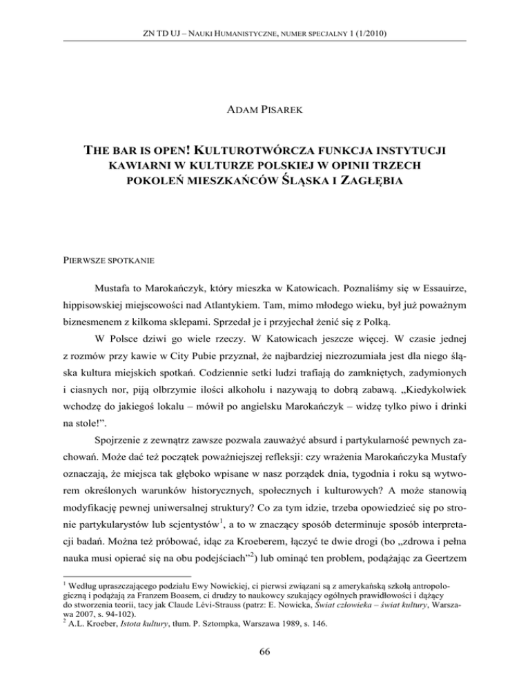 ZN TD UJ – NAUKI HUMANISTYCZNE, NUMER SPECJALNY 1 (1/2010) ______________________________________________________________________________________________________________________________________________________________________________________________________________________________________________________________________________________________________________ ADAM PISAREK THE BAR IS OPEN! KULTUROTWÓRCZA FUNKCJA INSTYTUCJI KAWIARNI W KULTURZE POLSKIEJ W OPINII TRZECH POKOLEŃ MIESZKAŃCÓW ŚLĄSKA I ZAGŁĘBIA PIERWSZE SPOTKANIE Mustafa to Marokańczyk, który mieszka w Katowicach. Poznaliśmy się w Essauirze, hippisowskiej miejscowości nad Atlantykiem. Tam, mimo młodego wieku, był już poważnym biznesmenem z kilkoma sklepami. Sprzedał je i przyjechał żenić się z Polką. W Polsce dziwi go wiele rzeczy. W Katowicach jeszcze więcej. W czasie jednej z rozmów przy kawie w City Pubie przyznał, że najbardziej niezrozumiała jest dla niego śląska kultura miejskich spotkań. Codziennie setki ludzi trafiają do zamkniętych, zadymionych i ciasnych nor, piją olbrzymie ilości alkoholu i nazywają to dobrą zabawą. „Kiedykolwiek wchodzę do jakiegoś lokalu – mówił po angielsku Marokańczyk – widzę tylko piwo i drinki na stole!”. Spojrzenie z zewnątrz zawsze pozwala zauważyć absurd i partykularność pewnych zachowań. Może dać też początek poważniejszej refleksji: czy wrażenia Marokańczyka Mustafy oznaczają, że miejsca tak głęboko wpisane w nasz porządek dnia, tygodnia i roku są wytworem określonych warunków historycznych, społecznych i kulturowych? A może stanowią modyfikację pewnej uniwersalnej struktury? Co za tym idzie, trzeba opowiedzieć się po stronie partykularystów lub scjentystów1, a to w znaczący sposób determinuje sposób interpretacji badań. Można też próbować, idąc za Kroeberem, łączyć te dwie drogi (bo „zdrowa i pełna nauka musi opierać się na obu podejściach”2) lub ominąć ten problem, podążając za Geertzem 1 Według upraszczającego podziału Ewy Nowickiej, ci pierwsi związani są z amerykańską szkołą antropologiczną i podążają za Franzem Boasem, ci drudzy to naukowcy szukający ogólnych prawidłowości i dążący do stworzenia teorii, tacy jak Claude Lévi-Strauss (patrz: E. Nowicka, Świat człowieka – świat kultury, Warszawa 2007, s. 94-102). 2 A.L. Kroeber, Istota kultury, tłum. P. Sztompka, Warszawa 1989, s. 146. 66 ADAM PISAREK – THE BAR IS OPEN!... ______________________________________________________________________________________________________________________________________________________________________________________________________________________________________________________________________________________________________________ drogą interpretatywnej teorii kultury. Interpretacja sieci znaczeń rozpiętej wokół przestrzeni kawiarni może nam odpowiedzieć na istotne pytanie: dlaczego spędziliśmy tyle lat, przesiadując w tym miejscu, skoro równie dobrze mogliśmy wybrać, na przykład, intensywny cykl ćwiczeń na siłowni? KAWIARNIANE HISTORIE Tematyka kawiarni nie zrobiła oszałamiającej kariery wśród historyków, socjologów i antropologów. Dziwi brak zainteresowania miejscem, gdzie powstało wiele wielkich koncepcji zmieniających świat nauki, polityki i kultury. W Polsce istnieje jedna tylko pozycja o zacięciu historyczno-etnograficznym. Bohdan Baranowski zajął się polską karczmą, przy okazji poszukując jej późniejszych historycznych wariantów3. Na ziemiach polskich, ale też prawdopodobnie w całej Europie, „kawiarniane historie” rozpoczęły się we wczesnym średniowieczu. Z tego okresu pochodzą wspomnienia o chatach, w których powstawał alkohol (głównie piwo i miód). Baranowski uważa, że „na pewno chętnie schodzili się tam sąsiedzi, aby popijając trunek, wesoło się zabawić”4. Wkrótce pojawiły się miejsca oferujące strawę oraz nocleg. Mowa o tabernach. Spotykali się tam najzamożniejsi mieszkańcy pobliskich osad. Miód i piwo lały się strumieniami. W niektóre dni młodzież schodziła się na zabawy taneczne5. Karczma zwykle stała w środku wsi, nieopodal kościoła. Dzięki temu parafianie od razu po mszy mogli wstąpić „na jednego”. Istniały też zajazdy na skraju osady, przy głównym trakcie. Zostały stworzone specjalnie z myślą o podróżnych. Józef Ignacy Kraszewski w bardzo zwięzły sposób podsumował, jakie było w tych czasach znaczenie karczmy: „Gdzież jest wieś bez karczmy? Byłoby to stworzenie bez głowy. Karczma bowiem jest miejscem schadzki, rady i wesela, w niej się wszystko nawiązuje i zawiązuje, w niej żal jeden drugiemu wylewa, w niej się kłócą i biją, i swarzą, i godzą – i kochają! Karczma to serce wsi”6. Drugi wątek, który poruszymy, to historia odkrycia kawy. Aby zobaczyć, jak do tego doszło, musimy udać się do Etiopii. Tam opracowano metodę prażenia i zaparzania nasion kawowca. Odkrycie rozpowszechnili Beduini w czasie swych podróży po Bliskim Wschodzie. Pierwsza kawiarnia powstała w Kairze w XVI wieku. Do Europy dotarła przez Turcję. 3 B. Baranowski, Polska karczma, restauracja i kawiarnia, Wrocław 1979. Ibidem, s. 7. 5 Ibidem, s. 9. 6 Ibidem, s. 56. 4 67 ZN TD UJ – NAUKI HUMANISTYCZNE, NUMER SPECJALNY 1 (1/2010) ______________________________________________________________________________________________________________________________________________________________________________________________________________________________________________________________________________________________________________ Słowo coffe house powstało około 1615 roku w Stambule i wiązało się z miejscem całodziennych rozmów i piciem napoju o nazwie Coffa7. A zatem Mustafa (przywołując raz jeszcze postać Marokańczyka) wychował się w kulturze, która rozpoczęła modę na kawę. Znał ten zwyczaj od małego. Codziennie widział dor