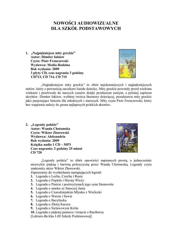 NOWOŚCI AUDIOWIZUALNE DLA SZKÓŁ PODSTAWOWYCH 1. „Najpiękniejsze mity greckie” Autor: Dimiter Inkiow Czyta: Piotr Fronczewski Wydawca: Media Rodzina Rok wydania: 2009 3 płyty CD, czas nagrania 3 godziny CD713, CD 714, CD 715 „Najpiękniejsze mity greckie” to zbiór najsłynniejszych i najpiękniejszych mitów, który z pewnością zaciekawi każde dziecko. Mity greckie powstały przed wieloma wiekami i przetrwały do naszych czasów dzięki przekazom ustnym, a później zapisom skrybów. Dimiter Inkiow, wybitny twórca literatury dziecięcej, przedstawia mity greckie jako pasjonujące historie dla młodszych i starszych. Mity czyta Piotr Fronczewski, który bez wątpienia należy do grona najlepszych polskich aktorów. 2. „Legendy polskie” Autor: Wanda Chotomska Czyta: Wiktor Zborowski Wydawca: Aleksandria Rok wydania: 2009 Książka audio 1 CD – MP3 Czas nagrania: 2 godziny 25 minut CD 720 „Legendy polskie” to zbiór opowieści napisanych prostą, a jednocześnie niezwykle piękną i barwną polszczyzną przez Wandę Chotmoską. Legendy czyta znakomity aktor Wiktor Zborowski. Zapraszamy do wysłuchania następujących legend: 1. Legenda o Lechu, Czechu i Rusie 2. Legenda o Popielu i Mysiej Wieży 3. Legenda o Piaście i postrzyżynach jego syna Siemowita 4. Legenda o smoku ze Smoczej Jamy 5. Legenda o Czarodziejskim Młynku z Wieliczki 6. Legenda o Warsie i Sawie 7. Legenda o Bazyliszku 8. Legenda o Złotej Kaczce 9. Legenda o Sielawowym Królu 10. Legenda o pięknej pasterce i księciu z Raciborza [Lektura dla klas I-III Szkoły Podstawowej]