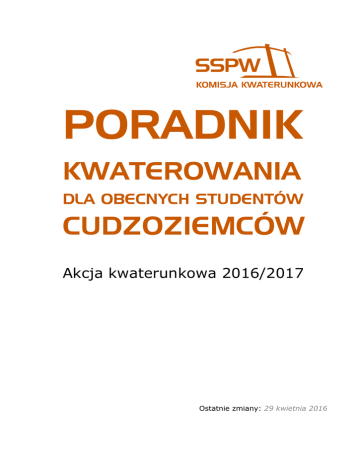 PORADNIK KWATEROWANIA DLA OBECNYCH STUDENTÓW CUDZOZIEMCÓW Akcja kwaterunkowa 2016/2017 Ostatnie zmiany: 29 kwietnia 2016 2 Akcja kwaterunkowa na rok akademicki 2016/2017 Spis treści Rejestracja w systemie .............................................................................. 4 Wnioski małżonków ................................................................................ 5 Złożenie dokumentów ............................................................................... 5 Decyzja o przyznaniu miejsca ..................................................................... 6 Odwołanie ............................................................................................. 6 Preferencje pokoju .................................................................................... 7 Mój wydział a mój akademik .................................................................... 7 Zasady przydzielania miejsc .................................................................... 8 Składanie preferencji w systemie ............................................................. 9 Decyzja o przydzieleniu konkretnego miejsca ............................................. 10 Pytania .................................................................................................. 11 Pytania ogólne ..................................................................................... 11 Rejestracja w systemie ......................................................................... 11 Złożenie dokumentów ........................................................................... 12 Preferencje pokoju ............................................................................... 13 Przydział miejsca ................................................................................. 14 Dalsze kroki ........................................................................................ 14 Kontakt z Komisją Kwaterunkowa i Wydziałową Komisją Kwaterunkową ........ 16 Ważne terminy ....................................................................................... 17 Kontakt z komisją: Fanpage Komisji Kwaterunkowej kwaterunek.sspw.pl System Studentów. Elektronicznego Kwaterowania Poradnik kwaterowania dla obecnych studentów - cudzoziemców Cześć! Jeśli czytasz ten poradnik, to najprawdopodobniej chcesz uzyskać miejsce w Domu Studenckim Politechniki Warszawskiej w akcji dla obecnych studentówcudzoziemców. Dwa pytania pozwolą sprawdzić, czy to właściwa akcja dla Ciebie! 1. Czy jesteś obywatelem Rzeczpospolitej Polskiej? Jeśli TAK – to nie jest akcja i poradnik dla Ciebie. Zapraszamy do akcji przeznaczonych dla obywateli RP. Jeśli NIE – brawo, pierwsze pytanie zaliczone, przejdź do następnego. 2. Czy jesteś aktualnie studentem studiów pierwszego lub drugiego stopnia na Politechnice Warszawskiej? Jeśli NIE – to znaczy, że wspólna droga nie jest nam pisana - ta akcja nie jest dla Ciebie. Jeśli dopiero planujesz zacząć uczyć się na Politechnice, to zapraszam Cię do wzięcia udziału w odpowiedniej akcji dla kandydatów, która rozpocznie się w wakacje! Jeśli nie zamierzasz wstąpić do grona studentów tej szacownej Uczelni, ale chciałbyś zamieszkać w jej domu studenckim – polecam zapoznać się bliżej z Bankiem Miejsc. Jeśli TAK – to świetnie, czytasz właściwi poradnik! Procedura ubiegania się o miejsce w Domu Studenckim składa się z następujących etapów: 1. Rejestracja w systemie - bez stworzenia wniosku w systemie kwaterunkowym nie możesz ubiegać się o miejsce w akademiku. 2. Złożenie dokumentów – musisz dostarczyć wniosek o akademik do dziekanatu swojego wydziału. 3. Decyzja o przyznaniu miejsca – po pewnym czasie poinformujemy Cię, czy otrzymasz miejsce w domu studenckim. 4. Preferencje pokoju - jeśli decyzja będzie pozytywna, możesz wybrać w jakim pokoju i z kim chcesz zamieszkać. 5. Decyzja o przydzieleniu konkretnego miejsca – damy znać, w którym pokoju zamieszkasz. W kolejnych rozdziałach opisaliśmy szczegółowo proces aplikowania o miejsce. Jeśli te informacje nie będą wystarczające, to na końcu poradnika znajdziesz odpowiedzi na najczęściej zadawane pytania. 3 4 Akcja kwaterunkowa na rok akademicki 2016/2017 Rejestracja w systemie Zacznijmy od najważniejszego składnika, bez którego dalsza wędrówka nie ma sensu. Jest to rejestracja w Systemie Elektronicznego Kwaterowania Studentów. System znajdziesz pod adresem: http://kwaterunek.sspw.pl Aby z niego skorzystać potrzebujesz konta w systemie Aplikacji Centralnych Samorządu Studentów PW - to to samo konto, które jest wykorzystywane także podczas dystrybucji kalendarzy akademickich, bluz PW, wyborów samorządowych na uczelni oraz oczywiście starania się o akademik. Jeśli w zeszłym roku otrzymałeś miejsce w przez system kwaterunkowy, powinieneś korzystać z tego samego konta, żeby móc skorzystać z prawa zasiedzenia. Jeśli nie masz jeszcze konta - załóż je. Sprawdź dokładnie, czy dane, które podajesz, są poprawne - w szczególności przyjrzyj się, czy bezbłędnie zapisałeś imię, nazwisko, numer PESEL oraz numer albumu. Błędne podanie tych danych może uniemożliwić Ci złożenie wniosku! Jeżeli masz już konto - zaloguj się za jego pomocą na stronie kwaterunku. Loginem jest adres e-mail podany podczas rejestracji. Po zalogowaniu czas na wybór właściwej akcji kwaterunkowej – obecni studenci – cudzoziemcy. Zrobisz to w menu rozwijanym w prawym górnym rogu. Aby złożyć wniosek, z lewego menu wybierz Wniosek o akademik. Wypełnij dokładnie wszystkie pola i sprawdź, czy wstępnie wypełnione dane są aktualne. Ewentualne błędy mogą spowodować odrzucenie wniosku. Okres zakwaterowania - podczas składania wniosku możesz wybrać czas, na jaki chcesz otrzymać miejsce w akademiku. Jeśli masz wątpliwości, czy będziesz mieszkać przez cały rok, czy wyprowadzisz się po jednym semestrze - 