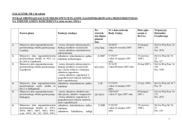 ZAŁĄCZNIK NR 1 do tekstu WYKAZ OBOWIĄZUJĄCYCH MIEJSCOWYCH PLANÓW ZAGOSPODAROWANIA PRZESTRZENNEGO NA TERENIE GMINY KOŚCIERZYNA (stan na luty 2012r.) 1. Nazwa planu Funkcja wiodąca Miejscowy plan zagospodarowania przestrzennego obrębu geodezyjnego - tereny obszarów rekreacyjnych z funkcją ośrodków wczasowych - tereny zabudowy mieszkaniowej jednorodzinnej Czarlina 2. 3. Miejscowy plan zagospodarowania przestrzennego działki nr 94/3, cz. dz. 94/4 w Częstkowie Miejscowy plan zagospodarowania przestrzennego obrębu geodezyjnego Częstkowo 4. 5. Miejscowy plan zagospodarowania przestrzennego części działki nr 60/12 w Dębogórach Miejscowy plan zagospodarowania przestrzennego obrębu geodezyjnego Dębogóry 6. zabudowa mieszkaniowa jednorodzinna wolnostojąca - tereny obszarów rekreacyjnych z funkcją ośrodków wczasowych, lasy i tereny rolnicze z istniejącą zabudową zagrodową - tereny zabudowy zagrodowej w gospodarstwach rolnych, hodowlanych i ogrodniczych zabudowa mieszkaniowa jednorodzinna - tereny zabudowy obiektów produkcyjnych, składów i magazynów - tereny zabudowy zagrodowej w gospodarstwach rolnych, hodowlanych i ogrodniczych Miejscowy plan zagospodarowania zabudowa mieszkaniowa jednoprzestrzennego działek nr: 295/5, rodzinna 295/6, 360/1, 360/2, 360/3, 305/3, zabudowa letniskowa, usługi cz.dz. 304/2, 241, 243, 350/4, 350/3, Powierzchnia objęta planem (ha) 370.7944 0.3907 823.2415 1.20 267.8673 13.808 Nr i data uchwały Rady Gminy Data ogłoszenia w Dz.Urz. Nr/pozycja Dziennika Urzędowego IX/64/07 z dnia 03 września 2007 roku 16 listopad 2007 r. Dz.Urz.Woj.Pom. Nr 154 Poz. 2876 V/192/97 z dnia 14 sierpnia 1997 roku IV/41/07 z dnia 09 marca 2007 roku 19 czerwiec 1998 r. Dz.Urz.Woj.Gd. Nr 33 Poz. 127 Dz.Urz.Woj.Pom. Nr 102 Poz. 1649 V/176/97 z dnia 14 sierpnia 1997 roku VIII/56/07 z dnia 31 lipca 2007 roku 23 luty 1998 r. Dz.Urz.Woj.Gd. Nr 7 Poz. 25 09 listopad 2007 r. Dz.Urz.Woj.Pom. Nr 152 Poz. 2852 V/187/97 z dnia 14 sierpnia 1997 roku 19 czerwiec 1998 r. Dz.Urz.Woj.Gd. Nr 33 Poz. 124 28 maj 2007 r. 1 7. 8. cz. Dz. 320, dz. 354/2, 355/2, 275/5 w Dobrogoszczy Miejscowy plan zagospodarowania przestrzennego obejmującego fragment wsi Dobrogoszcz działka geodezyjna nr 269/13 Miejscowy plan zagospodarowania przestrzennego obrębu geodezyjnego Dobrogoszcz 9. 10. 11. 12. 13. 14. 15. turystyczne zabudowa mieszkaniowa jednorodzinna - tereny zabudowy mieszkaniowej jednorodzinnej z usługami - tereny zabudowy zagrodowej w gospodarstwach rolnych, hodowlanych i ogrodniczych 0.78 429.5944 VI/98/2003 z dnia 26 września 2003 roku 16 kwiecień 2004 r. Dz.Urz.Woj.Pom. Nr 46 Poz. 892 VIII/57/07, z dnia 31 lipca 2007 roku 09 listopad 2007 r. Dz.Urz.Woj.Pom. Nr 152 Poz. 2853 Miejscowy plan zagospodarowania przestrzennego działek nr: cz. dz. 395, dz. 458, 459, 460, 461, 462, 463, 464, cz. dz. 89/34, cz. dz. 298/8 w Gostomiu. Miejscowy plan zagospodarowania przestrzennego działek nr: cz. dz. 127, cz. dz. 128, cz. dz. 135/5, dz. 133/1, cz. dz. 131/1 i dz. 134 w Gostomiu. Miejscowy plan zagospodarowania przestrzennego terenu działek Nr 75 i 283 na terenie wsi Gostomie. Miejscowy plan zagospodarowania przestrzennego terenu działki Nr 135/7 na terenie wsi Gostomie. zabudowa letniskowa 2.48 V/177/97 z dnia 14 sierpnia 1997 roku 23 luty 1998 r. Dz.Urz.Woj.Gd. Nr 7 Poz. 26 eksploatacja kopaliny pospolitej 18.56 V/175/97 z dnia 14 sierpnia 1997 roku 25 czerwiec 1998 r. Dz.Urz.Woj.Gd. Nr 36 Poz. 137 zabudowa mieszkaniowa jednorodzinna 0.70 29 październik 2002 r. zakład segregacji odpadów komunalnych i komunalno - podobnych 6.5948 IV/221/02 z dnia 24 czerwca 2002 roku V/251/02 z dnia 19 sierpnia 2002 roku Dz.Urz.Woj.Pom.Nr 71 Poz. 1572 Dz.Urz.Woj.Pom.Nr 31 Poz. 365 Miejscowy plan zagospodarowania przestrzennego terenu działki Nr 45/4 na terenie wsi Gostomie. Miejscowy plan zagospodarowania przestrzennego obrębu geodezyjnego Gostomie działalność gospodarcza – usługi gospodarcze 3.5754 V/252/02 z dnia 19 sierpnia 2002 roku VIII/271/05 z dnia 25 listopada 2005 roku 29 październik 2002 r. V/196/97 z dnia 14vsierpnia 1997 20 kwiecień1998 r. - tereny infrastruktury technicznej gospodarowania odpadami - tereny obszarów rekreacyjnych z zabudową letniskową Miejscowy plan zagospodarowania żwirownia i produkcja materiaprzestrzennego terenu działek Nr 1134.6094 54.94 03 marzec 2003 r. 29 marzec 2006 r. Dz.Urz.Woj.Pom.Nr 71 Poz. 1573 Dz.Urz.Woj.Pom.Nr 34 Poz. 696 Dz.Urz.Woj.Gd.Nr 17 2 75/12, 75/14, 24, 73/4, cz. dz. 202/5, łów budowlanych dz. 28/7, 213, 214, 215, 216, 186/2, zabudowa mieszkaniowa jedno202/2, 198/1, 191/1, 225/1, 226/1, rodzinna, rzemiosło i usługi 310/1, 227/1, 190 w Grzybowie. roku Poz. 58 16. Miejscowy plan zagospodarowania zabudowa mieszkaniowa jednoprzestrzennego terenu działek Nr: cz. rodzinna Dz. 97/7, dz. 398 i cz. Dz. 75/17 w zabudowa pensjonatowa Grzybowie 5.88 VII/226/97 z dnia 28 listopada 1997 roku 16 marzec 1998 r. Dz.Urz.Woj.Gd.Nr 10 Poz. 38 17. Miejscowy plan zagospodarowania przestrzennego fragmentu wsi Grzybowo dot. działki nr 217/1. Miejscowy plan zagospodarowania przestrzennego działki nr 184/1 w Grzybowie. Miejscowy plan zagospodarowania przestrzennego obejmującego fragmenty wsi Grzybowo, działki geodezyjne nr 180/4, 203/3. Miejscowy plan zagospodarowania przestrzennego obrębu geodezyjnego eksploatacja kruszywa 1.05 V/39/99 z dnia 11 maja 1999 roku 28 październik 1999 r. eksploatacja kruszywa 6.43 I/80/2000 z dnia 14 lutego 2000 roku 18 sierpień 2000 r. zabudowa mieszkaniowa jednorodzinna 0.4378 VI/88/2003 z dnia 26 września 2003 roku 16 luty 2004 r. Dz.Urz.Woj.Pom.Nr 113 Poz. 1029 Dz.Urz.Woj.Pom.Nr 80 Poz. 488 Dz.Urz.Woj.Pom. Nr 18 Poz. 383 X/69/07 z dnia 14 września 2007 roku 29 październik 2007 r. Dz.Urz.Woj.Pom. Nr 148 Poz. 2786 ok. 13.56 I/21/2011 z dnia 28 stycznia 2011 r. 16 marzec 2011 r. Dz.Urz.Woj.Pom.Nr 30 Poz. 655 0.53 V/189/97 z dnia 14 sierpnia 1997 roku I/106/08 z dnia 05 lutego 2008 roku 16 marzec 1998 r. Dz.