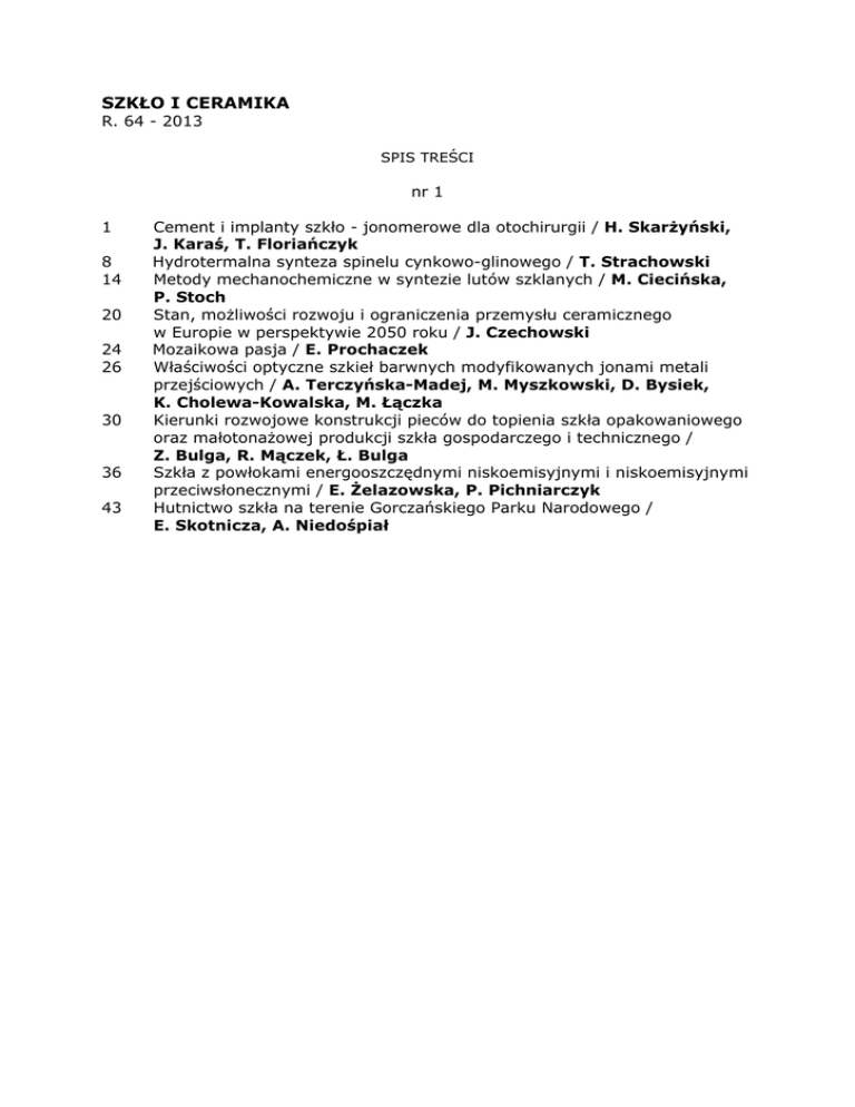SZKŁO I CERAMIKA R. 64 - 2013 SPIS TREŚCI nr 1 1 8 14 20 24 26 30 36 43 Cement i implanty szkło - jonomerowe dla otochirurgii / H. Skarżyński, J. Karaś, T. Floriańczyk Hydrotermalna synteza spinelu cynkowo-glinowego / T. Strachowski Metody mechanochemiczne w syntezie lutów szklanych / M. Ciecińska, P. Stoch Stan, możliwości rozwoju i ograniczenia przemysłu ceramicznego w Europie w perspektywie 2050 roku / J. Czechowski Mozaikowa pasja / E. Prochaczek Właściwości optyczne szkieł barwnych modyfikowanych jonami metali przejściowych / A. Terczyńska-Madej, M. Myszkowski, D. Bysiek, K. Cholewa-Kowalska, M. Łączka Kierunki rozwojowe konstrukcji pieców do topienia szkła opakowaniowego oraz małotonażowej produkcji szkła gospodarczego i technicznego / Z. Bulga, R. Mączek, Ł. Bulga Szkła z powłokami energooszczędnymi niskoemisyjnymi i niskoemisyjnymi przeciwsłonecznymi / E. Żelazowska, P. Pichniarczyk Hutnictwo szkła na terenie Gorczańskiego Parku Narodowego / E. Skotnicza, A. Niedośpiał nr 2 4 14 20 22 28 34 39 41 43 44 45 III Materiały ceramiczne dla protetyki stomatologicznej - właściwości optyczne i mikrostrukturalne wybranych materiałów cyrkonowych / Z. Jaegermann Immobilizacja nieorganicznych odpadów stałych w materiałach spiekanych / A. Zawada, J. Łęgowik, M. Strzelecka 9 Warszawskie Spotkanie Ceramiczne / D. Osiński Pęcherze gazowe w szkle / A. Kuśnierz Hydrotermalna synteza nano tlenku cynku z zastosowaniem wybranych substancji strącających / T. Strachowski Technologie nadruku wzorów na płytkach ceramicznych / B. Predoń Pobawmy się zapałkami - Festiwal Wysokich Temperatur / M. Staszczak Bolesławiecka ceramika na drodze do nowoczesności Wspomnienie: Dr Józef Szajn II Światowy Zjazd Inżynierów Polskich Stanisław Jagmin - pionier polskiej nowoczesnej ceramiki / B. Kostuch XI Zjazd Seniorów Przemysłu Szklarskiego nr 3 SZTUKA 3 O ceramice raku 6 Obrazy, które widzę, a potem trochę zmieniam / Rozmowa z Arkadiuszem Szwedem 8 Włókno szklane profesora Kazimierza Pawlaka 10 Pracownia ceramiki na warszawskiej ASP NAUKA 14 Ceramiki przezroczyste / Adam Witek 17 Ceramika peruwiańskiej kultury Moche / Marek Łasisz 20 Otrzymywanie lekkich kruszyw szklano-krystalicznych na bazie surowca perlitowego i odpadu perlitu ekspandowanego / Elżbieta Żelazowska, Paweł Pichniarczyk, Sebastian Sacha, Józef Zawiła, Joanna Rybicka-Łada 25 Karol Tichy twórca Pracowni Ceramiki ASP w Warszawie / Karolina Wolska PRZEMYSŁ 29 Wspomnienie o Jerzym Marynowskim 30 Forglass HISTORIA 32 Ignacy Ceyzik - fałszerz, zesłaniec, ceramik 34 Ilustrowany zarys dziejów ceramiki Wyżyny Armeńskiej RZEMIOSŁO 36 Czesław Seweryński - artysta ludowy, Oskar z Odrowąża LUDZIE I MIEJSCA 38 Talavera, ceramika Miasta Aniołów 40 Cztery edycje ceramicznej imprezy 42 Galeria i pracownia ceramiki w Culross W każdym wydaniu 45 Wydarzenia 46 Porady ceramiczne dla początkujących 48 Felieton 48 Kalendarium nr 4 SZTUKA 3 Patrik Illo - inteligentny design / Anita Bialic 6 Piękno w detalach / Katia Sokołowa-Zyzak 8 Z prochu ziemi / Marta Wasilczyk NAUKA 10 Skały ilaste z wybranych złóż węgli brunatnych w Polsce jako potencjalne surowce przemysłu ceramicznego / Arkadiusz Gąsiński, Ryszard Sałaciński, Marta Michalska 15 Analizy fizykochemiczne ceramicznych płytek ściennych z Pałacu Herbsta w Łodzi / Henryk Stosik 18 Kadyńscy malarze na ceramice / Barbara Pospieszna 22 Ceramika kultury Nasca / Marek Łasisz PRZEMYSŁ 26 Wprowadzanie wyrobów budowlanych do obrotu wg CPR / Alicja Papier 28 Szklany kryształ / Dariusz Osiński HISTORIA 30 Ceramika Rudolfa Krzywca / Katarzyna Liwak-Rybak 32 Historia rzeźby portretowej / Danuta Tomaszewska Saga LUDZIE I MIEJSCA 34 W poszukiwaniu idealnego wzoru / Zygmunt Brusiło 38 Azulejos / Dorota Łasisz 42 W obiektywie SiC W każdym wydaniu 43 Wydarzenia 47 Porady ceramiczne dla początkujących 48 Pamiętnik Garncarza Nowatora 48 Kalendarium nr 5 SZTUKA 3 Z inspiracji materią / Krzysztof Rozpondek 6 Szklane olbrzymy / Jordan Bulloff 8 Eshed Avital Avital / Anna 0'Bulloff NAUKA 1 Synteza i właściwości ekologicznych kompozytów spiekanych / Ilona Łęgowik, Anna Zawada 13 Synteza, właściwości barwne oraz stabilność nieorganicznych pigmentów o strukturze pirochloru / Natalia Mietła, Agnieszka Gubernat 18 Indianie Pueblo - starożytni architekci i rzemieślnicy z Utah i Kolorado / Radosław Palonka 21 Zarys historii sztuki witrażowniczej na Ziemiach Polskich / Karolina Wolska 25 Przyszłość szkła w świetle 23. Międzynarodowego Kongresu Szkła w Pradze, cz. I. / Leszek Stoch PRZEMYSŁ 27 Wielkoformatowa moda z Bolonii / Danuta Chmielewska, Monika Malinowska 28 Ceramika PRZYBORSK Sp. z o.o. / Dariusz Osiński 30 Szklane piękno z finezji / Monika Malinowska 3 Fińskie szkło / Monika Salokannei HISTORIA 34 Wypał naczyń w palenisku otwartym i archaicznych piecach / Marta Wasilczyk 36 Chan Chan / Dorota Łasisz 38 Inż. Aleksander Dobrzański - biografia do II Wojny Światowej. Część I. Pochodzenie / Ryszard Musiałowicz LUDZIE I MIEJSCA 39 Zygmunt Werstler, Mistrz Szkła / Witold Mierzejewski 40 Zaczęło się od zazdrości / Ewa Micyk 42 Najmniejszy garncarz świata / Dorota Łasisz W każdym wydaniu 43 Wydarzenia 46 English texts 47 Porady ceramiczne dla początkujących 48 Pamiętnik Garncarza Nowatora 48 Kalendarium nr 6 SZTUKA 3 Pomiędzy formą a przestrzenią / Jarosław Pajek 6 Kadr z szamotem w tle / Monika Marks-Witkowska NAUKA 8 Zastosowanie tlenku itru do budowy warstwy przymodelowej ceramicznych form odlewniczych stosowanych w odlewnictwie precyzyjnym / Marcin Małek, Paweł Wiśniewski, Hubert Matysiak, Jacek Nawrocki, Krzysztof Jan Kurzydłowski 12 Fasady szklane w budynkach energooszczędnych / Małgorzata Fedorczak-Cisak, Alicja Kowalska-Koczwara 16 Metody projektowania szkła budowlanego / Artur Piekarczuk 19 "PAXTON VOBISCUM", czyli Joseph Paxton i fenomen Kryształowego Pałacu / Pa