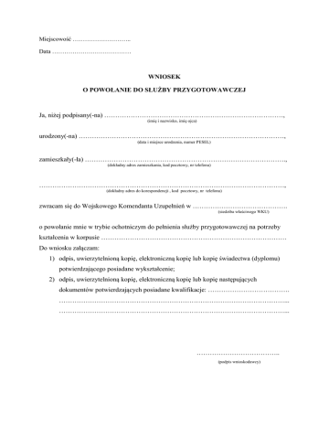 Miejscowość ……………………….. Data ………………………………… WNIOSEK O POWOŁANIE DO SŁUŻBY PRZYGOTOWAWCZEJ Ja, niżej podpisany(-na) ………………………………………………………………………, (imię i nazwisko, imię ojca) urodzony(-na) …………………………………………………………………………………, (data i miejsce urodzenia, numer PESEL) zamieszkały(-ła) ………………………………………………………………………………., (dokładny adres zamieszkania, kod pocztowy, nr telefonu) …………………………………………………………………………………………………, (dokładny adres do korespondencji , kod pocztowy, nr telefonu) zwracam się do Wojskowego Komendanta Uzupełnień w ……………………………………. (siedziba właściwego WKU) o powołanie mnie w trybie ochotniczym do pełnienia służby przygotowawczej na potrzeby kształcenia w korpusie ………………………………………………………………………… Do wniosku załączam: 1) odpis, uwierzytelnioną kopię, elektroniczną kopię lub kopię świadectwa (dyplomu) potwierdzającego posiadane wykształcenie; 2) odpis, uwierzytelnioną kopię, elektroniczną kopię lub kopię następujących dokumentów potwierdzających posiadane kwalifikacje: ………………………………. …………………………………………………………………………………………... …………………………………………………………………………………………... ……………………………….. (podpis wnioskodawcy)