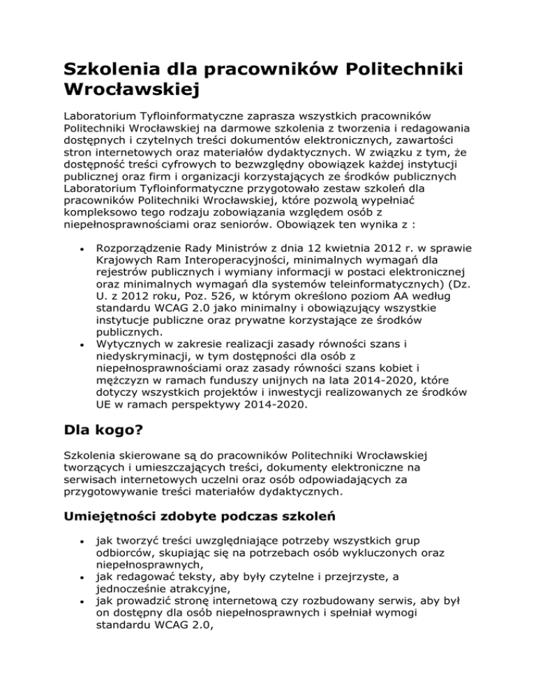 Szkolenia dla pracowników Politechniki Wrocławskiej Laboratorium Tyfloinformatyczne zaprasza wszystkich pracowników Politechniki Wrocławskiej na darmowe szkolenia z tworzenia i redagowania dostępnych i czytelnych treści dokumentów elektronicznych, zawartości stron internetowych oraz materiałów dydaktycznych. W związku z tym, że dostępność treści cyfrowych to bezwzględny obowiązek każdej instytucji publicznej oraz firm i organizacji korzystających ze środków publicznych Laboratorium Tyfloinformatyczne przygotowało zestaw szkoleń dla pracowników Politechniki Wrocławskiej, które pozwolą wypełniać kompleksowo tego rodzaju zobowiązania względem osób z niepełnosprawnościami oraz seniorów. Obowiązek ten wynika z : • • Rozporządzenie Rady Ministrów z dnia 12 kwietnia 2012 r. w sprawie Krajowych Ram Interoperacyjności, minimalnych wymagań dla rejestrów publicznych i wymiany informacji w postaci elektronicznej oraz minimalnych wymagań dla systemów teleinformatycznych) (Dz. U. z 2012 roku, Poz. 526, w którym określono poziom AA według standardu WCAG 2.0 jako minimalny i obowiązujący wszystkie instytucje publiczne oraz prywatne korzystające ze środków publicznych. Wytycznych w zakresie realizacji zasady równości szans i niedyskryminacji, w tym dostępności dla osób z niepełnosprawnościami oraz zasady równości szans kobiet i mężczyzn w ramach funduszy unijnych na lata 2014-2020, które dotyczy wszystkich projektów i inwestycji realizowanych ze środków UE w ramach perspektywy 2014-2020. Dla kogo? Szkolenia skierowane są do pracowników Politechniki Wrocławskiej tworzących i umieszczających treści, dokumenty elektroniczne na serwisach internetowych uczelni oraz osób odpowiadających za przygotowywanie treści materiałów dydaktycznych. Umiejętności zdobyte podczas szkoleń • • • jak tworzyć treści uwzględniające potrzeby wszystkich grup odbiorców, skupiając się na potrzebach osób wykluczonych oraz niepełnosprawnych, jak redagować teksty, aby były czytelne i przejrzyste, a jednocześnie atrakcyjne, jak prowadzić stronę internetową czy rozbudowany serwis, aby był on dostępny dla osób niepełnosprawnych i spełniał wymogi standardu WCAG 2.0, • jak tworzyć dokumenty elektroniczne w pełni zaprojektowane uniwersalnie. Jak można się zgłosić na szkolenia? Aby zgłosić się na wybrane przez Państwa szkolenie wystarczy przesłać drogą e-mailową pod adres: [email protected] informację o wybranym temacie szkolenia oraz terminie. 1. Szkolenie: "Redagowanie dostępnej treści stron WWW: o 12-12-2016 od: 10.00 do 13.00 2. Szkolenie tworzenie dostępnych dokumentów elektronicznych: o 13-12-2016 od: 10.00 do 13.00 W przypadku jakichkolwiek pytań zapraszamy do kontaktu telefonicznego: 71 320-36-49. Szczegółowe informacje dotyczące szkolenia: "Redagowanie dostępnej treści stron WWW Termin i miejsce szkolenia Szkolenia z redagowania dostępnych treści stron internetowych odbędą się w terminach: • 12-12-2016 od: 10.00 do 13.00 Szkolenia odbywać będą się w Centrum Wiedzy i Informacji Naukowo Technicznej Politechniki Wrocławskiej Bibliotech, bud. D21, p. 007 Ramowy program szkolenia 1. Krótki wstęp: o Czym jest dostępność? o Wykluczenie społeczne (e-wykluczenie) i jak mu zapobiegać? o Dostępność w świetle praw RP: Konstytucja i inne przepisy; o Dostepność w świetle praw międzynarodowych; o Przedstawienie Rozporządzenia Rady Ministrów z dnia 12 kwietnia 2012 r; o Przedstawienie, w jaki sposób osoby niepełnosprawne radzą sobie z wykorzystaniem komputerów i urządzeń mobilnych (zapoznanie z programami odczytującymi / powiększającymi, monitorami brajlowskimi, technologiami wspierającymi na urządzeniach mobilnych. 2. Użytkownicy narażeni na wykluczenie cyfrowe (przedstawienie barier dostępności na ich drodze): o Niewidomi i niedowidzący; o Niesłyszący; o Niepełnosprawni ruchowo oraz osoby starsze; o Niepełnosprawni korzystający z urządzeń mobilnych. 3. Rozwiązania problemów z dostępnością (normy międzynarodowe): ISO: Guidance on software accessibility oraz ISO/IEC 40500:2012 – WCAG 2.0. 4. Omówienie wszystkich (61) kryteriów sukcesu podzielonych na cztery główne zasady WCAG 2.0: o Postrzegalność, o Funkcjonalność, o Zrozumiałość, o Rzetelność. 5. Dobre praktyki w tworzeniu stron WWW dostępnych dla osób z niepełnosprawnością: o Odpowiedniki tekstowe dla elementów graficznych, o Etykiety pól formularzy, o Użycie nagłówków, o Użycie list, o Kontrast, o Jednoznaczne tytuły stron, o Zasady tworzenia linków, o Obsługa serwisu za pomocą klawiatury, o Zaznaczenie aktywnych elementów, o Kolejność informacji, o Bezpośredni dostęp, o Dostęp do informacji na różne sposoby, o Dodatkowe ułatwienia, o Semantyczny kod HTML, o Rzetelny kod HTML i CSS, o Prawidłowe ukrywanie treści. 6. Uniwersalne projektowanie – szersze omówienie: o Zalety i wady odrębnych rozwiązań dla użytkowników pełnosprawnych i niepełnosprawnych. o Wady i zalety jednego rozwiązania dla wszystkich grup użytkowników. 7. Porady i odpowiedzi na pytania uczestników szkolenia. Szczegółowe informacje dotyczące szkolenia: Tworzenie dostępnych dokumentów elektronicznych Na szkoleniu przeprowadzonym w Laboratorium Tyfloinformatycznym zostaną omówione specyfiki dokumentów dostępnych dla osób niepełnosprawnych, opisy narzędzi i technik umożliwiających tworzenie treści dla osób o specjalnych potrzebach oraz seniorów. Szkolenie adresowane jest głównie do osób zajmujących się na naszej uczelni sporządzaniem i dystrybucją dokumentów elektronicznych, elektronicznych kopii dokumentów papierowych, pracowników digitalizujących dokumenty archiwalne, autorów korespondencji elektronicznej, zwłaszcza pracowników administracyjnych, pracowników dydaktycznych, doktorantów. Termin i miejsce szkolenia Szkolenia z tworzenia dostępnych dokum