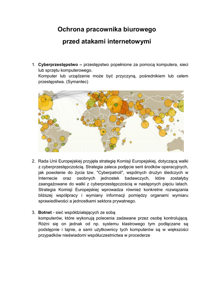 Ochrona pracownika biurowego przed atakami internetowymi 1. Cyberprzestępstwo – przestępstwo popełnione za pomocą komputera, sieci lub sprzętu komputerowego. Komputer lub urządzenie może być przyczyną, pośrednikiem lub celem przestępstwa. (Symantec) 2. Rada Unii Europejskiej przyjęła strategię Komisji Europejskiej, dotyczącą walki z cyberprzestępczością. Strategia zaleca podjęcie serii środków operacyjnych, jak powołanie do życia tzw. "Cyberpatroli", wspólnych drużyn śledczych w Internecie oraz osobnych jednostek badawczych, które zostałyby zaangażowane do walki z cyberprzestępczością w następnych pięciu latach. Strategia Komisji Europejskiej wprowadza również konkretne rozwiązania bliższej współpracy i wymiany informacji pomiędzy organami wymiaru sprawiedliwości a jednostkami sektora prywatnego. 3. Botnet - sieć współdziałających ze sobą komputerów, które wykonują polecenia zadawane przez osobę kontrolującą. Różni się on jednak od np. systemu klastrowego tym podłączane są podstępnie i tajnie, a sami użytkownicy tych komputerów są w większości przypadków nieświadomi współuczestnictwa w procederze Scentralizowany botnet Zdecentralizowany botnet Staytystyki Metody infekcji • • • • SQL injection Komunikatory internetowe Podejrzane strony Atak słownikowy (123456, haslo, qwerty, 12345, abc123, test) Wynajem: ~ 700 zł - xx 000 maszyn 1000 - 2 500 zł - x00 000 maszyn Spam to niechciane lub niepotrzebne wiadomości elektroniczne Istotą spamu jest rozsyłanie dużej ilości informacji o jednakowej treści do nieznanych sobie osób. Nie ma znaczenia, jaka jest treść tych wiadomości. Aby określić wiadomość mianem spamu, musi ona spełnić trzy następujące warunki jednocześnie: Treść wiadomości jest niezależna od tożsamości odbiorcy. Odbiorca nie wyraził uprzedniej, zamierzonej zgody na otrzymanie tej wiadomości. Treść wiadomości daje podstawę do przypuszczeń, iż nadawca wskutek jej wysłania może odnieść zyski nieproporcjonalne w stosunku do korzyści odbiorcy. Medycyna – 75% Podróbki – 20% Phishing – 4% Wirusy ~ 1% Pierwszy spam: 3 maja 1978 ● Aktualnie: 75% - 95% wiadomości to SPAM ● ok. 150 miliardów dziennie ● 75% SPAMu – ok. 3 sieci botnet ● 90% SPAMu – ok. 7 sieci botnet PHISHING - wyłudzanie poufnych informacji osobistych (np. haseł lub szczegółów karty kredytowej) przez podszywanie się pod godną zaufania osobę lub instytucję, której te informacje są pilnie potrzebne. Jest to rodzaj ataku opartego na inżynierii społecznej. (Wikipedia) UWAGA !!! ŚWIĘTA !!! Jak donosi AVG Technologies, prawie 75% internautów bez zastanowienia otwiera elektroniczne kartki, jeśli tylko w polu nadawca widnieje imię i nazwisko znanej im osoby. Jeżeli jedynie 0,1% wysłanych w tym roku elektronicznych kartek z życzeniami będzie zarażonych wirusem lub złośliwym kodem, oznaczać to będzie dziesiątki tysięcy zainfekowanych komputerów. Phishing – a klienci banków Do tej pory rozpoznano 175 000 zagrożeń czyhających na użytkowników Androida. Przewidywania wskazują, że w przyszłym roku będzie ich już ćwierć miliona. DDOS - (ang. Distributed Denial of Service) - atak na system komputerowy lub usługę sieciową w celu uniemożliwienia działania poprzez zajęcie wszystkich wolnych zasobów, przeprowadzany równocześnie z wielu komputerów (np. zombie). Atak DDoS jest odmianą ataku DOS polegającą na jednoczesnym atakowaniu ofiary z wielu miejsc. Służą do tego najczęściej komputery, nad którymi przejęto kontrolę przy użyciu specjalnego oprogramowania (Wikipedia) Skimming to przestępstwo polegające na nielegalnym skopiowaniu zawartości paska magnetycznego karty płatniczej bez wiedzy jej posiadacza w celu wytworzenia kopii i wykonywania nieuprawnionych płatności za towary i usługi, lub wypłat z bankomatów. Ponieważ skopiowana karta w systemach elektronicznych-bankowych zachowuje się jak karta oryginalna, wszystkie operacje wykonane przy jej pomocy odbywają się kosztem posiadacza oryginalnej karty i obciążają jego rachunek. Szczególnie często skimming zdarza się w barach, restauracjach i na stacjach benzynowych oraz wszędzie tam gdzie, karta znika choćby na chwile z pola widzenia klienta. Karta jest kopiowana przez sprzedawcę, który współpracuje z przestępcami lub sam jest przestępcą. CLICKJACKING - cyberprzestępca może wymusić kliknięcie dowolnego obiektu na odpowiednio spreparowanej stronie, mimo że użytkownik nic nie będzie o tym wiedział. Podatność ta dotyczy wszystkich znaczących przeglądarek: Mozilla Firefoksa, Internet Explorera, Safari, Opery oraz wtyczki Adobe Flash. To „fundamentalny błąd w sposobie, w jaki przeglądarka działa”, i nie można go rozwiązać za pomocą prostej łatki. Trojan – polega na zaaplikowaniu dedykowanego oprogramowania na komputerzeofierze, które pozwala krakerowi na zdalną kontrolę. Z reguły takie konie trojańskie po uruchomieniu nasłuchują połączeń przychodzących od agresora, aczkolwiek nic nie stoi na przeszkodzie, aby komunikowały się one w inny sposób – choćby przez IRCa czy Gadu-Gadu – wtedy są onę klientami w rozumowaniu sieciowym; Exploity – są to metody wykorzystujące dziury w oprogramowaniu, które często pozwalają na wstrzyknięcie i uruchomienie obcego kodu. Ataki tego typu należą do najniebezpieczniejszych, bowiem teoretycznie narażone są aplikacje uruchomione z konta uprzywilejowanego użytkownika, z reguły jednak serwisy działają pod ograniczonymi uprawnieniami, co więcej znalezienie takiej luki jest trudne, a jeśli do tego dojdzie, to wadliwe oprogramowanie jest łatane Najczęstsze błędy konfigurowania sieci bezprzewodowych: • • • • • włączone rozgłaszanie ESSID (Extended Service Set ID) na koncentratorze (AP) - agresor może poznać nazwę naszej sieci co umożliwia mu łatwe podpięcie się 