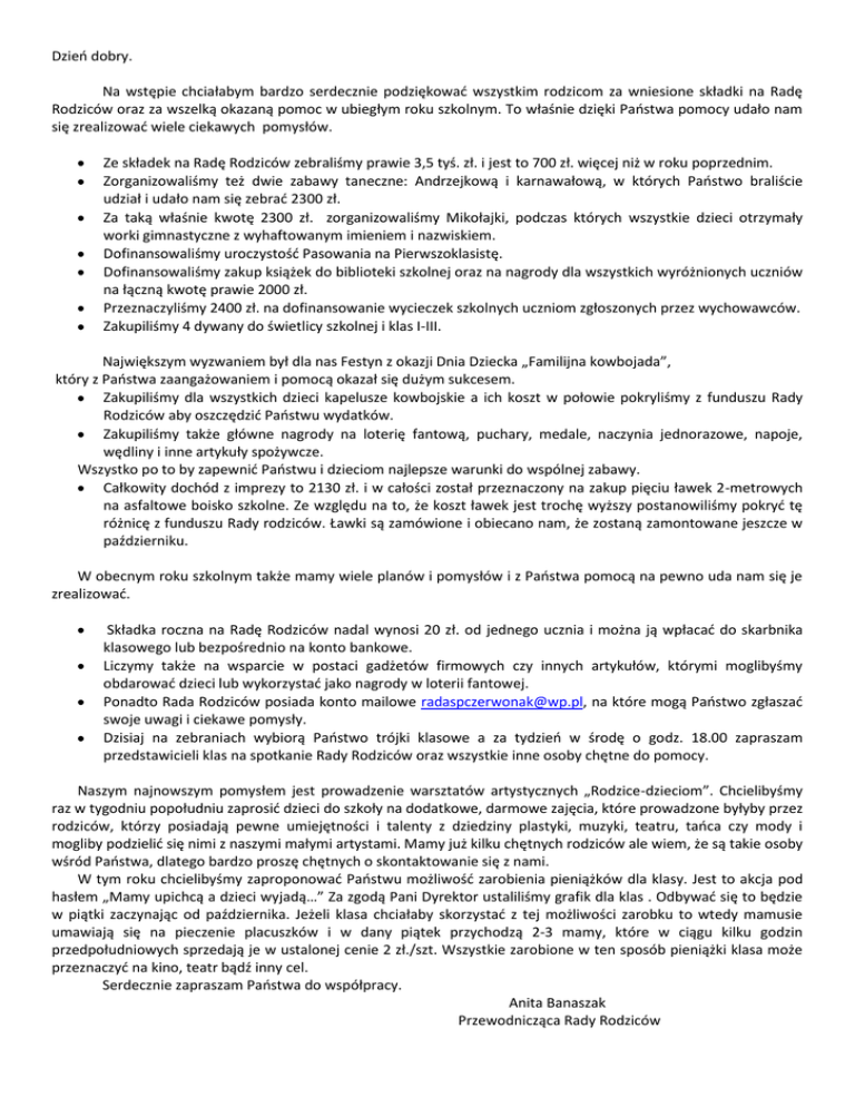 Dzieo dobry. Na wstępie chciałabym bardzo serdecznie podziękowad wszystkim rodzicom za wniesione składki na Radę Rodziców oraz za wszelką okazaną pomoc w ubiegłym roku szkolnym. To właśnie dzięki Paostwa pomocy udało nam się zrealizowad wiele ciekawych pomysłów. Ze składek na Radę Rodziców zebraliśmy prawie 3,5 tyś. zł. i jest to 700 zł. więcej niż w roku poprzednim. Zorganizowaliśmy też dwie zabawy taneczne: Andrzejkową i karnawałową, w których Paostwo braliście udział i udało nam się zebrad 2300 zł. Za taką właśnie kwotę 2300 zł. zorganizowaliśmy Mikołajki, podczas których wszystkie dzieci otrzymały worki gimnastyczne z wyhaftowanym imieniem i nazwiskiem. Dofinansowaliśmy uroczystośd Pasowania na Pierwszoklasistę. Dofinansowaliśmy zakup książek do biblioteki szkolnej oraz na nagrody dla wszystkich wyróżnionych uczniów na łączną kwotę prawie 2000 zł. Przeznaczyliśmy 2400 zł. na dofinansowanie wycieczek szkolnych uczniom zgłoszonych przez wychowawców. Zakupiliśmy 4 dywany do świetlicy szkolnej i klas I-III. Największym wyzwaniem był dla nas Festyn z okazji Dnia Dziecka „Familijna kowbojada”, który z Paostwa zaangażowaniem i pomocą okazał się dużym sukcesem. Zakupiliśmy dla wszystkich dzieci kapelusze kowbojskie a ich koszt w połowie pokryliśmy z funduszu Rady Rodziców aby oszczędzid Paostwu wydatków. Zakupiliśmy także główne nagrody na loterię fantową, puchary, medale, naczynia jednorazowe, napoje, wędliny i inne artykuły spożywcze. Wszystko po to by zapewnid Paostwu i dzieciom najlepsze warunki do wspólnej zabawy. Całkowity dochód z imprezy to 2130 zł. i w całości został przeznaczony na zakup pięciu ławek 2-metrowych na asfaltowe boisko szkolne. Ze względu na to, że koszt ławek jest trochę wyższy postanowiliśmy pokryd tę różnicę z funduszu Rady rodziców. Ławki są zamówione i obiecano nam, że zostaną zamontowane jeszcze w październiku. W obecnym roku szkolnym także mamy wiele planów i pomysłów i z Paostwa pomocą na pewno uda nam się je zrealizowad. Składka roczna na Radę Rodziców nadal wynosi 20 zł. od jednego ucznia i można ją wpłacad do skarbnika klasowego lub bezpośrednio na konto bankowe. Liczymy także na wsparcie w postaci gadżetów firmowych czy innych artykułów, którymi moglibyśmy obdarowad dzieci lub wykorzystad jako nagrody w loterii fantowej. Ponadto Rada Rodziców posiada konto mailowe [email protected], na które mogą Paostwo zgłaszad swoje uwagi i ciekawe pomysły. Dzisiaj na zebraniach wybiorą Paostwo trójki klasowe a za tydzieo w środę o godz. 18.00 zapraszam przedstawicieli klas na spotkanie Rady Rodziców oraz wszystkie inne osoby chętne do pomocy. Naszym najnowszym pomysłem jest prowadzenie warsztatów artystycznych „Rodzice-dzieciom”. Chcielibyśmy raz w tygodniu popołudniu zaprosid dzieci do szkoły na dodatkowe, darmowe zajęcia, które prowadzone byłyby przez rodziców, którzy posiadają pewne umiejętności i talenty z dziedziny plastyki, muzyki, teatru, taoca czy mody i mogliby podzielid się nimi z naszymi małymi artystami. Mamy już kilku chętnych rodziców ale wiem, że są takie osoby wśród Paostwa, dlatego bardzo proszę chętnych o skontaktowanie się z nami. W tym roku chcielibyśmy zaproponowad Paostwu możliwośd zarobienia pieniążków dla klasy. Jest to akcja pod hasłem „Mamy upichcą a dzieci wyjadą…” Za zgodą Pani Dyrektor ustaliliśmy grafik dla klas . Odbywad się to będzie w piątki zaczynając od października. Jeżeli klasa chciałaby skorzystad z tej możliwości zarobku to wtedy mamusie umawiają się na pieczenie placuszków i w dany piątek przychodzą 2-3 mamy, które w ciągu kilku godzin przedpołudniowych sprzedają je w ustalonej cenie 2 zł./szt. Wszystkie zarobione w ten sposób pieniążki klasa może przeznaczyd na kino, teatr bądź inny cel. Serdecznie zapraszam Paostwa do współpracy. Anita Banaszak Przewodnicząca Rady Rodziców
