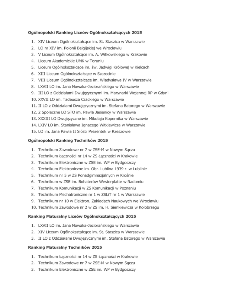 Ogólnopolski Ranking Liceów Ogólnokształcących 2015 1. XIV Liceum Ogólnokształcące im. St. Staszica w Warszawie 2. LO nr XIV im. Polonii Belgijskiej we Wrocławiu 3. V Liceum Ogólnokształcące im. A. Witkowskiego w Krakowie 4. Liceum Akademickie UMK w Toruniu 5. Liceum Ogólnokształcące im. św. Jadwigi Królowej w Kielcach 6. XIII Liceum Ogólnokształcące w Szczecinie 7. VIII Liceum Ogólnokształcące im. Władysława IV w Warszawie 8. LXVII LO im. Jana Nowaka-Jeziorańskiego w Warszawie 9. III LO z Oddziałami Dwujęzycznymi im. Marynarki Wojennej RP w Gdyni 10. XXVII LO im. Tadeusza Czackiego w Warszawie 11. II LO z Oddziałami Dwujęzycznymi im. Stefana Batorego w Warszawie 12. 2 Społeczne LO STO im. Pawła Jasienicy w Warszawie 13. XXXIII LO Dwujęzyczne im. Mikołaja Kopernika w Warszawie 14. LXIV LO im. Stanisława Ignacego Witkiewicza w Warszawie 15. LO im. Jana Pawła II Sióstr Prezentek w Rzeszowie Ogólnopolski Ranking Techników 2015 1. Technikum Zawodowe nr 7 w ZSE-M w Nowym Sączu 2. Technikum Łączności nr 14 w ZS Łączności w Krakowie 3. Technikum Elektroniczne w ZSE im. WP w Bydgoszczy 4. Technikum Elektroniczne im. Obr. Lublina 1939 r. w Lublinie 5. Technikum nr 5 w ZS Ponadgimnazjalnych w Krośnie 6. Technikum w ZSE im. Bohaterów Westerplatte w Radomiu 7. Technikum Komunikacji w ZS Komunikacji w Poznaniu 8. Technikum Mechatroniczne nr 1 w ZSLiT nr 1 w Warszawie 9. Technikum nr 10 w Elektron. Zakładach Naukowych we Wrocławiu 10. Technikum Zawodowe nr 2 w ZS im. H. Sienkiewicza w Kołobrzegu Ranking Maturalny Liceów Ogólnokształcących 2015 1. LXVII LO im. Jana Nowaka-Jeziorańskiego w Warszawie 2. XIV Liceum Ogólnokształcące im. St. Staszica w Warszawie 3. II LO z Oddziałami Dwujęzycznymi im. Stefana Batorego w Warszawie Ranking Maturalny Techników 2015 1. Technikum Łączności nr 14 w ZS Łączności w Krakowie 2. Technikum Zawodowe nr 7 w ZSE-M w Nowym Sączu 3. Technikum Elektroniczne w ZSE im. WP w Bydgoszczy Ranking Olimpijski 2015 1. V Liceum Ogólnokształcące im. A. Witkowskiego w Krakowie 2. LO nr XIV im. Polonii Belgijskiej we Wrocławiu 3. XIV Liceum Ogólnokształcące im. St. Staszica w Warszawie Ranking Egzaminów Zawodowych 2015 1. Technikum Terenów Zieleni w PSBiG w Lublinie 2. Technikum Zawodowe nr 7 w ZSE-M w Nowym Sączu 3. Technikum Elektroniczne im. Obr. Lublina 1939 r. w Lublinie Najlepsze licea ogólnokształcące i technika w województwach 2015 dolnośląskie LO nr XIV im. Polonii Belgijskiej we Wrocławiu Technikum nr 10 w Elektron. Zakładach Naukowych we Wrocławiu kujawsko-pomorskie Liceum Akademickie UMK w Toruniu Technikum Elektroniczne w ZSE im. WP w Bydgoszczy lubelskie I Liceum Ogólnokształcące im. Stanisława Staszica w Lublinie Technikum Elektroniczne im. Obr. Lublina 1939 r. w Lublinie lubuskie II LO im. Marii Skłodowskiej-Curie w Gorzowie Wlkp. Technikum nr 3 w ZS Ekonomicznych w Żarach łódzkie I Liceum Ogólnokształcące im. M. Kopernika w Łodzi Technikum nr 10 w ZSP nr 10 im. Jana Szczepanika w Łodzi małopolskie V Liceum Ogólnokształcące im. A. Witkowskiego w Krakowie Technikum Zawodowe nr 7 w ZSE-M w Nowym Sączu mazowieckie XIV Liceum Ogólnokształcące im. St. Staszica w Warszawie Technikum w ZSE im. Bohaterów Westerplatte w Radomiu opolskie PLO nr III z Oddziałami Dwujęzycznymi im. M. Skłodowskiej-Curie w Opolu Publiczne Technikum nr 5 w ZSE im. T. Kościuszki w Opolu podkarpackie LO im. Jana Pawła II Sióstr Prezentek w Rzeszowie Technikum nr 5 w ZS Ponadgimnazjalnych w Krośnie podlaskie I Liceum Ogólnokształcące im. Adama Mickiewicza w Białymstoku Technikum Elektryczne w ZS Elektrycznych w Białymstoku pomorskie III LO z Oddziałami Dwujęzycznymi im. Marynarki Wojennej RP w Gdyni Technikum Leśne w ZSL im. prof. St. Sokołowskiego w Warcinie śląskie V Liceum Ogólnokształcące w Bielsku-Białej Technikum nr 17 w ŚTZN w Katowicach świętokrzyskie Liceum Ogólnokształcące im. św. Jadwigi Królowej w Kielcach Technikum Leśne im. Romana Gesinga w Zagnańsku warmińsko-mazurskie II LO im. Konstantego Ildefonsa Gałczyńskiego w Olsztynie Technikum nr 8 w ZS Chemicznych i Ogólnokształcących w Olsztynie wielkopolskie XVI LO z Oddziałami Dwujęzycznymi im. Charlesa de Gaulle'a w Poznaniu Technikum Komunikacji w ZS Komunikacji w Poznaniu zachodniopomorskie XIII Liceum Ogólnokształcące w Szczecinie Technikum Zawodowe nr 2 w ZS im. H. Sienkiewicza w Kołobrzegu Ranking opublikowany został 14 stycznia 2015 roku równocześnie na łamach miesięcznika Perspektywy oraz na portalu www.perspektywy.pl.
