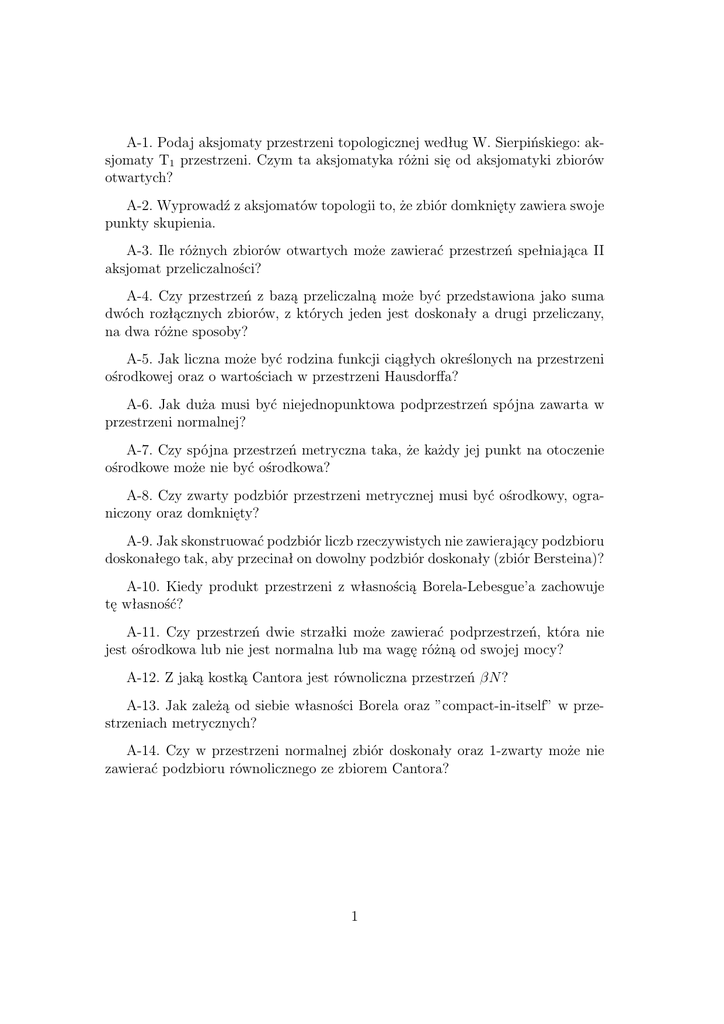 A-1. Podaj aksjomaty przestrzeni topologicznej według W. Sierpińskiego: aksjomaty T1 przestrzeni. Czym ta aksjomatyka różni się od aksjomatyki zbiorów otwartych? A-2. Wyprowadź z aksjomatów topologii to, że zbiór domknięty zawiera swoje punkty skupienia. A-3. Ile różnych zbiorów otwartych może zawierać przestrzeń spełniająca II aksjomat przeliczalności? A-4. Czy przestrzeń z bazą przeliczalną może być przedstawiona jako suma dwóch rozłącznych zbiorów, z których jeden jest doskonały a drugi przeliczany, na dwa różne sposoby? A-5. Jak liczna może być rodzina funkcji ciągłych określonych na przestrzeni ośrodkowej oraz o wartościach w przestrzeni Hausdorffa? A-6. Jak duża musi być niejednopunktowa podprzestrzeń spójna zawarta w przestrzeni normalnej? A-7. Czy spójna przestrzeń metryczna taka, że każdy jej punkt na otoczenie ośrodkowe może nie być ośrodkowa? A-8. Czy zwarty podzbiór przestrzeni metrycznej musi być ośrodkowy, ograniczony oraz domknięty? A-9. Jak skonstruować podzbiór liczb rzeczywistych nie zawierający podzbioru doskonałego tak, aby przecinał on dowolny podzbiór doskonały (zbiór Bersteina)? A-10. Kiedy produkt przestrzeni z własnością Borela-Lebesgue’a zachowuje tę własność? A-11. Czy przestrzeń dwie strzałki może zawierać podprzestrzeń, która nie jest ośrodkowa lub nie jest normalna lub ma wagę różną od swojej mocy? A-12. Z jaką kostką Cantora jest równoliczna przestrzeń βN ? A-13. Jak zależą od siebie własności Borela oraz ”compact-in-itself” w przestrzeniach metrycznych? A-14. Czy w przestrzeni normalnej zbiór doskonały oraz 1-zwarty może nie zawierać podzbioru równolicznego ze zbiorem Cantora? 1 B-1. Podaj aksjomaty zbiorów otwartych i wyprowdź z nich aksjomaty zbiorów domkniętych. B-2. Jak liczna jest rodzina niehomeomorficznych podprzestrzeni liczb rzeczywistych (czy aksjomat wyboru pozwala na sformułowanie wyczerpującej odpowiedzi)? B-3. Czy w przestrzeni z bazą przeliczalną zbiór nieprzeliczalny musi zawierać podzbiór w sobie gęsty? B-4. Dlaczego w przestrzeni z bazą przeliczalną zbiór 1-zwarty jest ”bi-compact”? B-5. Jak liczna może być rodzina funkcji ciągłych określonych na przestrzeni ośrodkowej oraz o wartościach w ośrodkowej przestrzeni Hausdorffa? B-6. Jak duży musi być doskonały oraz 1-zwarty podzbiór zawarty w przestrzeni normalnej? B-7. Dlaczego domknięcie 1-zwartego podzbioru przestrzeni metrycznej jest zbiorem ”bi-compact”? B-8. Czy w przestrzeni metrycznej zbiór punktów skupienia zbioru zwartego musi być zbiorem zwartym oraz ośrodkowym? B-9. Czy przestrzeń normalna może zawierać zbiór doskonały, który nie zawiera dwóch rozłącznych podzbiorów doskonałych? B-10. Czy płaszczyzna Tichonowa jest przestrzenią normalną? B-11. Czy podzbiór domknięty zawarty w zbiorze Cantora jest jego obrazem ciągłym? B-12. Które punkty płaszczyzny nie mają ośrodkowych sąsiedztw, gdy na płaszczyźnie rozważamy metrykę rzeka. B-13. Dlaczego przestrzeń normalną wagi m można zanurzyć w kostkę Tichonowa tej samej wagi? B-14. Czy strzałka jest przestrzenią z pierwszym aksjomatem przeliczalności, ośrodkową, normalną taką, że każda jej podprzestrzeń ma wagę równą swojej mocy? 2 C-1. Podaj aksjomaty zbiorów domkniętych i wyprowdź z nich aksjomaty zbiorów otwartych. C-2. Jak liczna może być przestrzeń (T0 ) spełniająca II aksjomat przeliczalności? C-3. Czy przestrzeń z bazą przeliczalną może zawierać nieprzeliczalną podprzestrzeń rozproszoną? C-4. Czy w przestrzeni spełniającej pierwszy aksjomat przeliczalności zbiór ω- zwarty jest ”bi-compact”? C-5. Jaka jest zależność pomiędzy gęstością a mocą przestrzeni Hausdorffa? C-6. Uzasadnij lemat Urysohna. C-7. Jak duży musi być 1-zwarty podzbiór doskonały zawarty w przestrzeni normalnej? C-8. Czy przestrzeń metryczna z bazę przeliczalną lub taka, że dowolna rodzina jej podzbiorów otwartych rozłącznych jest przeliczalna musi być ośrodkowa? C-9. Czy liczby rzeczywiste to przestrzeń zwarta lub przestrzeń zawierająca dowolną przestrzeń metryczną ośrodkową z bazą złożoną ze zbiorów domkniętych i otwartych jednocześnie? C-10. Dlaczego przestrzeń Hilberta l2 jest przestrzenią metryczną? C-11. Czy przestrzeń metryczna, przeliczalna i w sobie gęsta jest homeomorficzna z liczbami wymiernymi? C-12. Czy płaszczyzna Niemytzkiego jest przestrzenią, która nie jest normalna lub jest zwarta? C-13. Czy w przestrzeni regularnej zbiór doskonały zawsze zawiera podzbiory doskonałe rozłączne? C-14. Czy kwadrat leksykograficzny jest przestrzenią ”bi-compact”, spełniającą I aksjomat przeliczalności oraz zawierającą 2ω podzbiorów otwartych rozłącznych? 3 D-1. Podaj aksjomaty zbiorów domkniętych i wyprowdź z nich aksjomaty wnętrza zbioru. D-2. Kiedy baza przestrzeni topologicznej zawiera bazę mocy wagi tej przestrzeni (czy aksjomat wyboru pozwala na sformułowanie wyczerpującej odpowiedzi)? D-3. Uzasadnij twierdzenie Cantora o zstępującym ciągu ω-zwartych zbiorów domkniętych. D-4. Czy w przestrzeni Hausdorffa ciąg zbieżny może mieć wielopunktową granicę? Podaj przykład przestrzeni, w której są ciągi z wielopunktowymi granicami. D-5. Dlaczego nieskończona przestrzeń Hausdorffa zawiera nieskończenie wiele rozłącznych podzbiorów otwartych? D-6. Dlaczego w normalnej przestrzeni z bazą przeliczalną każdy nieprzeliczalny oraz 1-zwarty podzbiór jest równoliczny ze zbiorem Cantora? D-7. Jakiej mocy mogą być zbiory z własnością Borela-Lebesgue’a zawarte w przestrzeni normalnej z bazą przeliczalną? D-8. Czy dowolne dwa punkty w metrycznej przestrzenie spójnej można połączyć ε-łańcuchem? D-9. Jak zależą od siebie wagi dziedziny oraz obrazu funkcji ciągłej, gdy obraz jest przestrzenią Hausdorffa z własnością Borela-Lebesgue’a? D-10. Dlaczego w βN nie m