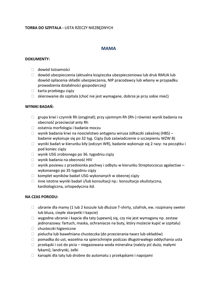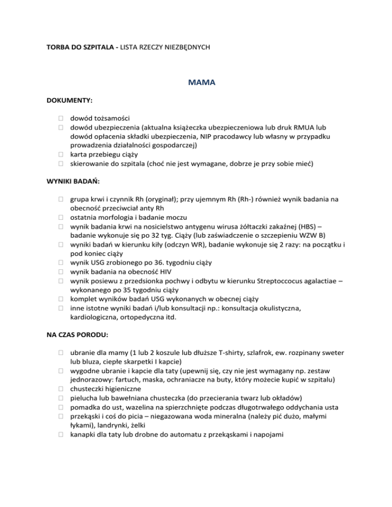 TORBA DO SZPITALA - LISTA RZECZY NIEZBĘDNYCH MAMA DOKUMENTY: dowód tożsamości dowód ubezpieczenia (aktualna książeczka ubezpieczeniowa lub druk RMUA lub dowód opłacenia składki ubezpieczenia, NIP pracodawcy lub własny w przypadku prowadzenia działalności gospodarczej) karta przebiegu ciąży skierowanie do szpitala (choć nie jest wymagane, dobrze je przy sobie mieć) WYNIKI BADAŃ: grupa krwi i czynnik Rh (oryginał); przy ujemnym Rh (Rh-) również wynik badania na obecność przeciwciał anty Rh ostatnia morfologia i badanie moczu wynik badania krwi na nosicielstwo antygenu wirusa żółtaczki zakaźnej (HBS) – badanie wykonuje się po 32 tyg. Ciąży (lub zaświadczenie o szczepieniu WZW B) wyniki badań w kierunku kiły (odczyn WR), badanie wykonuje się 2 razy: na początku i pod koniec ciąży wynik USG zrobionego po 36. tygodniu ciąży wynik badania na obecność HIV wynik posiewu z przedsionka pochwy i odbytu w kierunku Streptoccocus agalactiae – wykonanego po 35 tygodniu ciąży komplet wyników badań USG wykonanych w obecnej ciąży inne istotne wyniki badań i/lub konsultacji np.: konsultacja okulistyczna, kardiologiczna, ortopedyczna itd. NA CZAS PORODU: ubranie dla mamy (1 lub 2 koszule lub dłuższe T-shirty, szlafrok, ew. rozpinany sweter lub bluza, ciepłe skarpetki I kapcie) wygodne ubranie i kapcie dla taty (upewnij się, czy nie jest wymagany np. zestaw jednorazowy: fartuch, maska, ochraniacze na buty, który możecie kupić w szpitalu) chusteczki higieniczne pielucha lub bawełniana chusteczka (do przecierania twarz lub okładów) pomadka do ust, wazelina na spierzchnięte podczas długotrwałego oddychania usta przekąski i coś do picia – niegazowana woda mineralna (należy pić dużo, małymi łykami), landrynki, żelki kanapki dla taty lub drobne do automatu z przekąskami i napojami PO PORODZIE: wygodna koszula do karmienia 6 par majtek (z siateczki lub jednorazowe) kosmetyki i przybory toaletowe klapki pod prysznic 2 ręczniki 20 poporodowych dużych podpasek (np. Bella) podkłady poporodowe (zapytaj, czy są na wyposażeniu sali, czy powinnaś kupić ) ręczniki papierowe, papier toaletowy poduszka do karmienia 2 staniki do karmienia i wkładki laktacyjne telefon komórkowy i ładowarka MALUSZEK pieluszki „1” lub newborn dla wcześniaków 10 pieluch tetrowych 3 bawełniane koszulki lub kaftaniki 3 pary body 2 bawełniane cienkie czapeczki i jedna cieplejsza, bez troczków 3 pajacyki i 3 pary śpiochów 2 pary skarpetek i rękawiczki niedrapki kosmetyki (zapytaj w szpitalu, w którym zamierzasz rodzić co będzie potrzebne; w niektórych szpitalach są ogólnie dostępne zarówno mokre chusteczki jak i krem do pupy, czy żel do mycia ciała i włosów ) mokre chusteczki szczoteczka do włosów ręcznik kąpielowy z kapturem kocyk lub śpiworek Pamiętaj aby spakować tylko niezbędne rzeczy, a jeśli o czymś zapomnisz to tata zdąży dowieść lub kupić w szpitalu POWRÓT DO DOMU: Niżej wymienione rzeczy tata lub inna osoba towarzysząca przywozi dopiero w dniu planowanego wypisu. luźniejsze ubranie dla mamy ubranko dla dziecka – odpowiednie do pogody krem do buzi dla Maluszka fotelik samochodowy