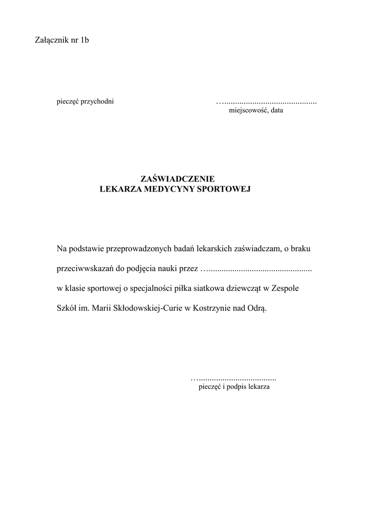Załącznik nr 1b pieczęć przychodni …........................................... miejscowość, data ZAŚWIADCZENIE LEKARZA MEDYCYNY SPORTOWEJ Na podstawie przeprowadzonych badań lekarskich zaświadczam, o braku przeciwwskazań do podjęcia nauki przez …................................................ w klasie sportowej o specjalności piłka siatkowa dziewcząt w Zespole Szkół im. Marii Skłodowskiej-Curie w Kostrzynie nad Odrą. ….................................... pieczęć i podpis lekarza