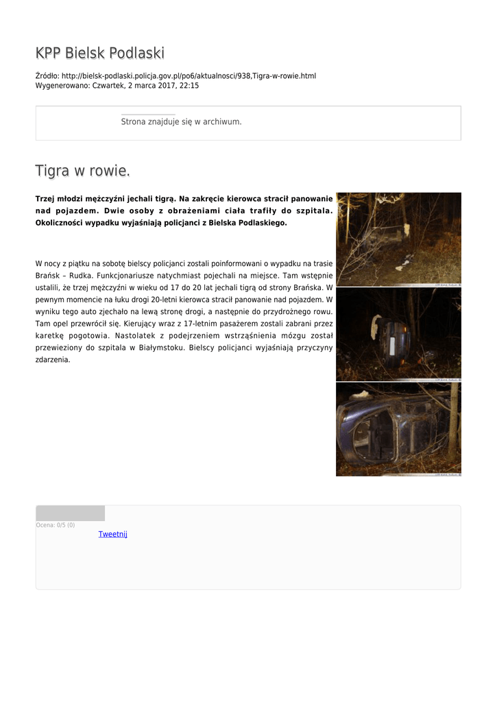 KPP Bielsk Podlaski Źródło: http://bielsk-podlaski.policja.gov.pl/po6/aktualnosci/938,Tigra-w-rowie.html Wygenerowano: Czwartek, 2 marca 2017, 22:15 Strona znajduje się w archiwum. Tigra w rowie. Trzej młodzi mężczyźni jechali tigrą. Na zakręcie kierowca stracił panowanie nad pojazdem. Dwie osoby z obrażeniami ciała trafiły do szpitala. Okoliczności wypadku wyjaśniają policjanci z Bielska Podlaskiego. W nocy z piątku na sobotę bielscy policjanci zostali poinformowani o wypadku na trasie Brańsk – Rudka. Funkcjonariusze natychmiast pojechali na miejsce. Tam wstępnie ustalili, że trzej mężczyźni w wieku od 17 do 20 lat jechali tigrą od strony Brańska. W pewnym momencie na łuku drogi 20-letni kierowca stracił panowanie nad pojazdem. W wyniku tego auto zjechało na lewą stronę drogi, a następnie do przydrożnego rowu. Tam opel przewrócił się. Kierujący wraz z 17-letnim pasażerem zostali zabrani przez karetkę pogotowia. Nastolatek z podejrzeniem wstrząśnienia mózgu został przewieziony do szpitala w Białymstoku. Bielscy policjanci wyjaśniają przyczyny zdarzenia. Ocena: 0/5 (0) Tweetnij