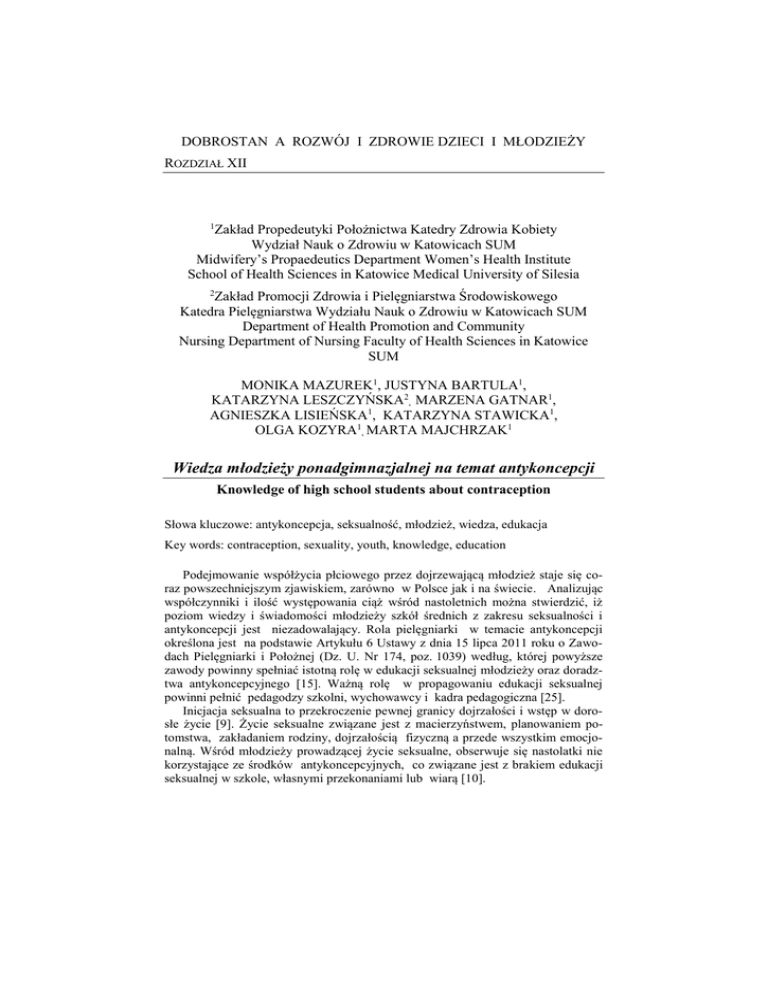 DOBROSTAN A ROZWÓJ I ZDROWIE DZIECI I MŁODZIEŻY ROZDZIAŁ XII Zakład Propedeutyki Położnictwa Katedry Zdrowia Kobiety Wydział Nauk o Zdrowiu w Katowicach SUM Midwifery’s Propaedeutics Department Women’s Health Institute School of Health Sciences in Katowice Medical University of Silesia 1 Zakład Promocji Zdrowia i Pielęgniarstwa Środowiskowego Katedra Pielęgniarstwa Wydziału Nauk o Zdrowiu w Katowicach SUM Department of Health Promotion and Community Nursing Department of Nursing Faculty of Health Sciences in Katowice SUM 2 MONIKA MAZUREK1, JUSTYNA BARTULA1, KATARZYNA LESZCZYŃSKA2, MARZENA GATNAR1, AGNIESZKA LISIEŃSKA1, KATARZYNA STAWICKA1, OLGA KOZYRA1, MARTA MAJCHRZAK1 Wiedza młodzieży ponadgimnazjalnej na temat antykoncepcji Knowledge of high school students about contraception Słowa kluczowe: antykoncepcja, seksualność, młodzież, wiedza, edukacja Key words: contraception, sexuality, youth, knowledge, education Podejmowanie współżycia płciowego przez dojrzewającą młodzież staje się coraz powszechniejszym zjawiskiem, zarówno w Polsce jak i na świecie. Analizując współczynniki i ilość występowania ciąż wśród nastoletnich można stwierdzić, iż poziom wiedzy i świadomości młodzieży szkół średnich z zakresu seksualności i antykoncepcji jest niezadowalający. Rola pielęgniarki w temacie antykoncepcji określona jest na podstawie Artykułu 6 Ustawy z dnia 15 lipca 2011 roku o Zawodach Pielęgniarki i Położnej (Dz. U. Nr 174, poz. 1039) według, której powyższe zawody powinny spełniać istotną rolę w edukacji seksualnej młodzieży oraz doradztwa antykoncepcyjnego [15]. Ważną rolę w propagowaniu edukacji seksualnej powinni pełnić pedagodzy szkolni, wychowawcy i kadra pedagogiczna [25]. Inicjacja seksualna to przekroczenie pewnej granicy dojrzałości i wstęp w dorosłe życie [9]. Życie seksualne związane jest z macierzyństwem, planowaniem potomstwa, zakładaniem rodziny, dojrzałością fizyczną a przede wszystkim emocjonalną. Wśród młodzieży prowadzącej życie seksualne, obserwuje się nastolatki nie korzystające ze środków antykoncepcyjnych, co związane jest z brakiem edukacji seksualnej w szkole, własnymi przekonaniami lub wiarą [10]. DOBROSTAN A ROZWÓJ I ZDROWIE DZIECI I MŁODZIEŻY Według raportu opublikowanego przez Światową Organizację Zdrowia ( WHO) z okazji Międzynarodowego Dnia Kobiet 8 marca 2014 roku, należy zwiększyć działania mające na celu promowanie antykoncepcji i dostępność do środków zapobiegających nieplanowanej ciąży [7, 17. 19]. Celem pracy była ocena wiedzy młodzieży szkół ponadgimnazjalnych na temat antykoncepcji. Cele szczegółowe dotyczyły oceny wiedzy uczniów szkół średnich na temat podstawowych wiadomości o fizjologii rozrodu, dostępnych metodach i środkach antykoncepcyjnych, ich skuteczności oraz źródłach wiedzy o antykoncepcji. MATERIAŁ I METODY Badanie zostało przeprowadzane w okresie od grudnia 2013 roku do stycznia 2014 roku w wybranych szkołach ponadgimnazjalnych powiatu Oświęcimskiego. Badana grupa liczyła 600 losowo wybranych uczniów. Kryteriami włączenia do badań było uzyskanie zgody Dyrekcji szkół ponadgimnazjalnych na przeprowadzenie badań, ukończenie 18 roku życia przez respondentów oraz dobrowolnie wyrażona chęć wypełnienia kwestionariusza. Kryteriami wyłączenia z badania był brak uzyskanej zgody na przeprowadzenie badań, wiek poniżej 18 roku życia oraz brak zgody na wypełnienie kwestionariusza. Młodzież uczestnicząca w badaniu rekrutowała się z trzech typów szkół: Liceum Ogólnokształcącego (33,33% uczniów), Technikum (33,33%uczniów) oraz Zasadniczej Szkoły Zawodowej (33,33% uczniów). Wśród badanej młodzieży było 300 dziewcząt (50%) i 300 chłopców (50%). W pracy wykorzystano autorski kwestionariusz ankiety zawierający 25 pytań o charakterze zamkniętym i półotwartym. Kwestionariusz składał się z dwóch części. Pierwsza część ankiety dotyczyła danych społeczno-demograficznych, druga zawierała pytania specjalistyczne dotyczące fizjologii cyklu płciowego oraz antykoncepcji. Udział w badaniu był dobrowolny i anonimowy. Analizy uzyskanych wyników badań dokonano w programie Microsoft Office Excel z wykorzystaniem arkuszy kalkulacyjnych. Wyniki zostały przedstawione w formie wykresów i tabel. WYNIKI Większość respondentów stanowiła młodzież w wieku pomiędzy 18 a 19 rokiem życia (69%). Ankietowani reprezentowali trzy typy szkół ponadgimnazjalnych: Liceum Ogólnokształcące (33,33%), Technikum (33,33%) oraz Zasadniczą Szkołę Zawodową (33,33%). Badana grupa była niejednorodna pod względem płci (50,0% uczennice oraz 50,0% uczniowie). 184 Monika Mazurek, Justyna Bartula, Katarzyna Leszczyńska, Marzena Gatnar, Agnieszka Lisieńska, Katarzyna Stawicka, Olga Kozyra, Marta Majchrzak Wiedza młodzieży ponadgimnazjalnej na temat antykoncepcji Rycina 1. Definicja cyklu płciowego (n= 600) Uczennice (91%) i uczniowie (92%) wykazali się prawidłową znajomością definicji cyklu płciowego, określając go jako powtarzające się regularnie zmiany w organizmie kobiety, zachodzące w ustalonym rytmie biologicznym pod wpływem współdziałania układu nerwowo-hormonalnego, związane z dojrzewaniem i wydalaniem komórki jajowej ( owulacją). Rycina 2. Definicja terminu owulacja (n= 600) 185 DOBROSTAN A ROZWÓJ I ZDROWIE DZIECI I MŁODZIEŻY Nie stwierdzono różnicy ze względu na płeć ankietowanych z zakresu znajomości definicji owulacji. Zarówno respondentki (94%) jak i respondenci (90%) posiadali wiedzę na dany temat i udzielali prawidłowych odpowiedzi. Rycina 3. Definicja antykoncepcji (n= 600) Zdecydowana większość uczennic (100%) oraz uczniów (97%) definiowała pojęcie antykoncepcji jako zbiór metod lub środków służących zapobieganiu ciąży. Tabela I. Źródła wiedzy na temat antykoncepcji, można wskazać kilka odpowiedzi jednocześn