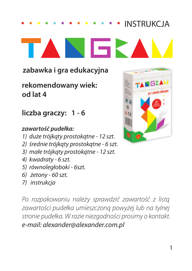 INSTRUKCJA zabawka i gra edukacyjna rekomendowany wiek: od lat 4 liczba graczy: 1 - 6 zawartość pudełka: 1) duże trójkąty prostokątne - 12 szt. 2) średnie trójkąty prostokątne - 6 szt. 3) małe trójkąty prostokątne - 12 szt. 4) kwadraty - 6 szt. 5) równoległoboki - 6szt. 6) żetony - 60 szt. 7) instrukcja Po rozpakowaniu należy sprawdzić zawartość z listą zawartości pudełka umieszczoną powyżej lub na tylnej stronie pudełka. W razie niezgodności prosimy o kontakt. e-mail: [email protected] 1 Zasady bezpiecznego użytkowania: Ostrzeżenia: Nieodpowiednie dla dzieci w wieku poniżej 3 lat. Zestaw zawiera małe elementy - niebezpieczeństwo zadławienia. Prosimy zachować opakowanie ze względu na podane informacje. Opakowanie nie jest częścią zabawki. Stan zabawki należy regularnie kontrolować. „Tangram” to chińska łamigłówka znana od ok. 3000 lat. Składa się z siedmiu elementów w postaci figur geometrycznych (tan), powstałych przez rozcięcie kwadratu. Celem łamigłówki jest odtworzenie położenia wszystkich siedmiu elementów tangramu w przedstawionym obrazku na podstawie jedynie kształtu jego konturów, a także wymyślanie własnych wzorów. rys.1 komplet figur 2 Wariant gry nr 1: Każdy gracz bierze po jednym komplecie figur, tak aby miał wszystkie 7 kolorów (rys. 1, str.2). Następnie należy otworzyć instrukcję na str. 5 - z sylwetami wzorów do ułożenia. Wzory muszą być widoczne dla każdego z graczy. Na umówiony sygnał, gracze układają ze swoich figur pierwszą sylwetkę (wzór) z instrukcji. Ten kto pierwszy ułoży wybrany wzór woła STOP! Po sprawdzeniu poprawności ułożonego wzoru z instrukcją, gracz, który zawołał STOP! otrzymuje żeton. Następnie gracze przyglądają się kolejnemu wzorowi i na sygnał starają się ułożyć go jak najszybciej. Gra trwa do momentu, gdy jeden z graczy zdobędzie jako pierwszy 5 żetonów. Ten gracz zostaje zwycięzcą. Wariant gry nr 2 (dla 3 graczy): Przed rozpoczęciem gry należy rozsypać na stole wszystkie elementy i ułożyć je kolorem do dołu. Instrukcję do gry należy położyć tak, by były widoczne wzory (czarne sylwety). Na sygnał gracze starają się ułożyć 2 wzory (w kolejności od str. 5) z przedstawionych w instrukcji, dobierając elementy ze wspólnego zbioru na stole. Ten, kto ułoży pierwszy woła STOP!, a za prawidłowe ułożenie gracz otrzymuje żeton. 3 Gracze układają tak po 2 wzory w kolejności przedstawionych w instrukcji. Gra kończy się, gdy jeden z graczy zdobędzie jako pierwszy 5 żetonów. Ten gracz zostaje zwycięzcą. Wariant gry nr 3: Przed rozpoczęciem gry jej uczestnicy wybierają wzór z instrukcji do ułożenia. Wszyscy gracze układają wspólnie z jednego kompletu elementów wybrany wzór. Po ułożeniu, wzór należy zniszczyć, mieszając jego elementy. Teraz, na sygnał, wszyscy gracze starają się jak najszybciej ułożyć ze swoich elementów układany i zapamiętany wcześniej wzór. Ten, kto zrobi to jako pierwszy woła STOP! Po sprawdzeniu poprawności ułożonego wzoru, gracz który zawołał STOP! otrzymuje żeton. Następnie gracze wybierają kolejny wzór do układania i tok gry się powtarza. Gra kończy się gdy jeden z graczy zdobędzie jako pierwszy 5 żetonów. Ten gracz zostaje zwycięzcą. Zabawa: Z siedmiu kolorowych elementów ułóż wzory pokazane w instrukcji. 4 Wzory do układania: 1. 2. 3. KRÓLIK 4. PIES 5. 6. ŁABĘDŹ 8. KOT 9. 7. RYBA KOŃ 10. CZŁOWIEK 5 11. 12. RAKIETA 14. 13. 15. 16. DOM 2 DOM ŚWIECA 18. 17. 20. 19. WIELBŁĄD KRUK 6 GOŁĄB KRZESŁO 22. 21. ŻÓŁW BĄCZEK ŁÓDKA 23. 24. MIŚ 26. 25. 27. CZŁOWIEK NA KONIU 29. 28. STATEK MUREK 31. 30. LIS CZAJNIK RYBA REKIN PINGWIN 7 Przechowywanie: Produkt należy przechowywać w suchym pomieszczeniu, z dala od źródeł ciepła oraz w oryginalnym opakowaniu. Utylizacja: Po zakończeniu użytkowania usuwać zabawkę w sposób bezpieczny i z dbałością o środowisko. Deklaracja WE: Produkt został oznaczony symbolem CE ponieważ jest zgodny z dyrektywą bezpieczeństwa zabawek. PRODUCENT: Z.P. „ALEXANDER” Piotr Pundzis 80 - 209 CHWASZCZYNO k/GDYNI, UL. TELEWIZYJNA 19 TEL./FAX 58 552 83 70, TEL. 58 552 87 27 Symbol 0-3 oznacza, że zabawka jest nieodpowiednia dla dzieci w wieku poniżej 3 lat. 8