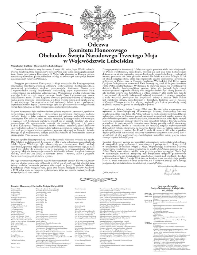 Odezwa Komitetu Honorowego Obchodów Święta Narodowego Trzeciego Maja w Województwie Lubelskim Mieszkańcy Lublina i Województwa Lubelskiego! Dwieście dwadzieścia trzy lata temu, 3 maja 1791 roku, Sejm Wielki uchwalił Ustawę Rządową, która zapisała się w historii Polski jako jedna z jej najpiękniejszych kart. Znana pod nazwą Konstytucja 3 Maja, była pierwszą w Europie ustawą zasadniczą uchwaloną przez parlament i drugą na świecie po konstytucji Stanów Zjednoczonych Ameryki Północnej. Przyjęcie postanowień Konstytucji 3 Maja oznaczało dla Rzeczypospolitej szlacheckiej prawdziwą rewolucję ustrojową - potwierdzenie i kontynuację dzieła gruntownej przebudowy struktur państwowych. Zniesiono liberum veto i wprowadzono zasadę decydowania większością, czym usprawniono Sejm i przywrócono mu zdolności ustawodawcze. Wzmocniono władzę wykonawczą, stawiając króla na czele rządu, zwanego Strażą Praw i wprowadzając zasadę dziedziczności tronu. Ustawa Rządowa stworzyła podwaliny budowy sił zbrojnych, nadała prawa miastom i mieszczanom, a ludność wiejską wzięła pod opiekę prawa i rządu krajowego. Ewenementem w skali światowej, świadczącym o politycznej dojrzałości posłów Sejmu Czteroletniego, było zaś postanowienie o obligatoryjnej rewizji Konstytucji co 25 lat i przeprowadzaniu koniecznych zmian. Majowa Konstytucja była wielkim dziełem polskiej mądrości i otwartości, symbolem nowożytnego prawodawstwa i oświeconego patriotyzmu. Przyniosła nadzieję ocalenia kraju, a jako zwiastun suwerenności państwa, wzbudziła uznanie i entuzjazm. Ów świadek kresu anarchii niszczącej Rzeczypospolitą od wewnątrz i czyniącej zeń bezbronne państwo, zrodził się w sercach Polaków dla dobra powszechnego, dla ugruntowania wolności, dla ocalenia Ojczyzny i jej granic. I choć Konstytucja funkcjonowała krótko, obalona przemocą przez zaborców i przy zdradzie rodzimych przeciwników reform, pozostała w świadomości Polaków jako znak przyszłego odrodzenia państwa, jego mocnej pozycji w Europie i świecie. Dlatego na jej wspomnienie, kolejne pokolenia Polaków ze wzruszeniem śpiewały piękną pieśń: Witaj majowa jutrzenko. Pomimo upadku Rzeczypospolitej i wielu lat niewoli, jutrzenka wolności nie zgasła. Dla Polaków podejmujących heroiczne wysiłki w celu odzyskania niepodległości, dzieło Sejmu Wielkiego było obowiązującym testamentem Polski wolnej, odrodzonej, sprawnie rządzonej i uporządkowanej. Było świadectwem tego, że nasz naród jest zdolny do otrząśnięcia się z marazmu, do przezwyciężenia słabości i prywaty. Majowa Konstytucja stanowiła źródło siły, jedności i mądrości naszego narodu, który jest jak lawa, z wierzchu zimna i twarda, sucha i plugawa, lecz wewnętrznego ognia sto lat nie wyziębi. Do tego testamentu nawiązywali nasi Rodacy wszystkich czasów. Zarówno ci, którzy poprzez zbrojne powstania próbowali wybić się na niepodległość, jak również tacy, którzy nadzieję ratowania państwa dostrzegali w pracy. Przesłanie Majowej Konstytucji trwało wszędzie tam, gdzie żyli Polacy. Przyjęcie Ustawy Rządowej z 1791 roku stało się bowiem wydarzeniem, które na stulecia wytyczyło drogi, którymi podążał nasz naród. Komitet Honorowy Obchodów Święta 3 Maja 2014 Wojciech Wilk Krzysztof Hetman Krzysztof Żuk Jacek Czerniak Jan Łopata Krzysztof Michałkiewicz Marek Poznański Jarosław Żaczek Włodzimierz Karpiński Grzegorz Bierecki Prof. dr hab. Henryk Cioch Jerzy Chróścikowski Dr Grzegorz Czelej Stanisław Gogacz Prof. dr hab. Józef Zając Arkadiusz Bratkowski Prof. dr hab. Zbigniew Zaleski Prof. dr hab. Mirosław Piotrowski Abp prof. dr hab. Stanisław Budzik Bp prof. dr hab. Zbigniew Kiernikowski Bp dr Marian Rojek Bp dr Krzysztof Nitkiewicz Abp Abel Tomasz Zając Piotr Kowalczyk Por. Józef Dzikowski Ryszard Kister Ppłk Henryk Czerkas Płk Władysław Rokicki Zdzisław Badio Danuta Malon Wojewoda Lubelski – Przewodniczący Marszałek Województwa Lubelskiego Prezydent Miasta Lublin Poseł na Sejm RP Poseł na Sejm RP Poseł na Sejm RP Poseł na Sejm RP Poseł na Sejm RP Poseł na Sejm RP Senator RP Senator RP Senator RP Senator RP Senator RP Senator RP Poseł do Parlamentu Europejskiego Poseł do Parlamentu Europejskiego Poseł do Parlamentu Europejskiego Metropolita Lubelski Biskup Siedlecki Biskup Diecezji Zamojsko-Lubaczowskiej Biskup Sandomierski Prawosławny Arcybiskup Lubelsko-Chełmski Przewodniczący Sejmiku Województwa Lubelskiego Przewodniczący Rady Miasta Lublin Prezes Zarządu Oddziału Wojewódzkiego Klubu Kawalerów Orderu Wojennego Virtuti Militari w Lublinie p.o. Prezes Zarządu Okręgu ŚZŻAK w Lublinie Prezes Zarządu Wojewódzkiego Związku Kombatantów RP i Byłych Więźniów Politycznych p.o. Prezesa Zarządu Głównego Stowarzyszenia Byłych Żołnierzy Batalionów Chłopskich Prezes Polskiego Związku Byłych Więźniów Politycznych, Hitlerowskich Więzień i Obozów Koncentracyjnych Prezes Stowarzyszenia Rodzina Katyńska Lublin Henryk Maruszak Zbigniew Małecki Janusz Pawłowski Mieczysław Smalec Dr Bohdan Szucki Bogdan Walas Andrzej Czapski Agata Fisz Marcin Zamoyski Ks. prof. dr hab. Antoni Dębiński Prof. dr hab.n. med. Andrzej Drop Prof. dr hab. inż. Piotr Kacejko Prof. dr hab. Stanisław Michałowski Gen. bryg. pilot dr hab. Jan Rajchel Prof. dr hab. Marian Wesołowski Prof. dr hab. Tomasz Trojanowski Prof. dr hab. Artur Korobowicz Jacek Welter Gen. bryg. pilot Marian Jeleniewski Płk Dariusz Sobotka Płk dypl. Piotr Chudzik Ppłk Andrzej Drozd Insp. Michał Domaradzki Gen. bryg. SG Jarosław Frączyk St. bryg. Tadeusz Milewski Krzysztof Babisz Ilona Skibińska–Fabrowska Dlatego pamięć o Konstytucji 3 Maja nie zgasła pomimo wielu burz dziejowych. W Polsce współczesnej, niepodległej, również nie jest ona tylko historycznym dokumentem, ale stanowi ważny drogowskaz i punkt odniesienia. Jest to tym bardziej istot